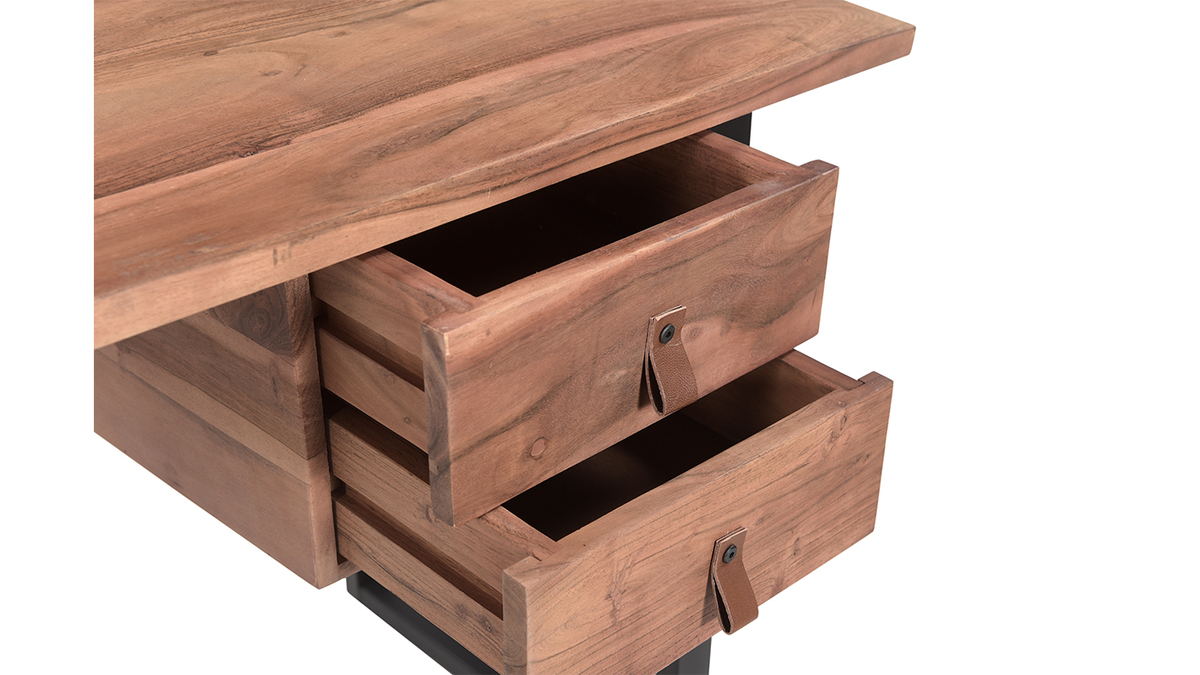 Conçu en bois massif selon des techniques artisanales, ce bureau industriel ne ressemble à aucun autre. C'est une pièce de mobilier solide au charme fou. Grâce aux nuances chaleureuses qu'offrent l'acacia massif, ce bureau réchauffe immédiatement l'ambiance d'un espace de travail. Il associe le bois massif au métal noir, le parfait mix pour une déco cosy aux accents industriels. Les pieds inclinés apportent à l'ensemble un effet aérien et design. On aime particulièrement les détails en cuir des poignées de tiroirs qui donnent du caractère au bureau ! Pour un espace de travail aussi beau que confortable, associez le bureau GINGER à un fauteuil de bureau industriel ou vintage à l'assise agréable.