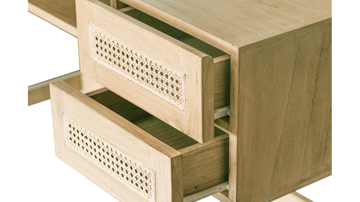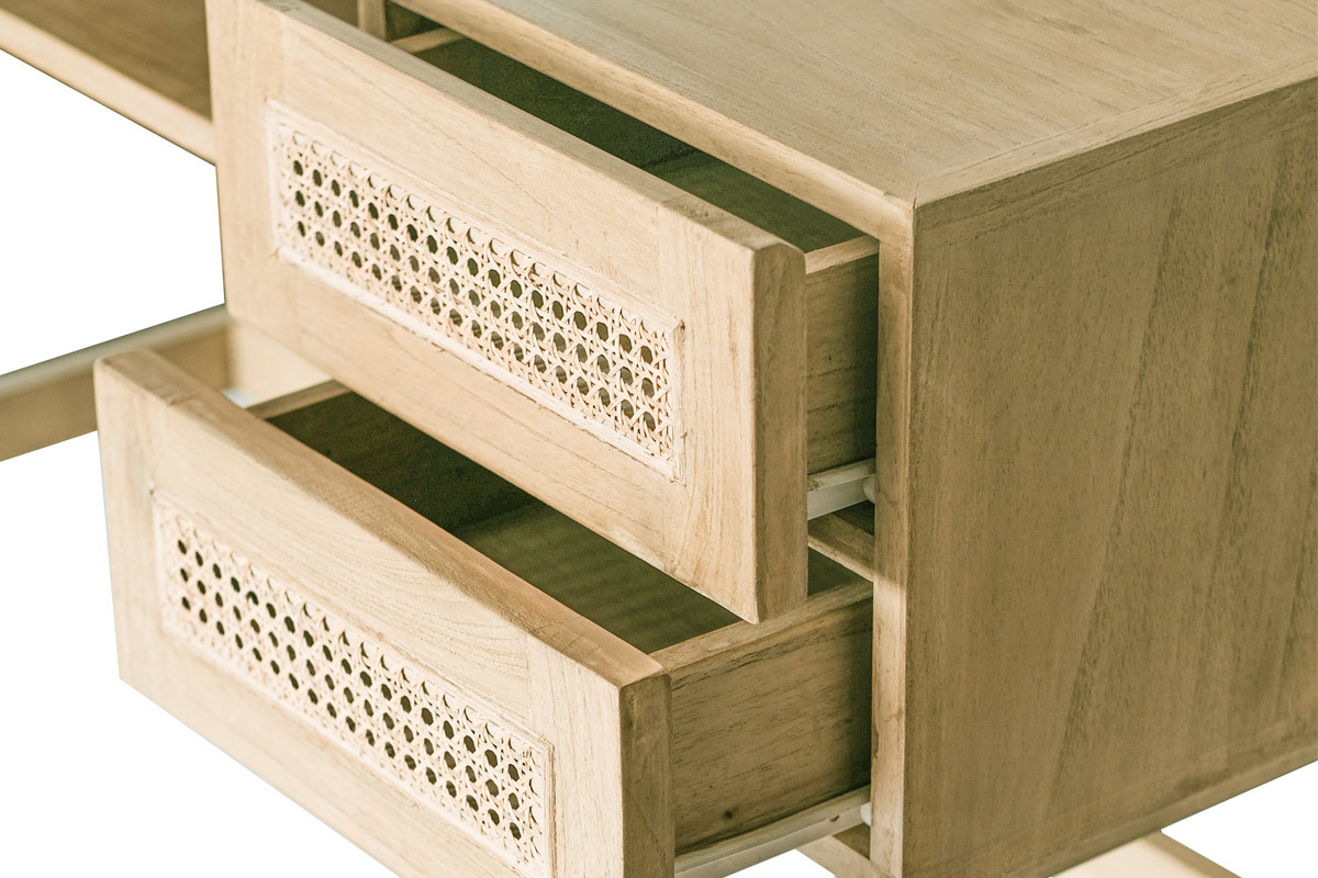 À travers la gamme GALINA, j'ai voulu allier le bois exotique et le cannage pour créer une combinaison harmonieuse. Le bureau GALINA donne une touche chaleureuse et vintage aux intérieurs les plus tendances.