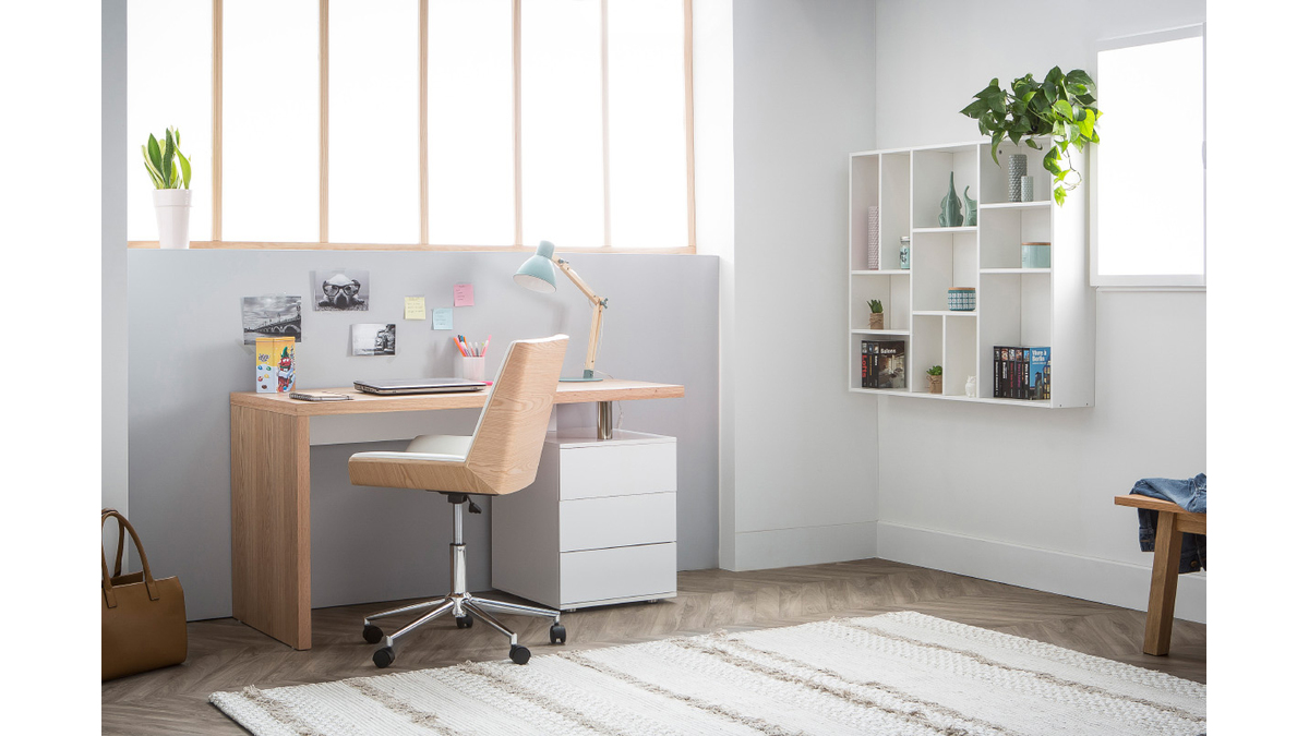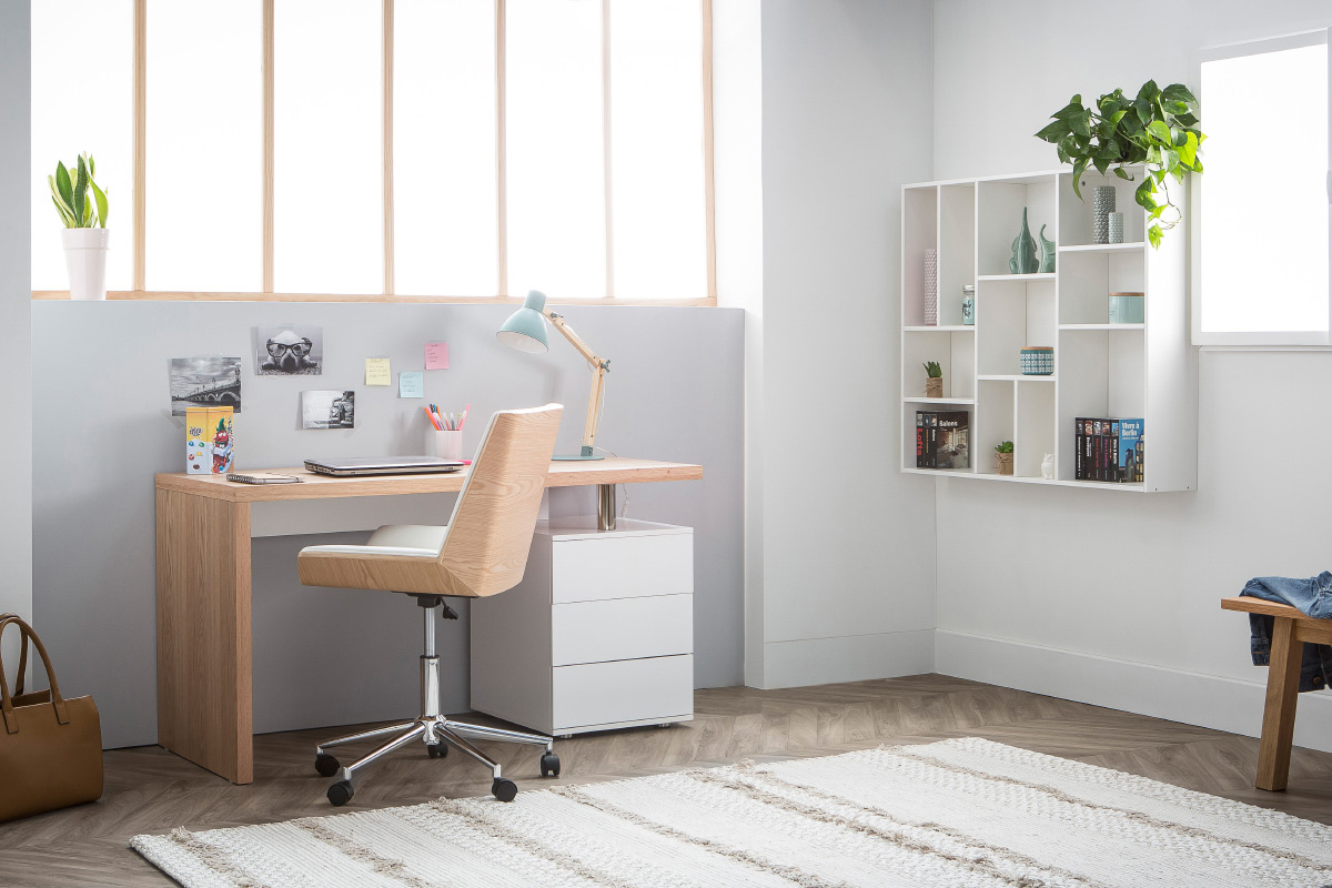 Idéal pour les petits espaces avec son esprit gain de place, il s'associera parfaitement avec une chaise de bureau de style scandinave !