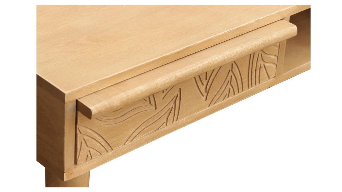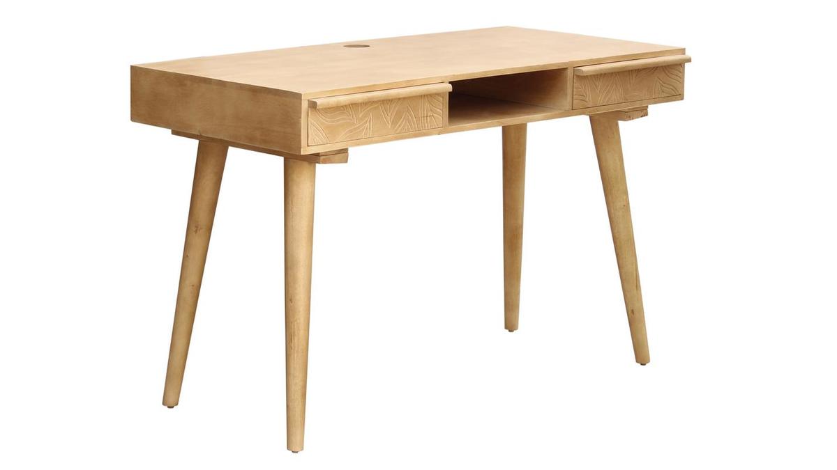 Lignes épurées et élancé piètement, forment ici un charmant duo qui fait écho au design des consoles vintage rétro. Son plateau en bois exotique aux nuances dorées et nervurées est souligné par le détail des gravures au motif des feuillages tropicaux sur les façades des tiroirs. Véritable invitation au dépaysement, ce bureau apportera à coup sûr du cachet et de l'authenticité dans une pièce aux tendances déco ethnique ou bohème.