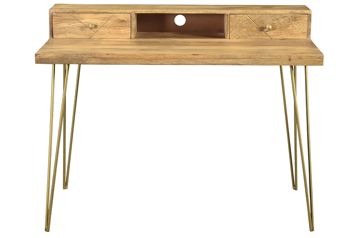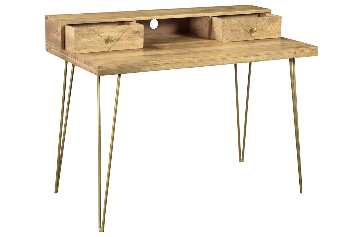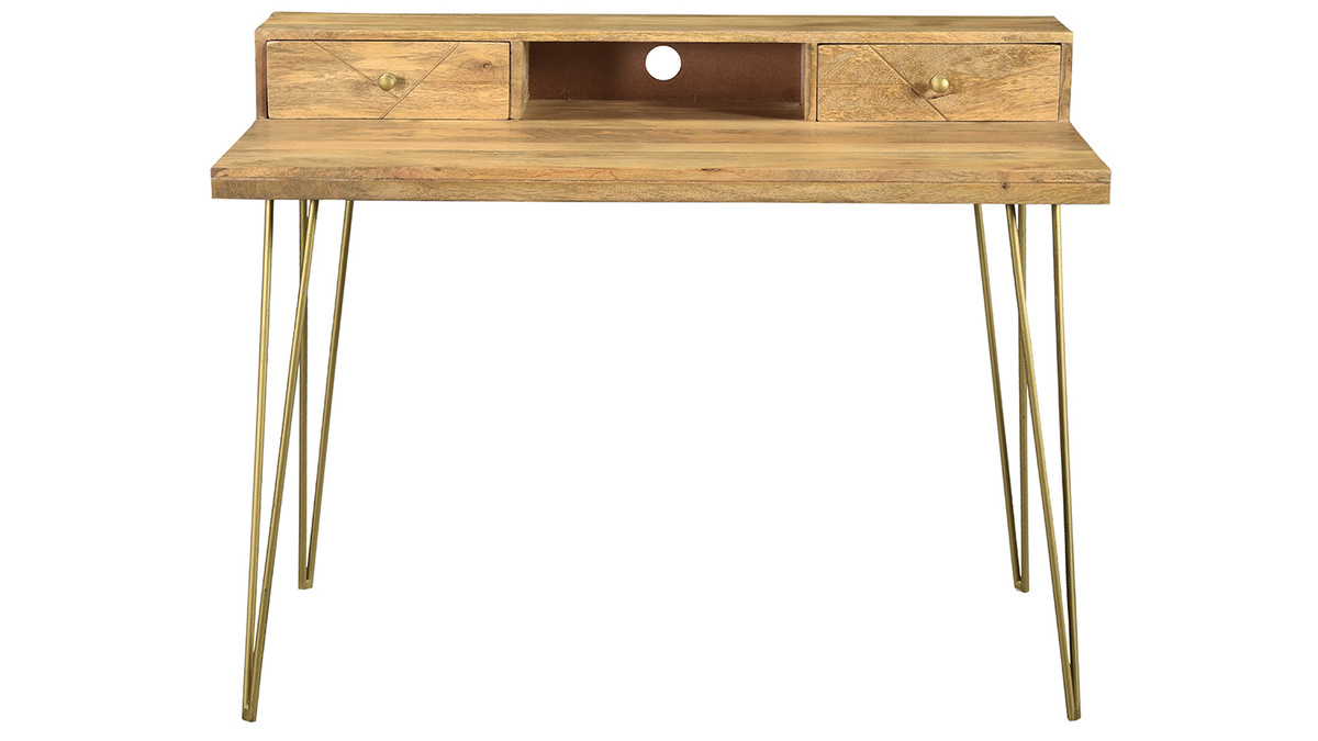 Dessiné par Caroline Marliac, designer Miliboo, le bureau LINIUM est un parfait équilibre entre un magnifique plateau en bois massif et un piètement épingle d'une grande légèreté. On aime l'authenticité de l'un et l'élégance de l'autre. Reliés ensemble par une belle finition dorée que l'on retrouve des pieds aux poignées, ils offrent un rendu raffiné et plein de charme.