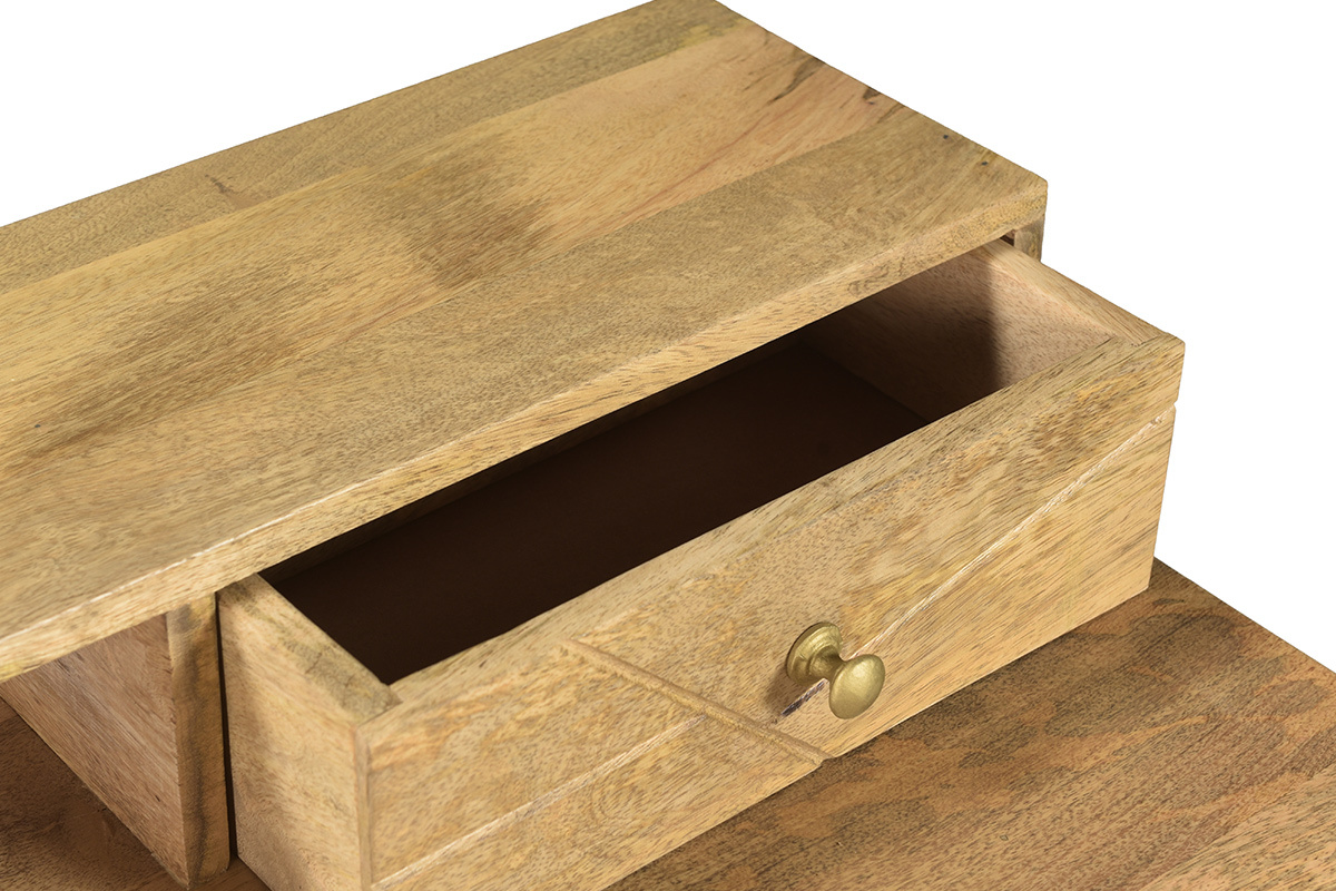 Ce petit bureau travaille son style dans les moindres détails. Si le manguier utilisé pour le plateau apporte de la matière, le joli motif graphique qui orne les tiroirs donne du relief à l'ensemble et une belle touche d'originalité. LINIUM se démarque pour un espace de travail au style unique !