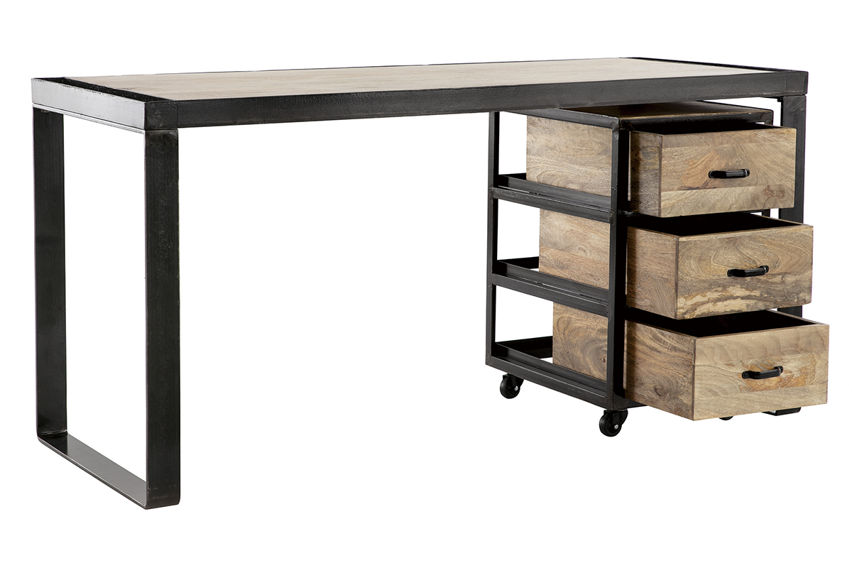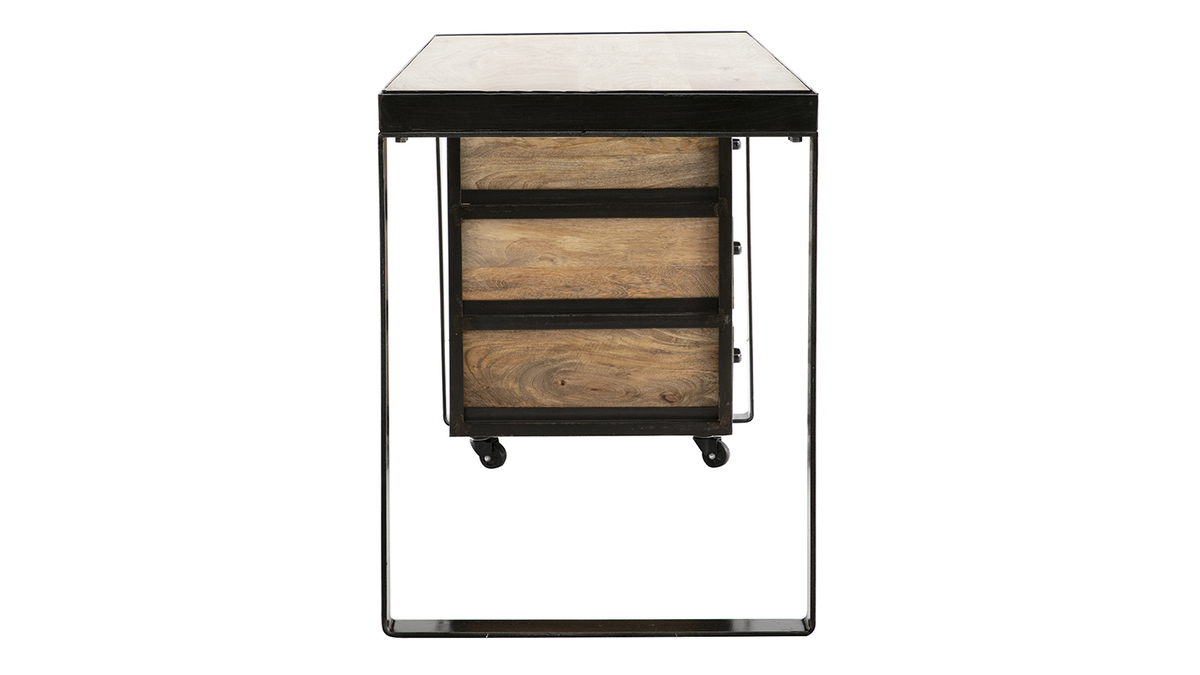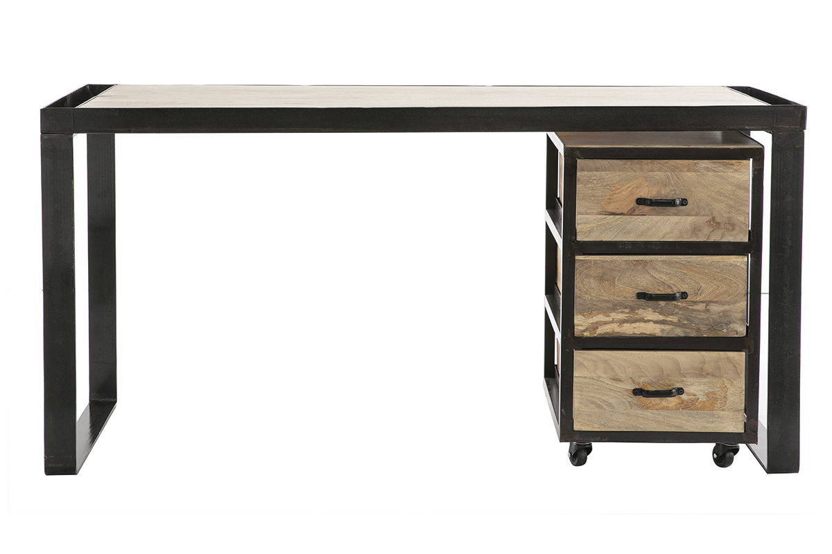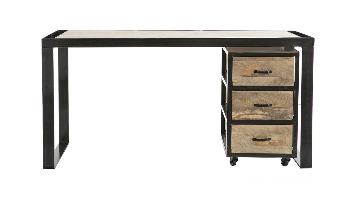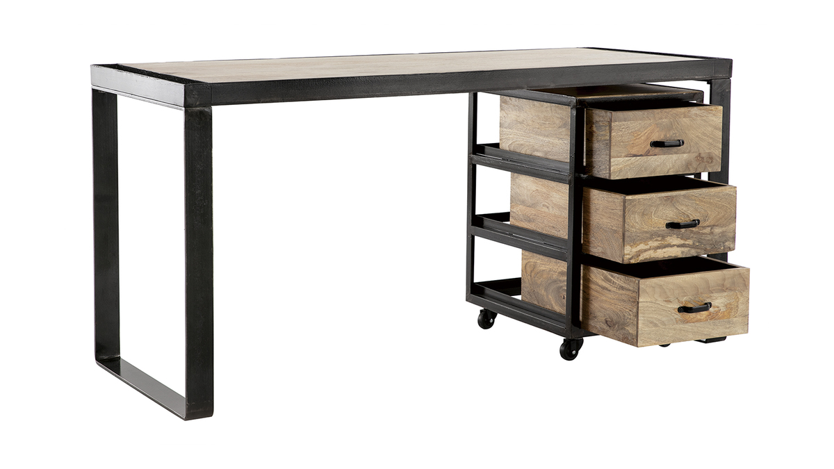 Du style et du charme, le bureau en bois et métal INDUSTRIA n'en manque pas et à ses qualités esthétiques s'ajoute un côté fonctionnel bien pratique ! Cet ensemble est composé d'un bureau et d'un caisson de rangement assorti monté sur roulettes. L'espace rangement est ainsi 100 % mobile afin de s'adapter à chacun. Il est équipé de trois grands tiroirs pour ranger toutes les affaires de travail et libérer le vaste plateau de 156 x 60 cm. Si on a aimé évidemment le côté modulable de ce bureau en bois massif, on apprécie également de profiter de petites niches de rangement directement sur le plateau.