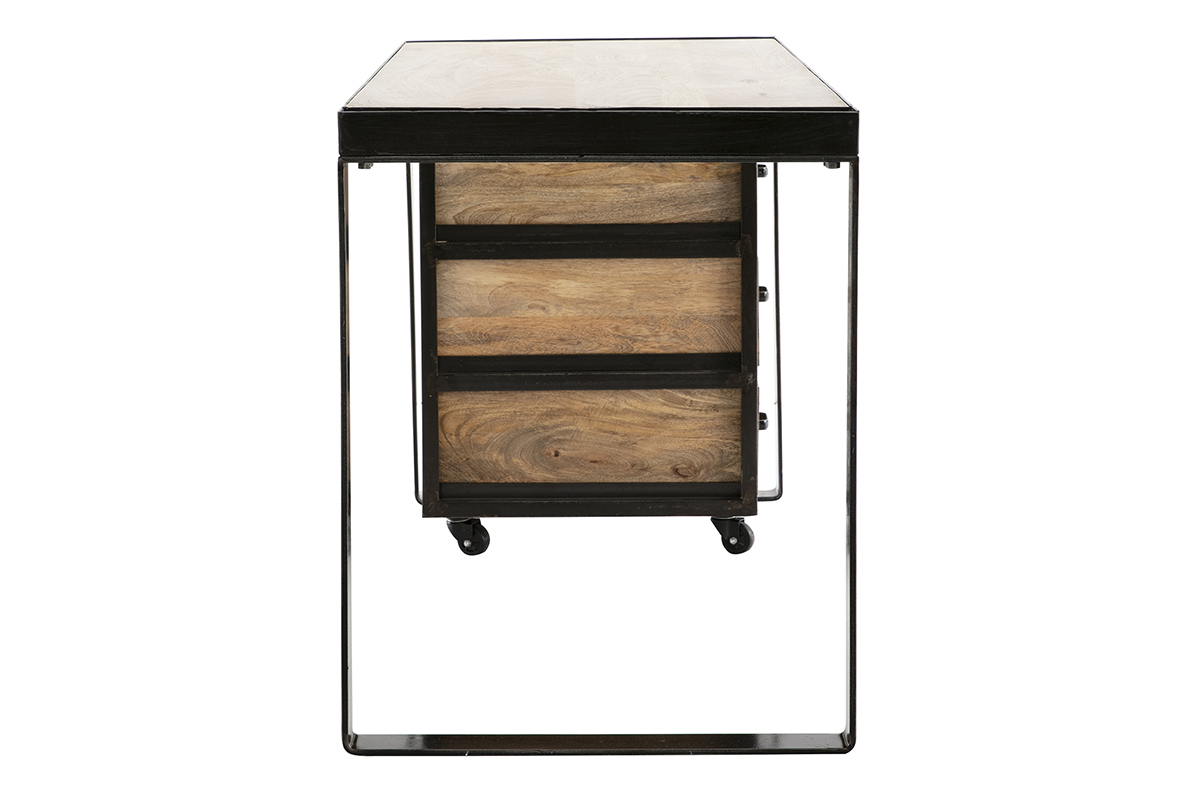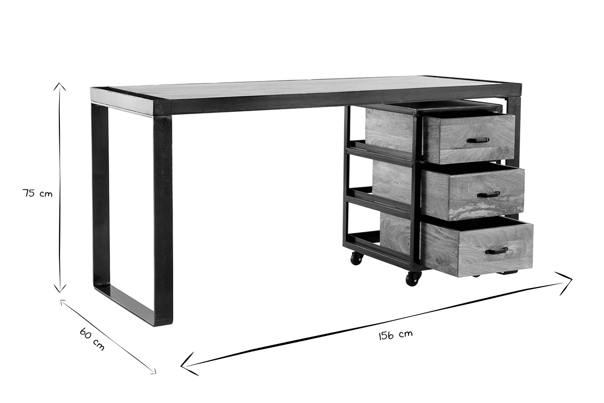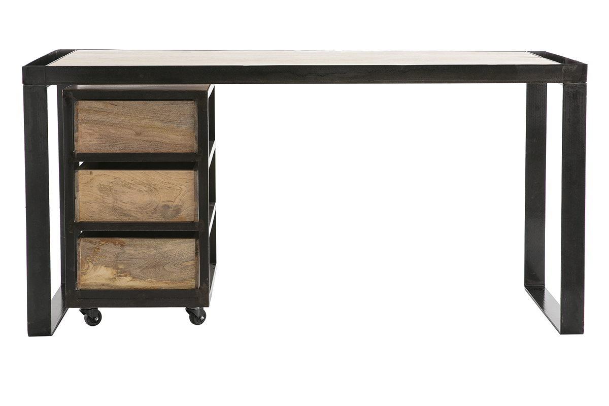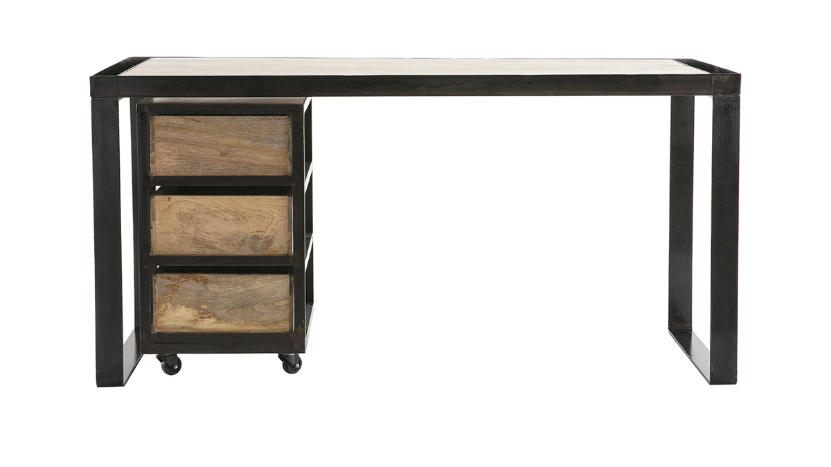 Du style et du charme, le bureau en bois et métal INDUSTRIA n'en manque pas et à ses qualités esthétiques s'ajoute un côté fonctionnel bien pratique ! Cet ensemble est composé d'un bureau et d'un caisson de rangement assorti monté sur roulettes. L'espace rangement est ainsi 100 % mobile afin de s'adapter à chacun. Il est équipé de trois grands tiroirs pour ranger toutes les affaires de travail et libérer le vaste plateau de 156 x 60 cm. Si on a aimé évidemment le côté modulable de ce bureau en bois massif, on apprécie également de profiter de petites niches de rangement directement sur le plateau.