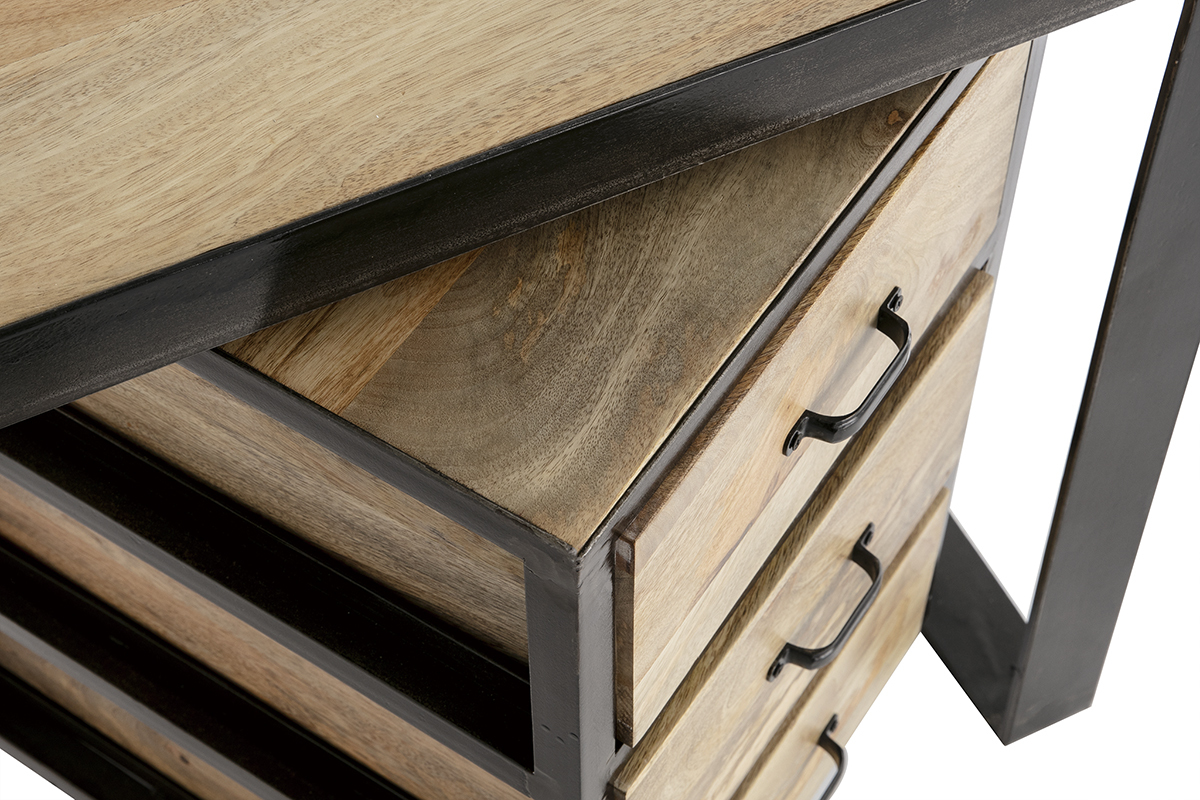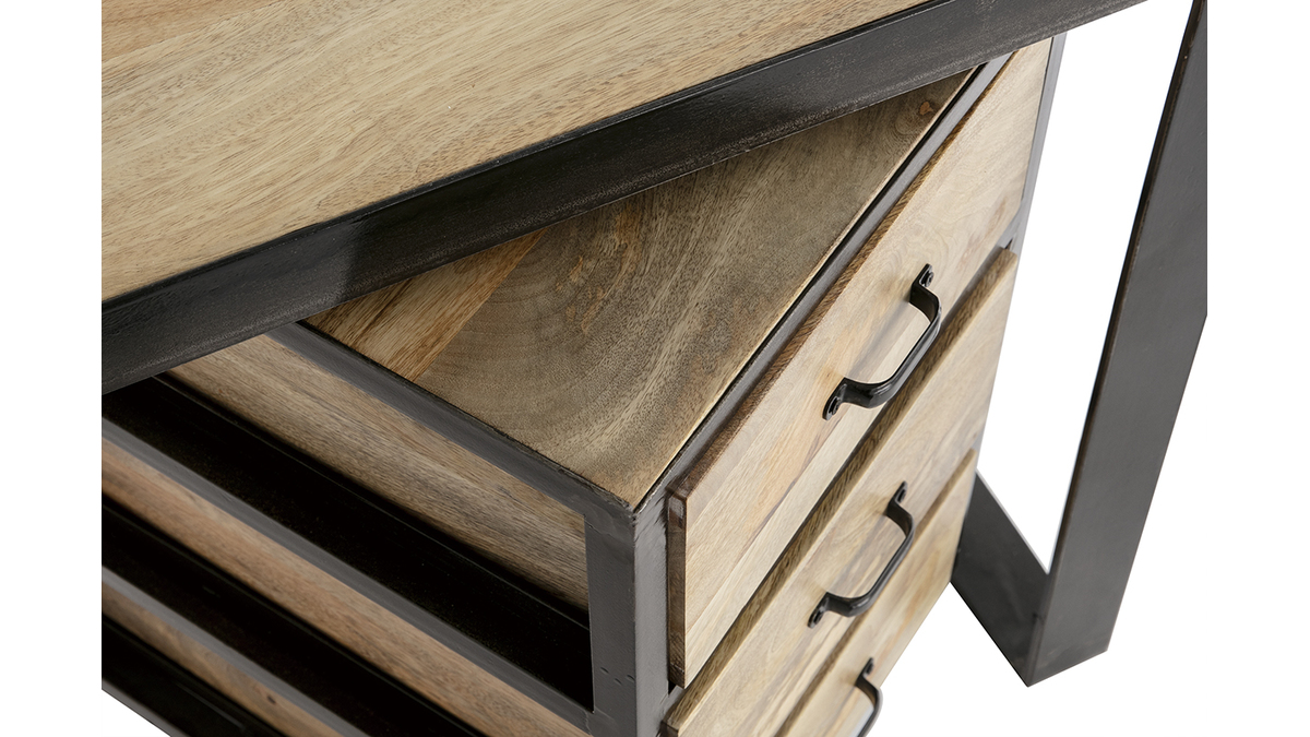 Ce qui fait toute la beauté de cet ensemble, ce sont ses matériaux travaillés artisanalement. Le plateau et les tiroirs sont réalisés en manguier massif, une essence de bois exotique avec de magnifiques nervures. Ils sont associés à une solide structure en acier faite à la main. Ces matériaux bruts, chaleureux et authentiques, apportent une touche industrielle résolument tendance.