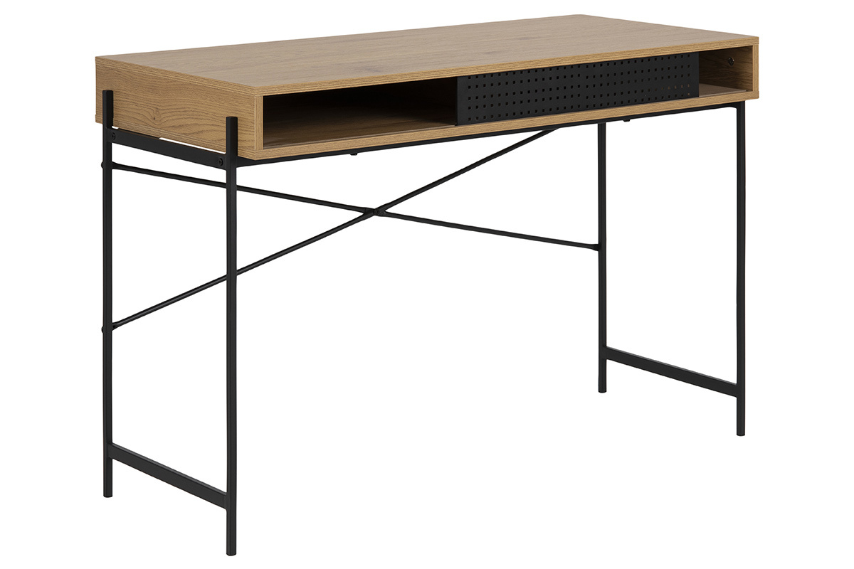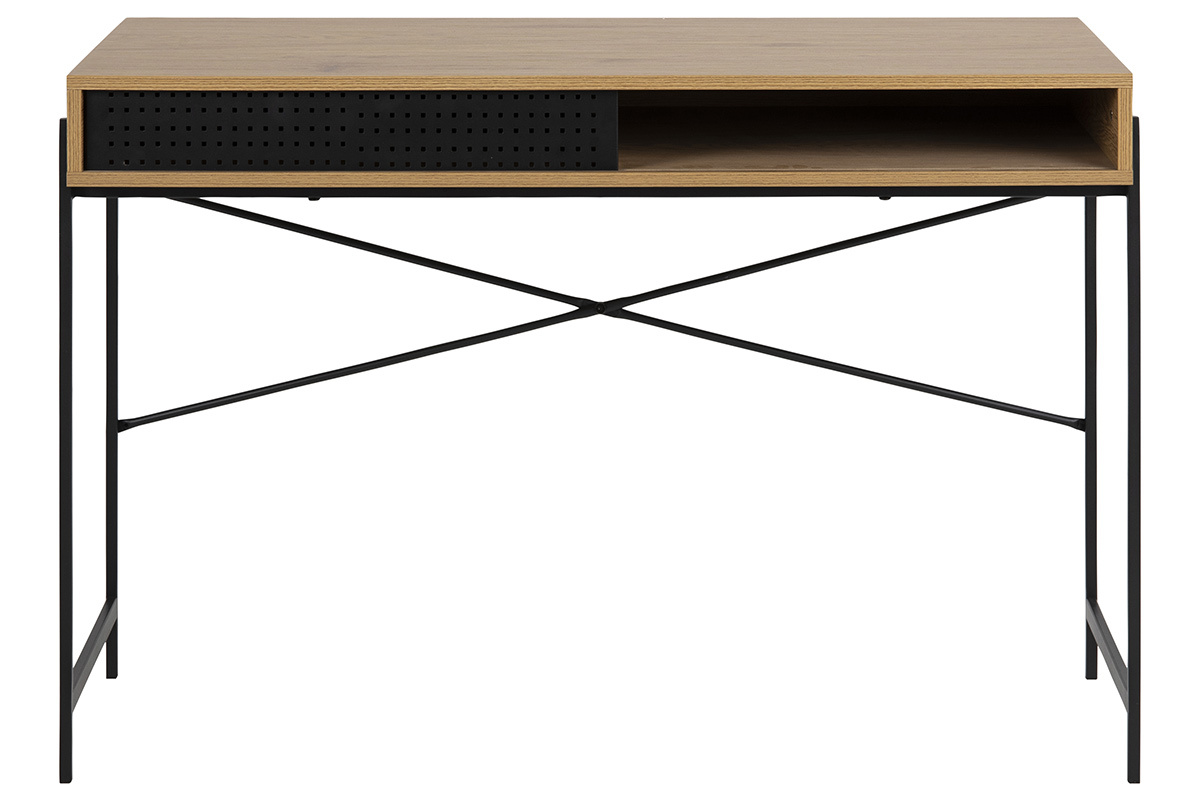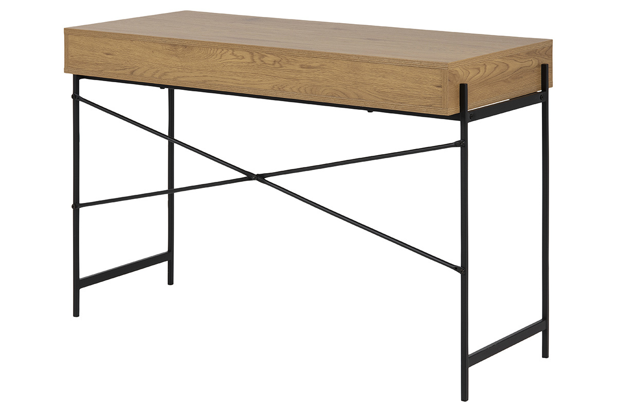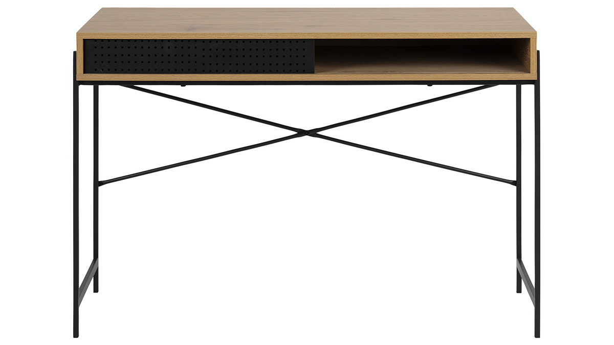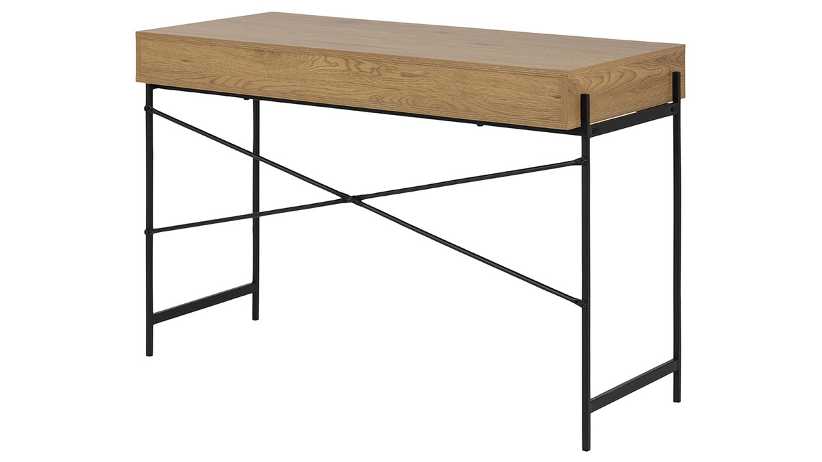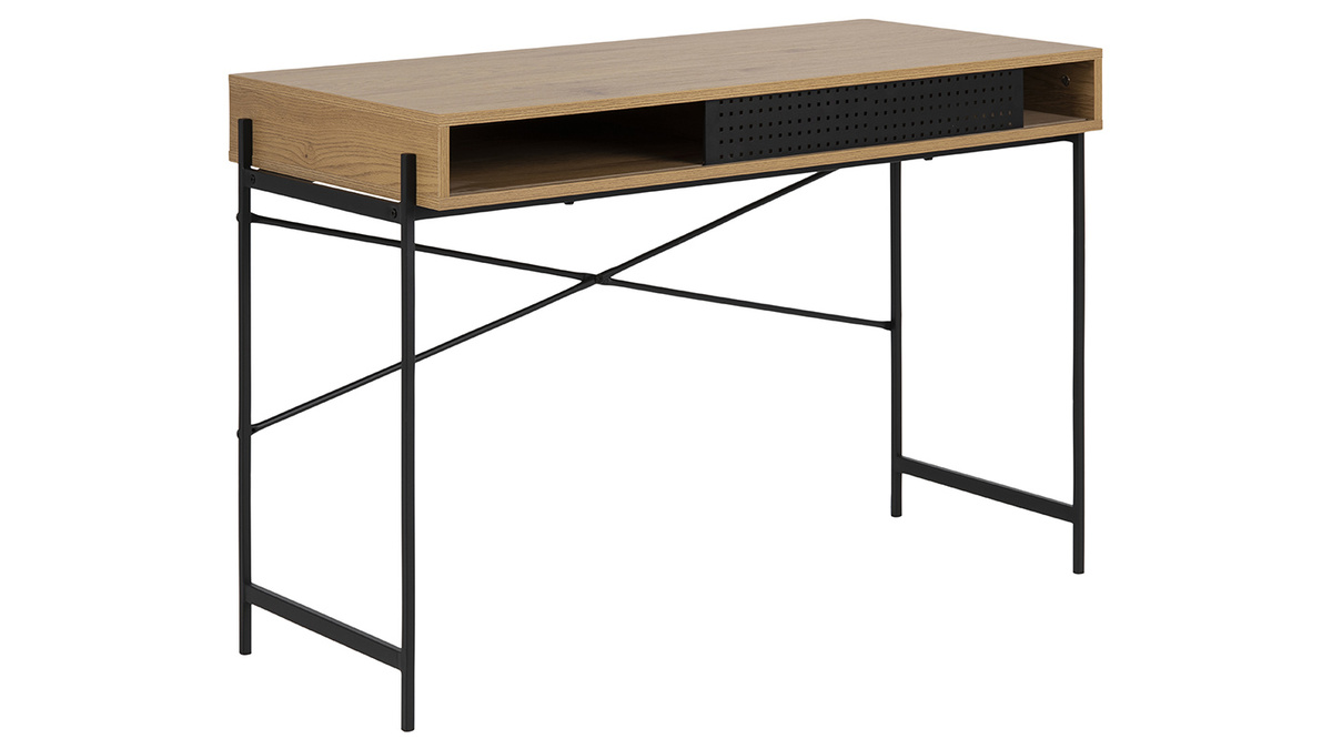 Ce bureau en bois et métal noir, élégant et plein de caractère, est idéal pour aménager un coin studieux très déco dans toutes les pièces. Grâce à ses dimensions (L112.7 x P50 cm), il n'encombre pas l'espace tout en proposant une surface suffisante pour travailler confortablement.