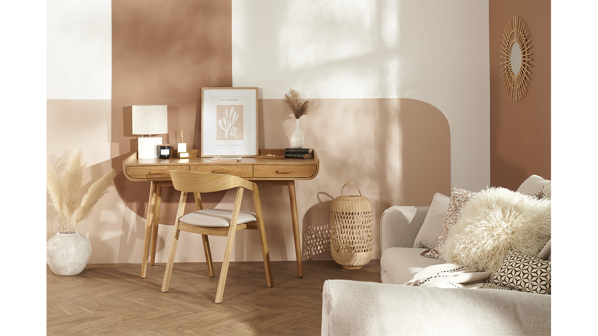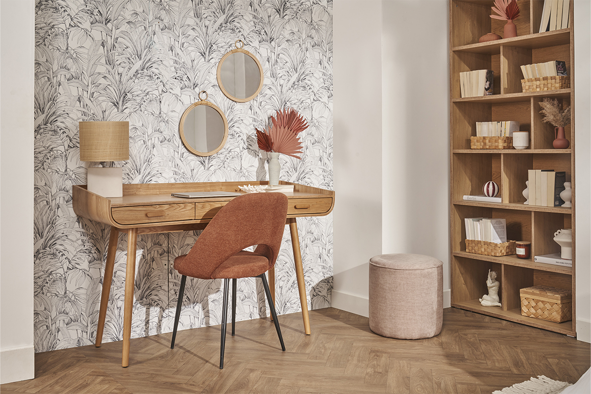 Le bois clair se marie aussi bien avec les tons chauds que les tons froids. Vous pourrez donc facilement aménager un espace bureau dans une pièce indépendante ou intégrer le bureau scandinave HALLEN dans une pièce de vie, par exemple. Apportez une touche colorée à votre espace de travail en l'associant à une chaise de bureau bleu pétrole ou jaune moutarde !