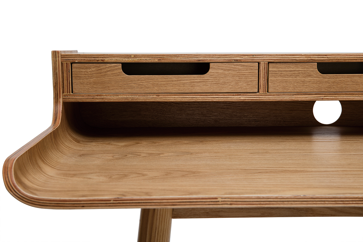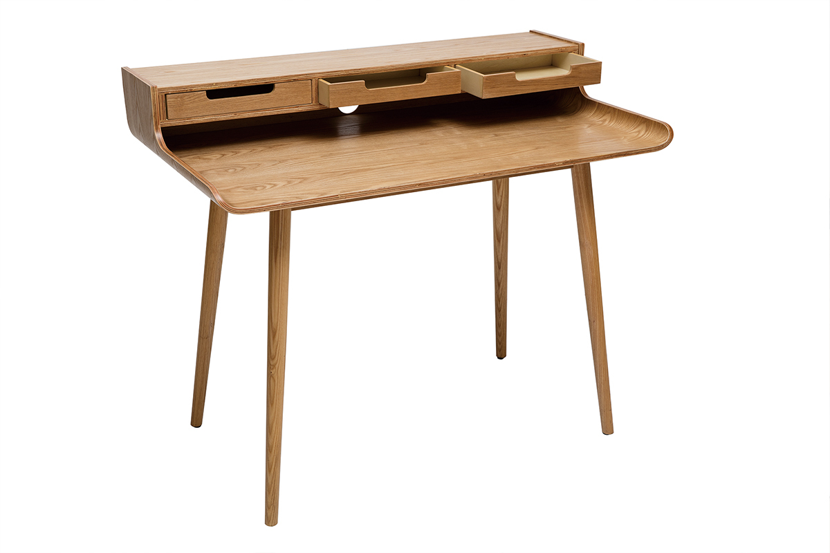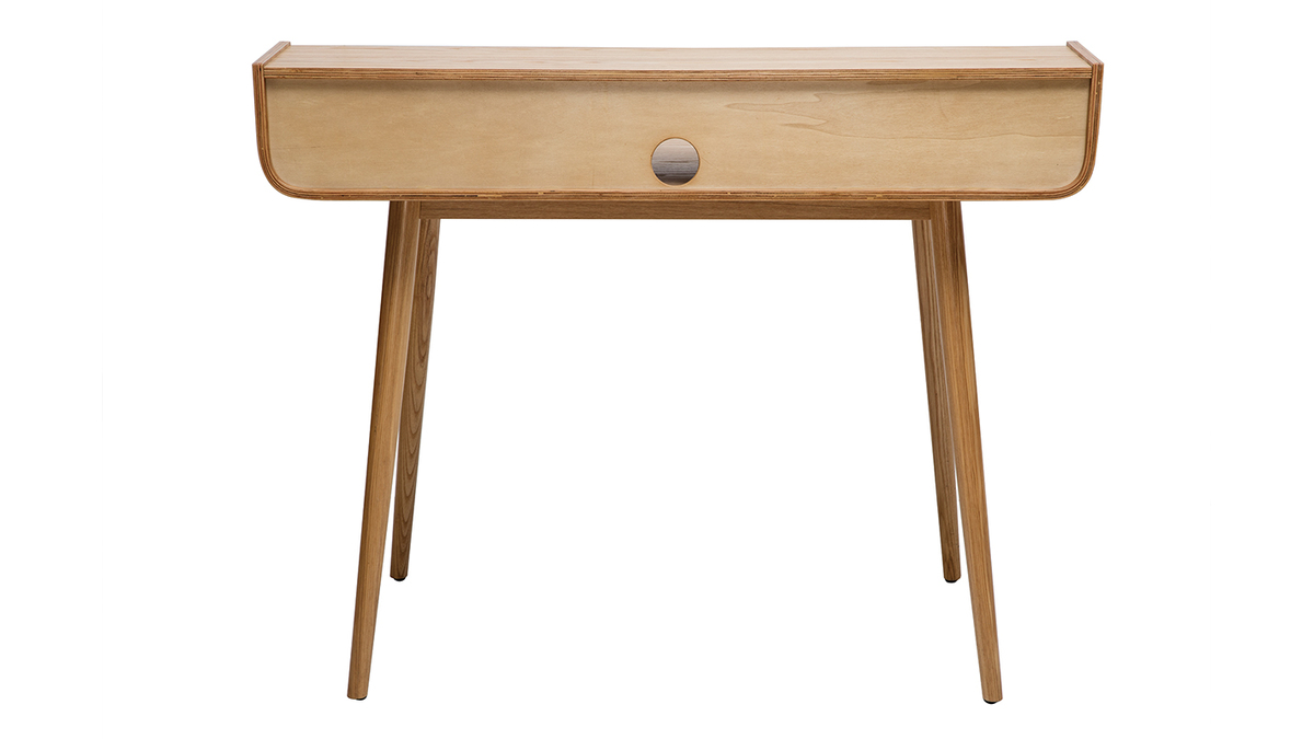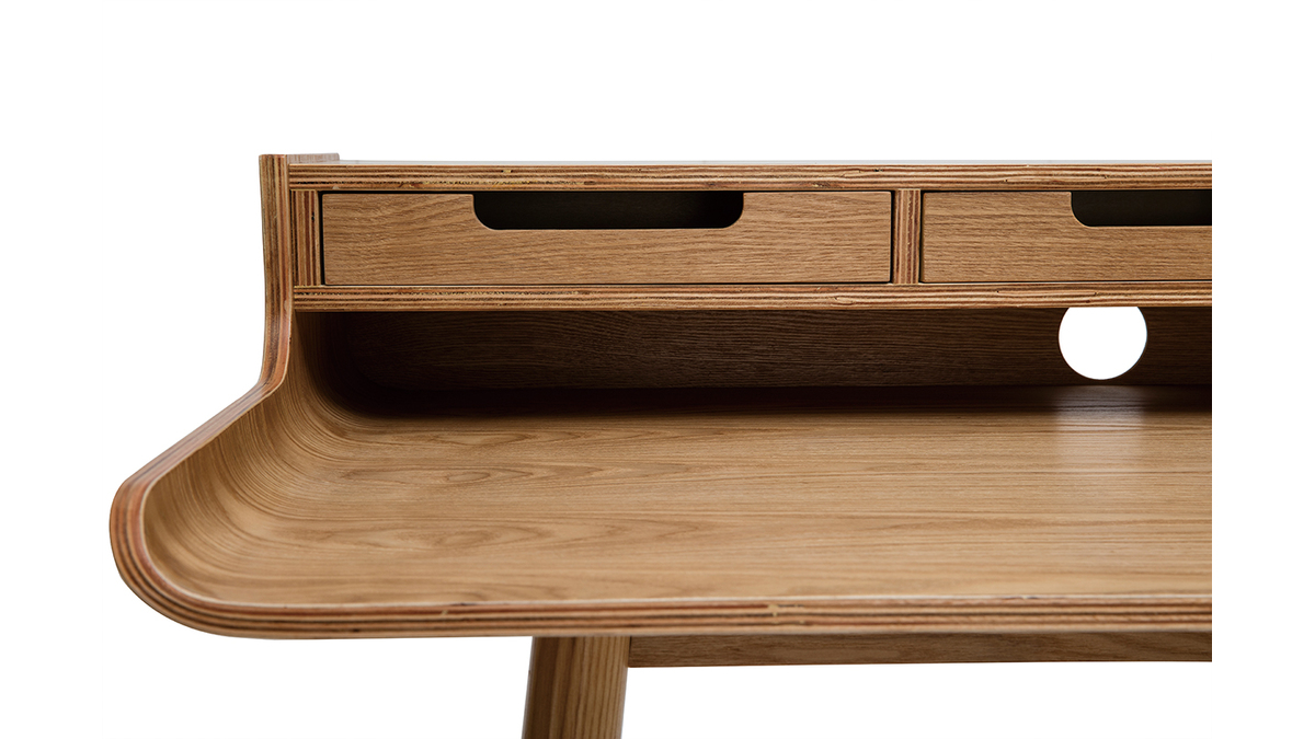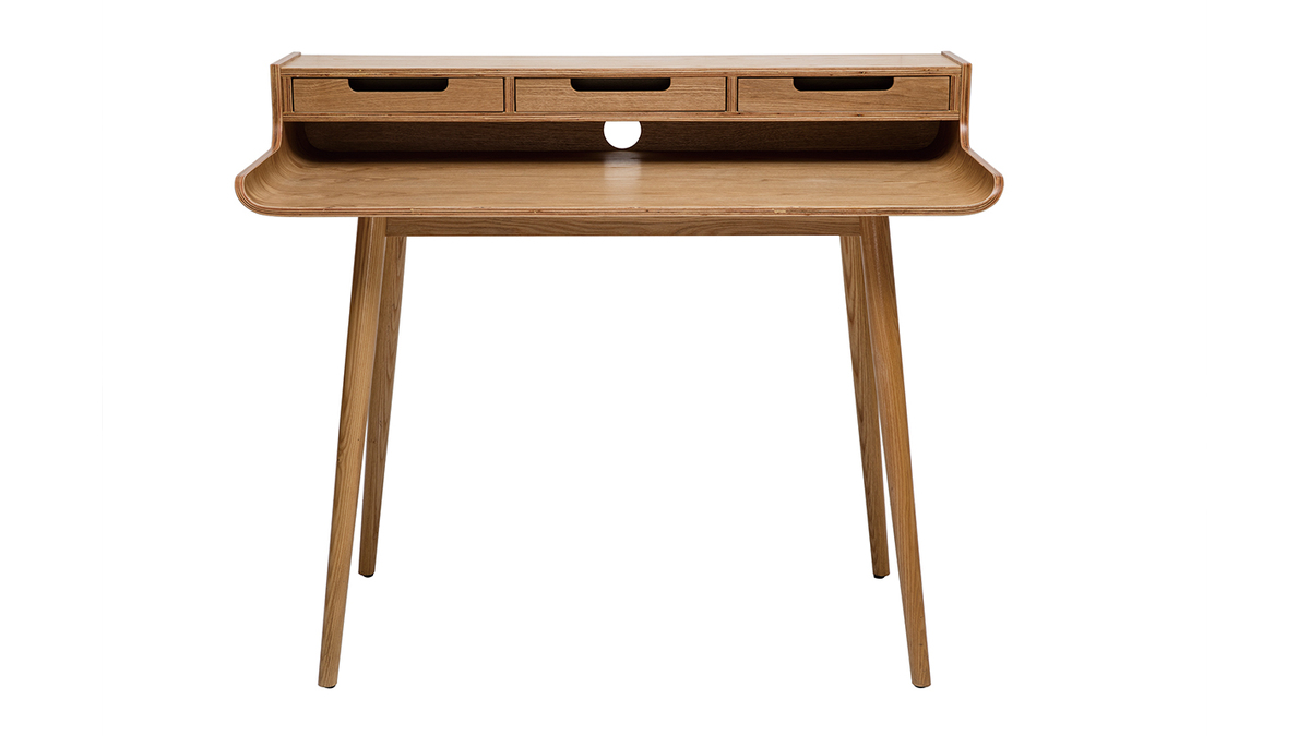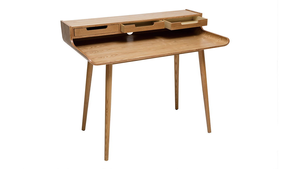 Inspiré du design danois des années 50/60, le bureau OPUS séduira tous les amoureux de mobilier vintage avec son élégante finition frêne et ses pieds compas en bois massif très solides.
