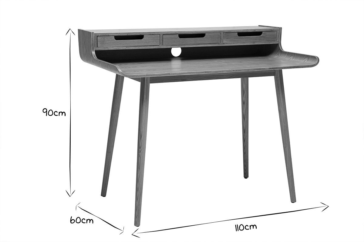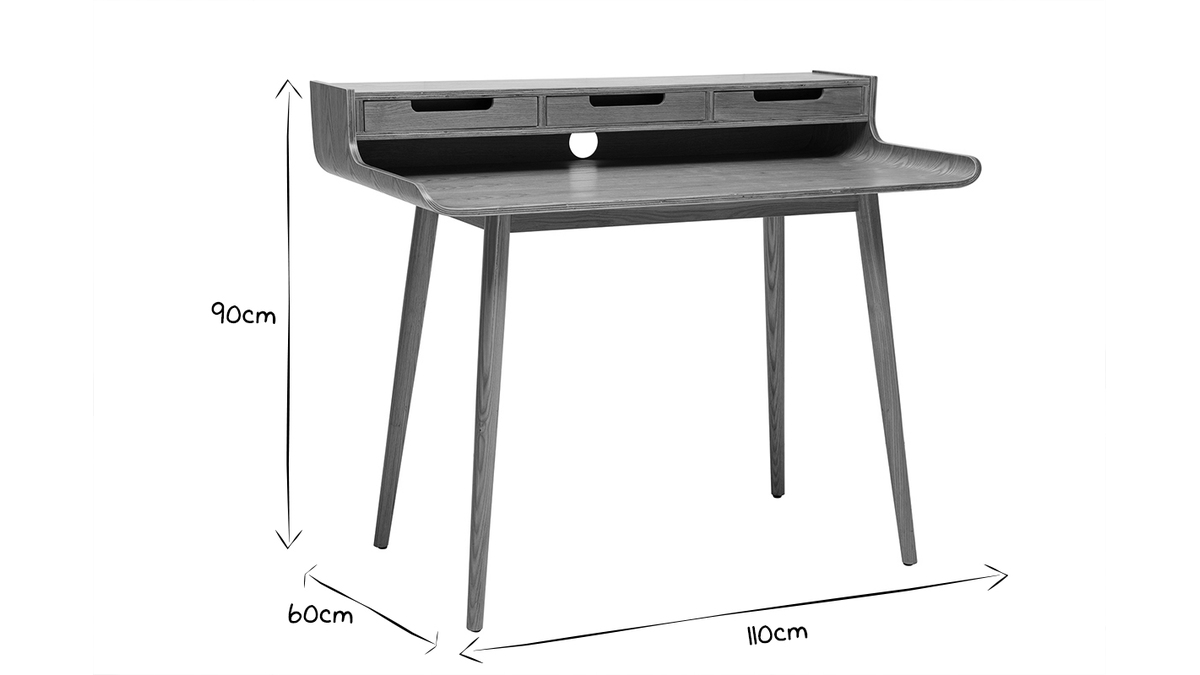Très esthétique, le bureau en bois OPUS est également un concentré de fonctionnalité. Son grand plateau en contreplaqué (épaisseur 1.5 cm) offre un bel espace de travail (L110 x P38 cm). Ses trois petits tiroirs (P22 cm) vous permettront de garder un bureau toujours rangé en dissimulant tous les petits objets qui s'accumulent au fil du temps. Sous les trois tiroirs se trouve un passe-câble de 6 cm de diamètre qui cachera les câbles disgracieux en libérant pleinement l'espace de travail.
