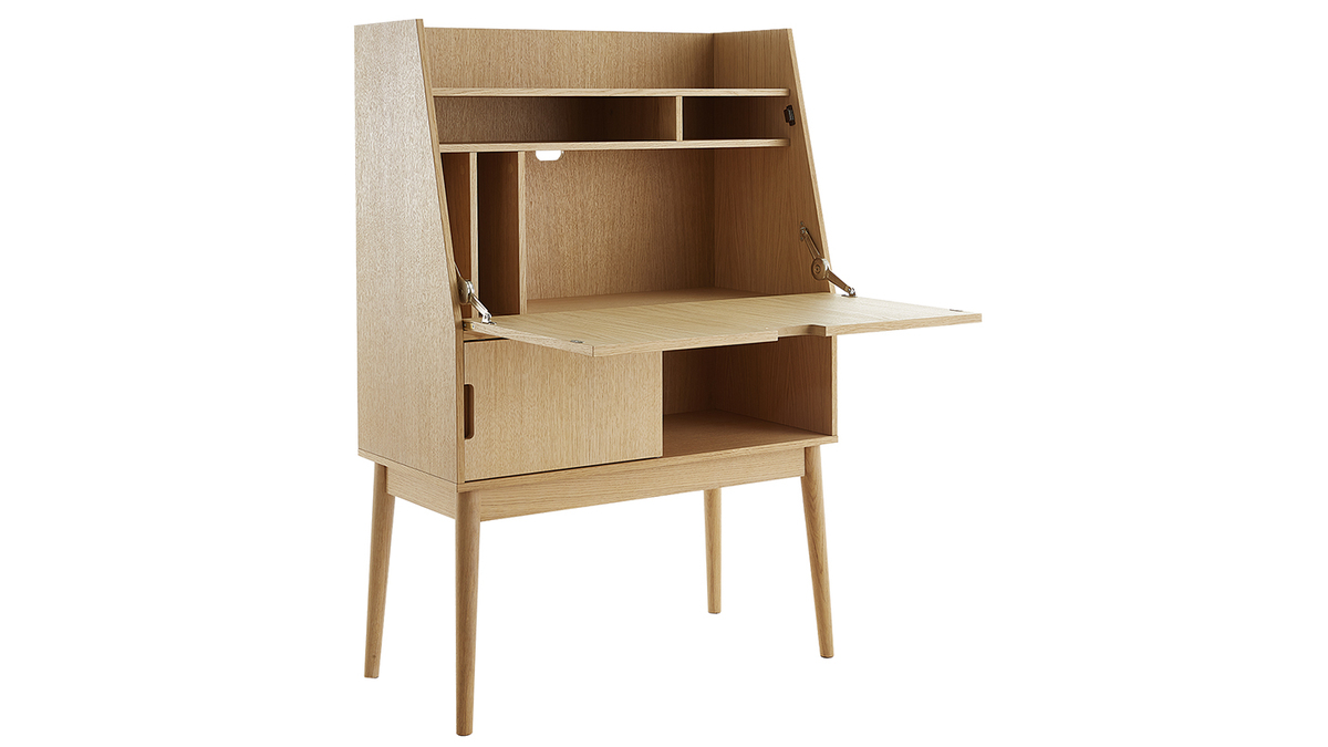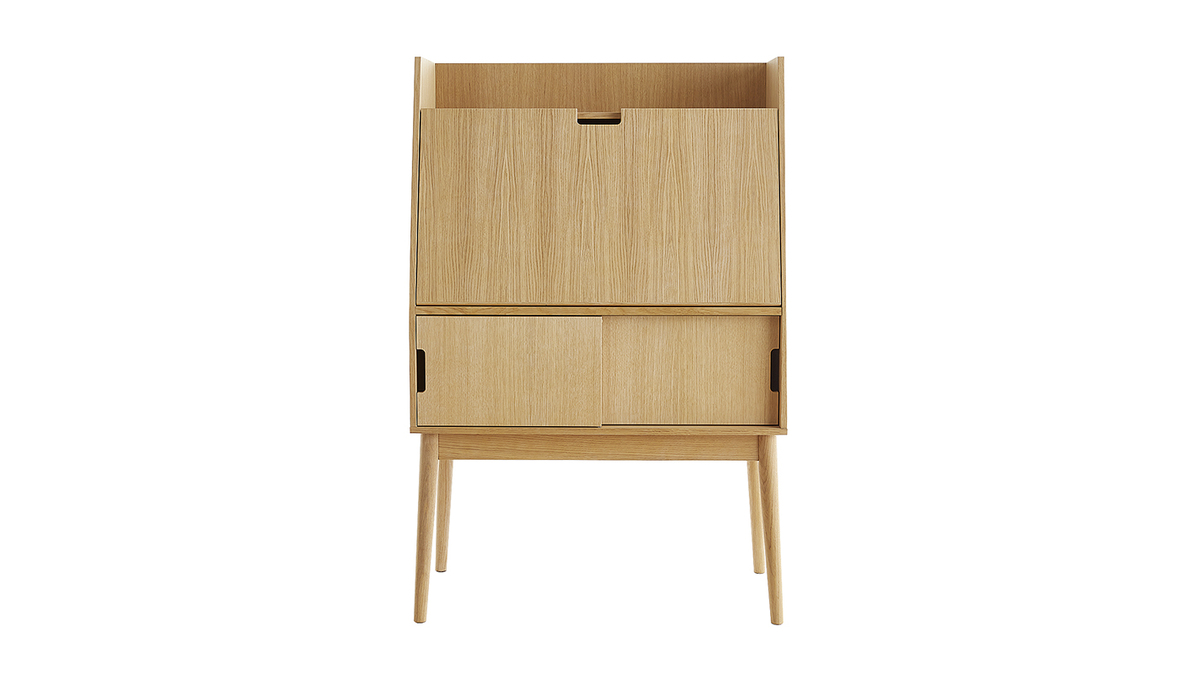 Notre designer Camille Paquereau revisite avec audace le secrétaire des années 50 ! Avec ses lignes claires et son design minimaliste, GABIN est aussi beau que fonctionnel. Lorsqu'il est ouvert, son plateau rabattable supportera de faibles charges, comme un ordinateur portable, une tablette ou votre lecture du moment. Parfait pour le télétravail ponctuel, ce bureau d'appoint vous permettra de traiter en un tournemain un courrier urgent ou le classement de vos documents. A l'intérieur, ses nombreux casiers de rangement (2 verticaux et 2 horizontaux) vous permettront d'organiser tous vos documents administratifs. Une fois le plateau fermé, tout le petit bazar du quotidien est dissimulé comme par magie.