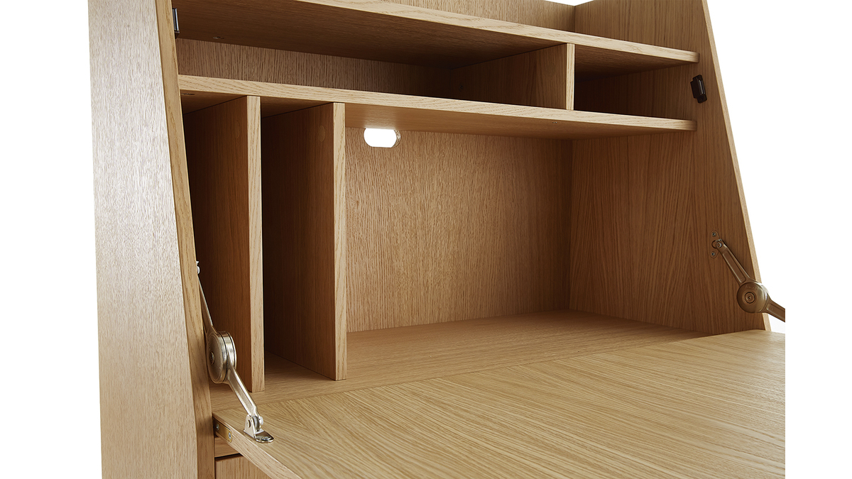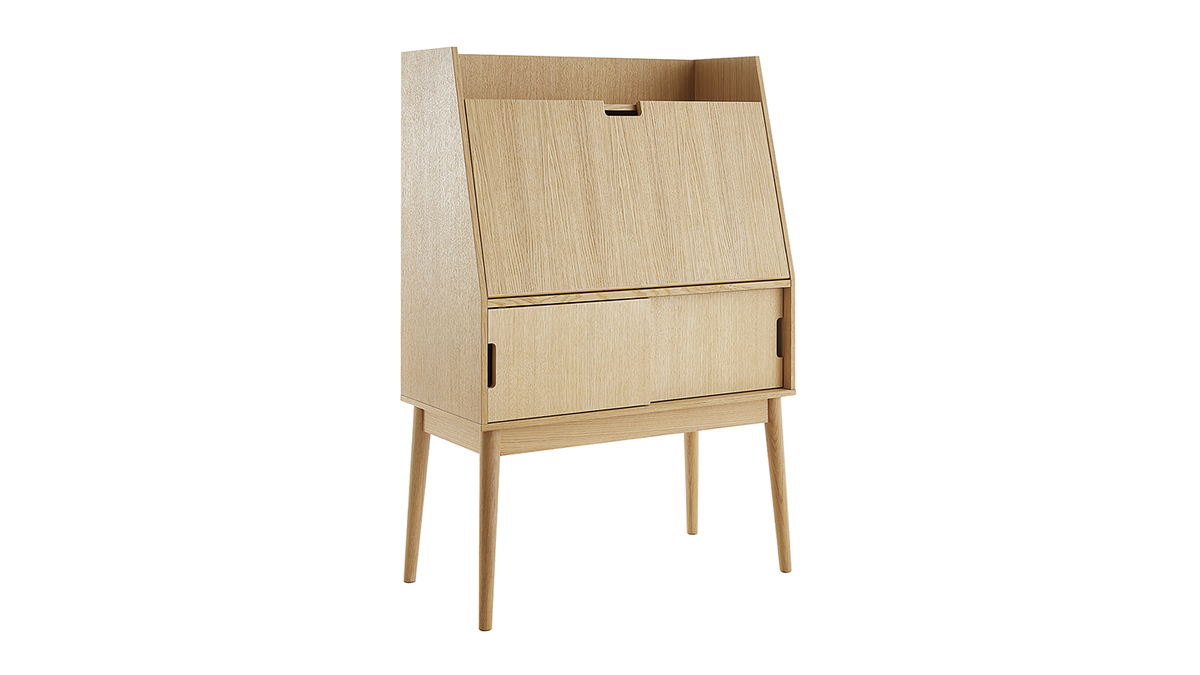 Perché sur de hauts pieds effilés en chêne massif, ce bureau/secrétaire à la silhouette élancée sera la nouvelle pièce maitresse de votre intérieur. Il est fabriqué en Europe à partir de panneaux de fibres de bois recouverts d'un élégant placage chêne. On aime particulièrement sa finition composée d'une huile pigmentée blanche qui nourrit et protège le bois tout en laissant transparaître ses jolies veinures.