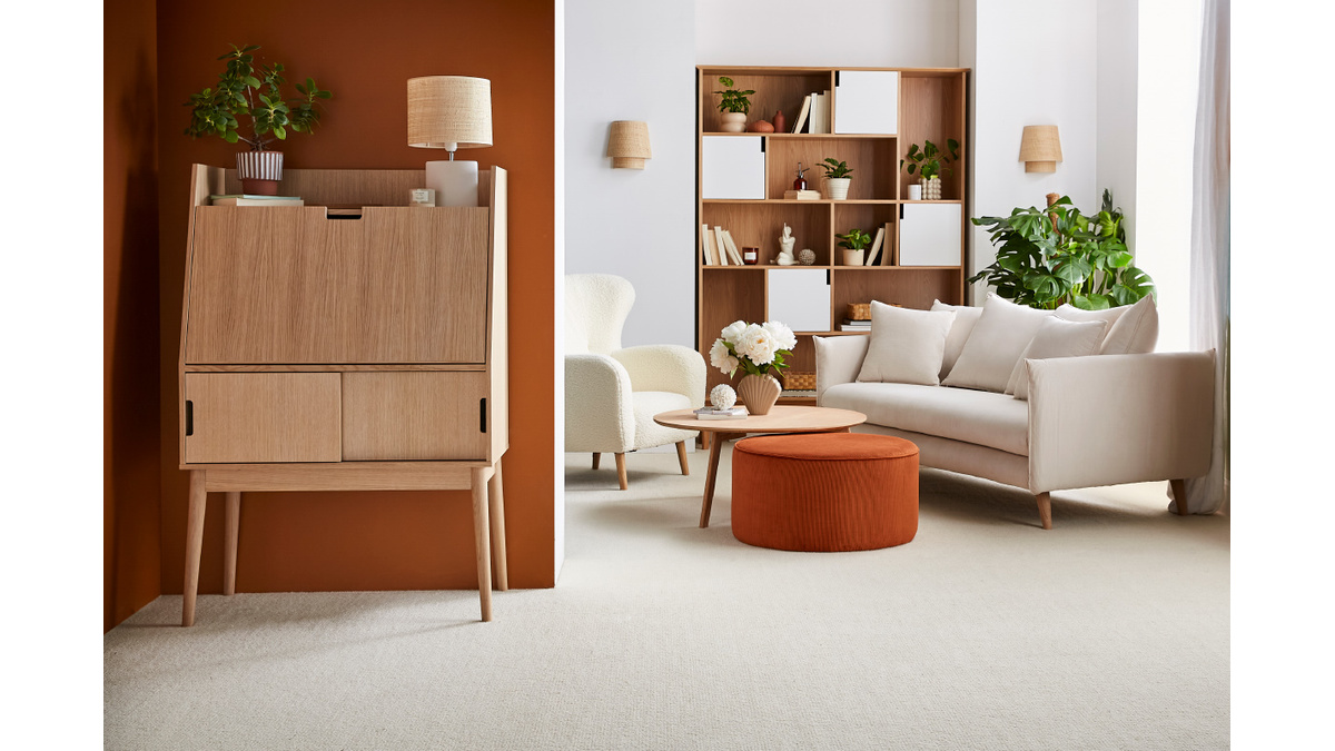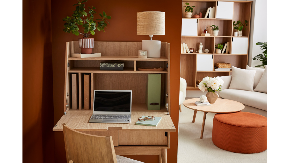 Dans une entrée, une chambre ou un séjour, le bureau/secrétaire GABIN saura trouver sa place en duo avec un tabouret ou une chaise en bois de la collection Miliboo.