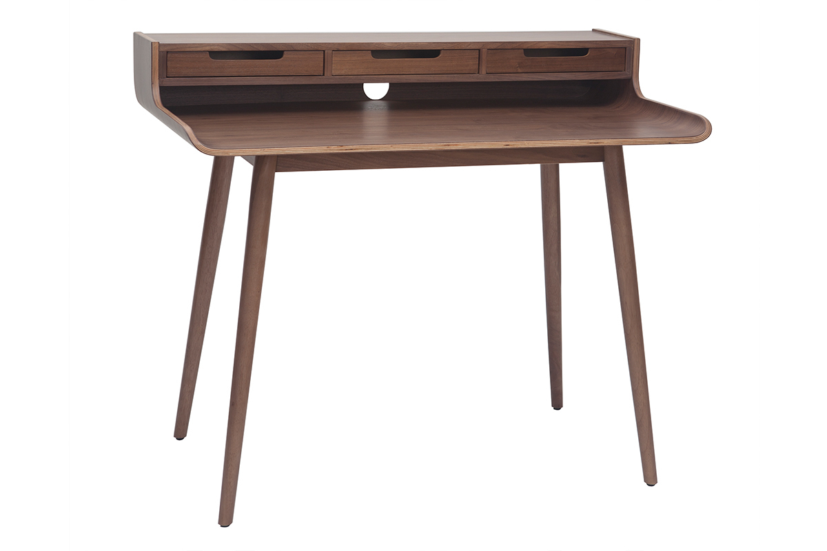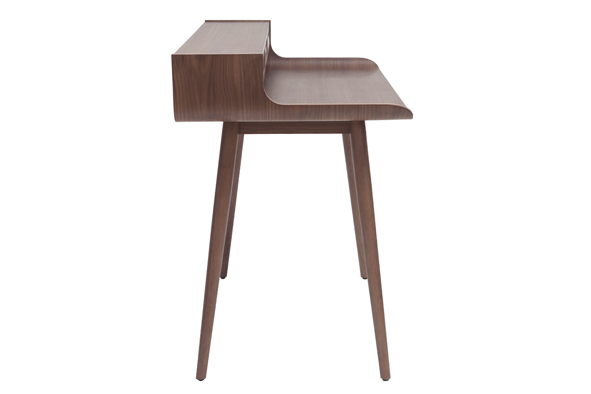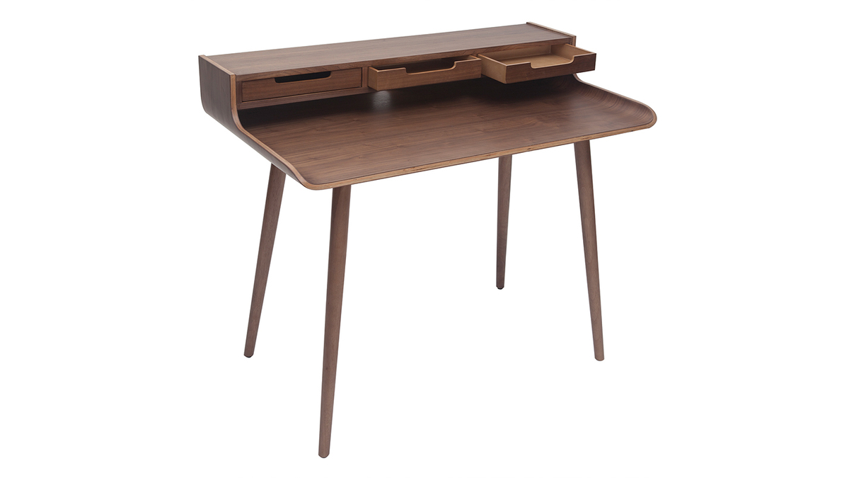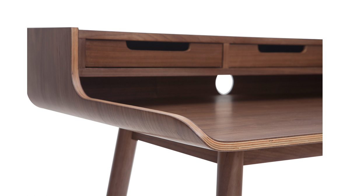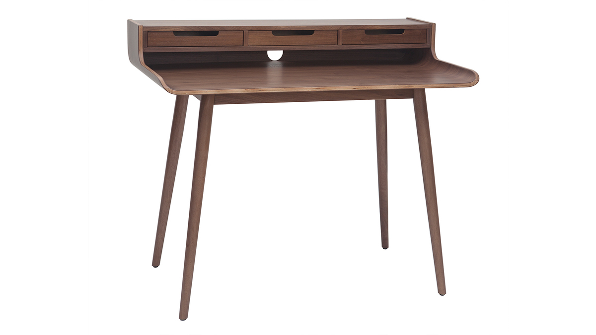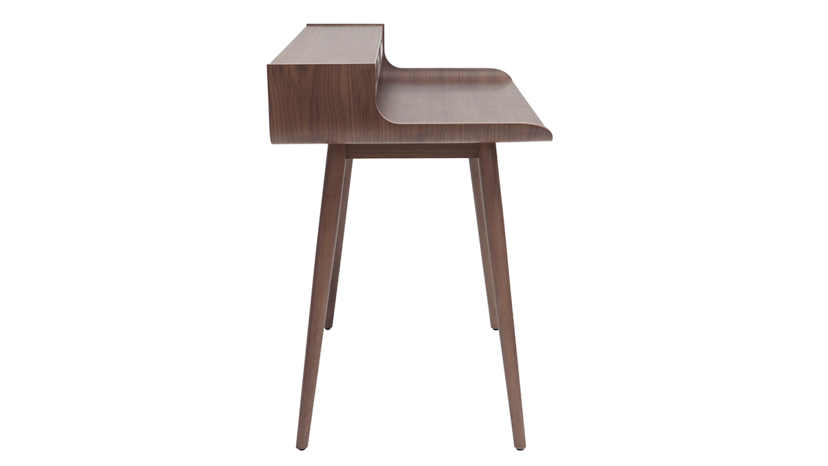 Inspiré du design danois des années 50/60, le bureau OPUS séduira tous les amoureux de mobilier vintage avec son élégante finition noyer et ses pieds compas en bois massif très solides.