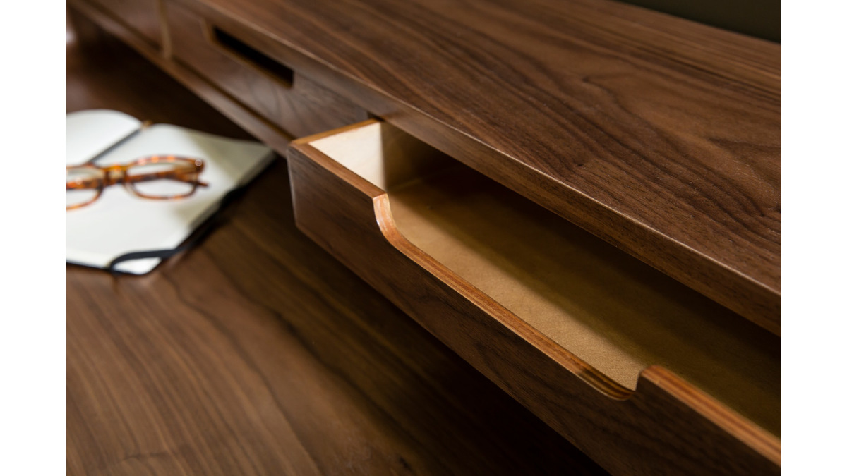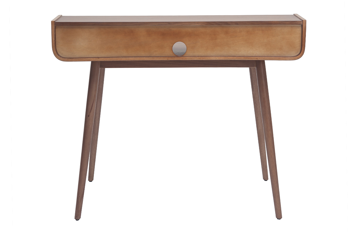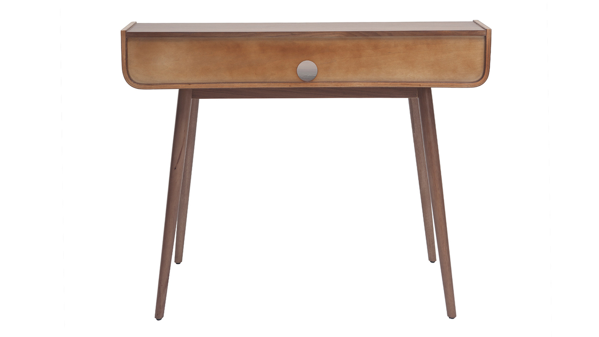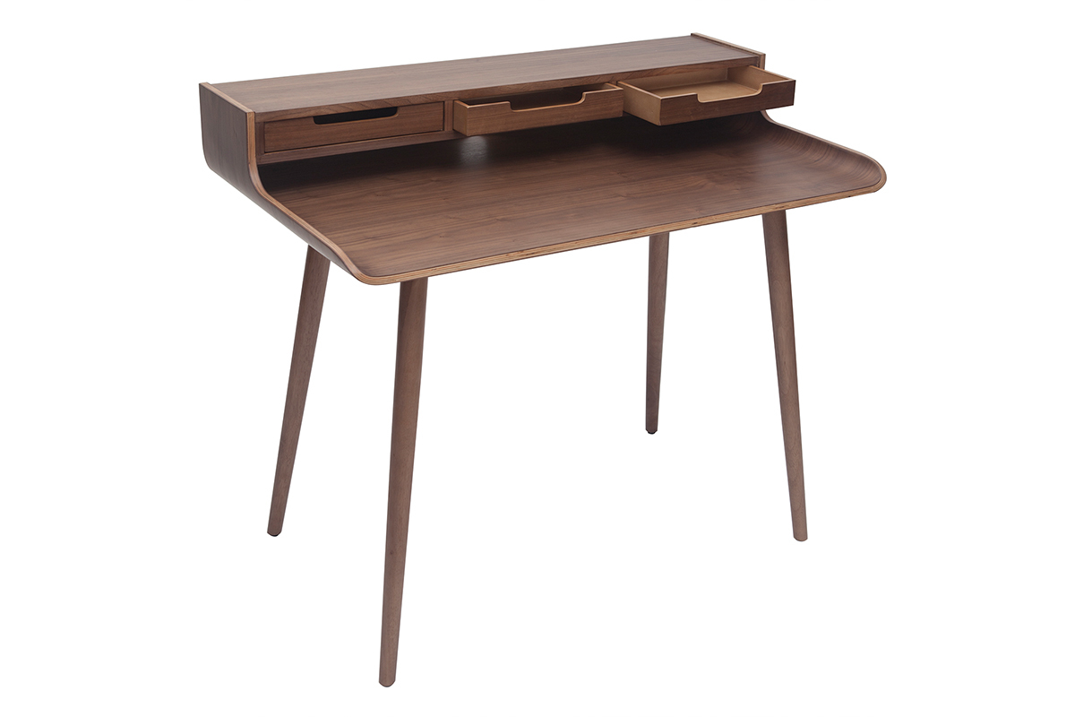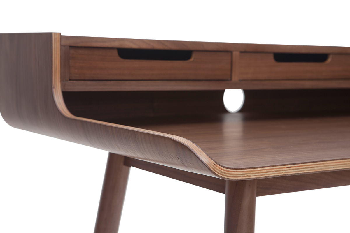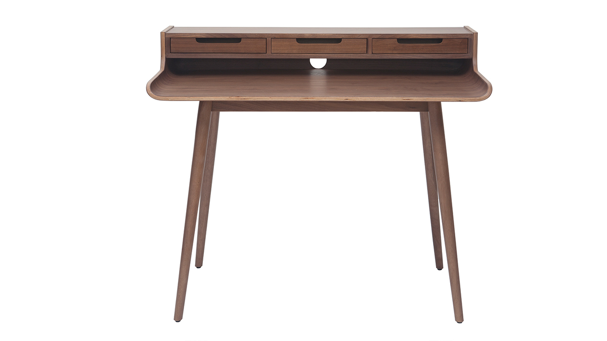 Inspiré du design danois des années 50/60, le bureau OPUS séduira tous les amoureux de mobilier vintage avec son élégante finition noyer et ses pieds compas en bois massif très solides.