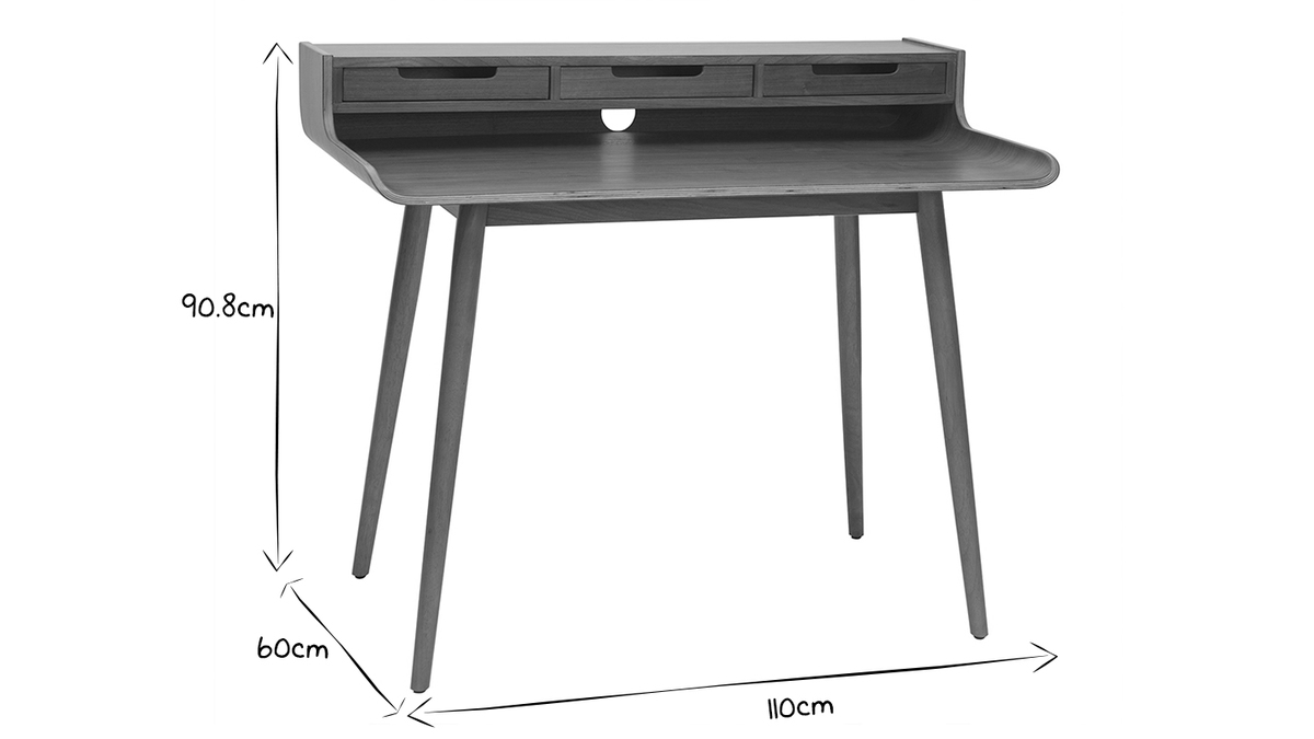 Très esthétique, le bureau bois foncé OPUS est également un concentré de fonctionnalité. Son grand plateau en contreplaqué (épaisseur 1.5 cm) offre un bel espace de travail (L110 x P38 cm). Ses trois petits tiroirs (P22 cm) vous permettront de garder un bureau toujours rangé en dissimulant tous les petits objets qui s'accumulent au fil du temps. Sous les trois tiroirs se trouve un passe-câble de 6 cm de diamètre qui cachera les câbles disgracieux en libérant pleinement l'espace de travail.