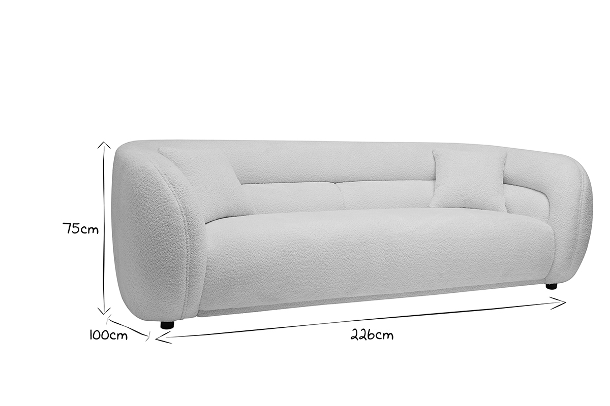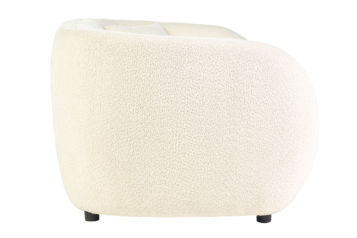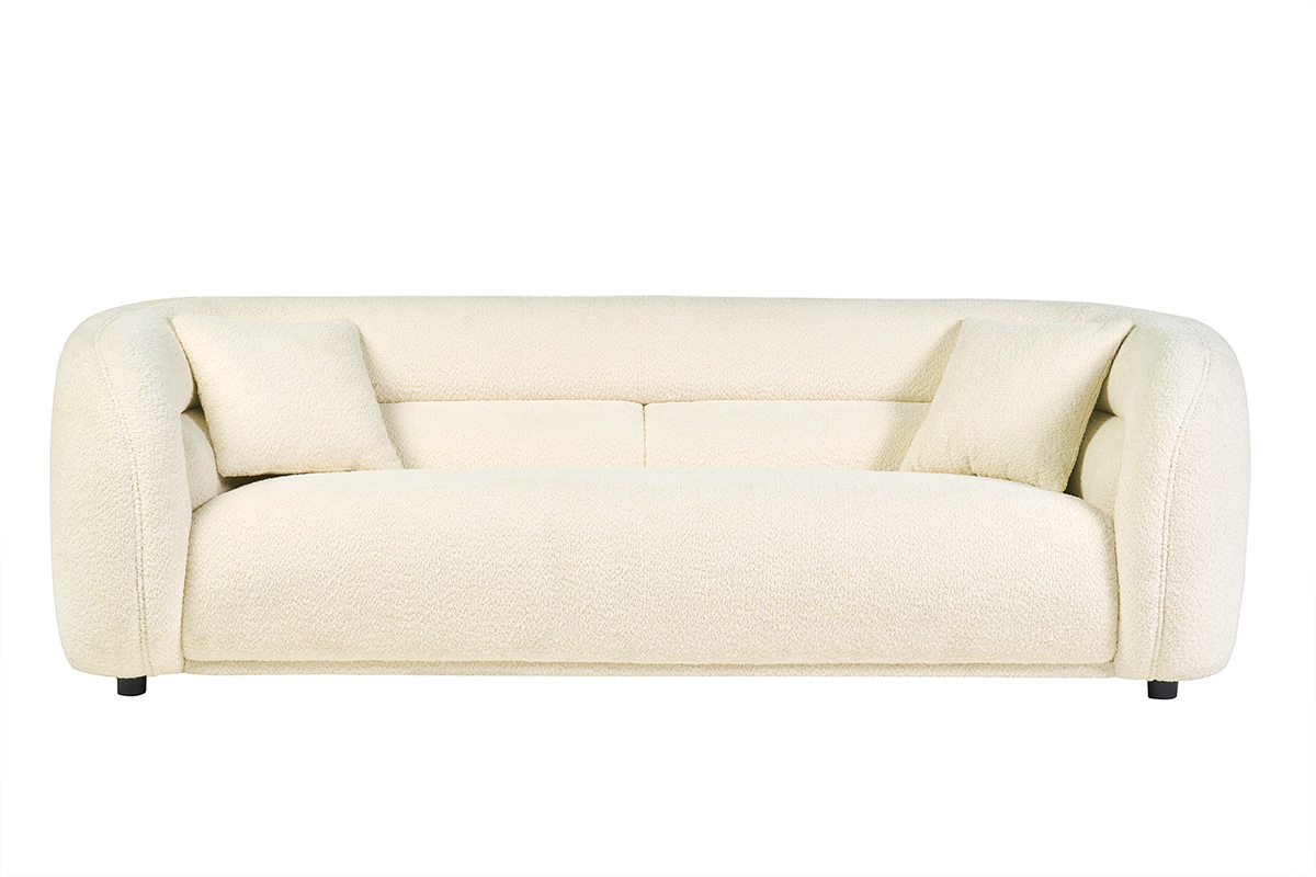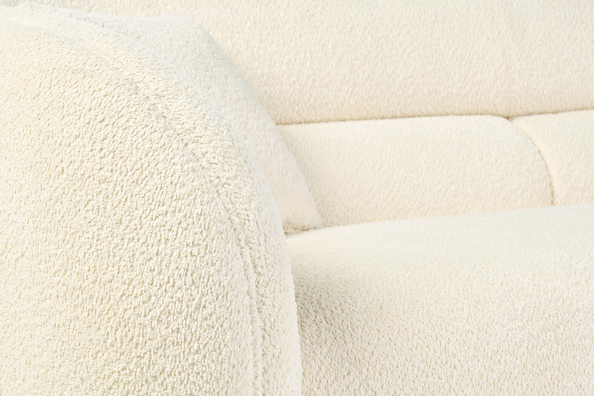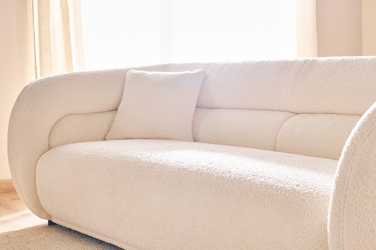 Habillé d'un tissu bouclette blanc cassé et accompagné de ses 2 coussins (41 x 41 cm), MOCHI séduit par son allure douce et accueillante. Ses courbes généreuses et ses lignes arrondies offrent un confort enveloppant, idéal pour des moments de détente. Son revêtement lui apporte une texture riche et tendance, tout en rehaussant le caractère cosy du canapé. Toujours agréable au toucher, il rappelle l'univers douillet et serein propre aux intérieurs scandinaves.