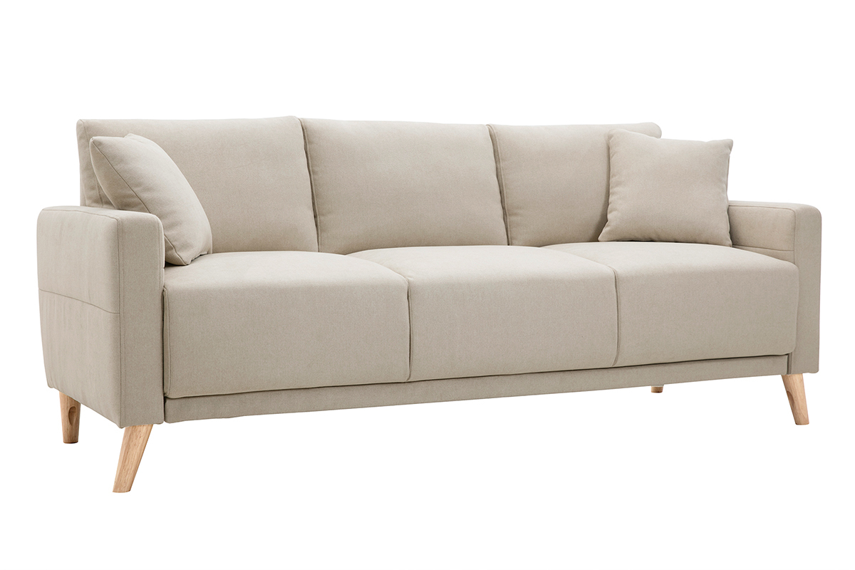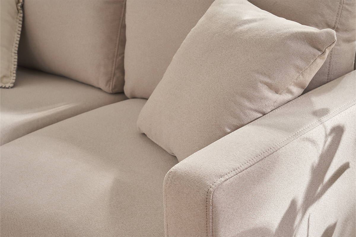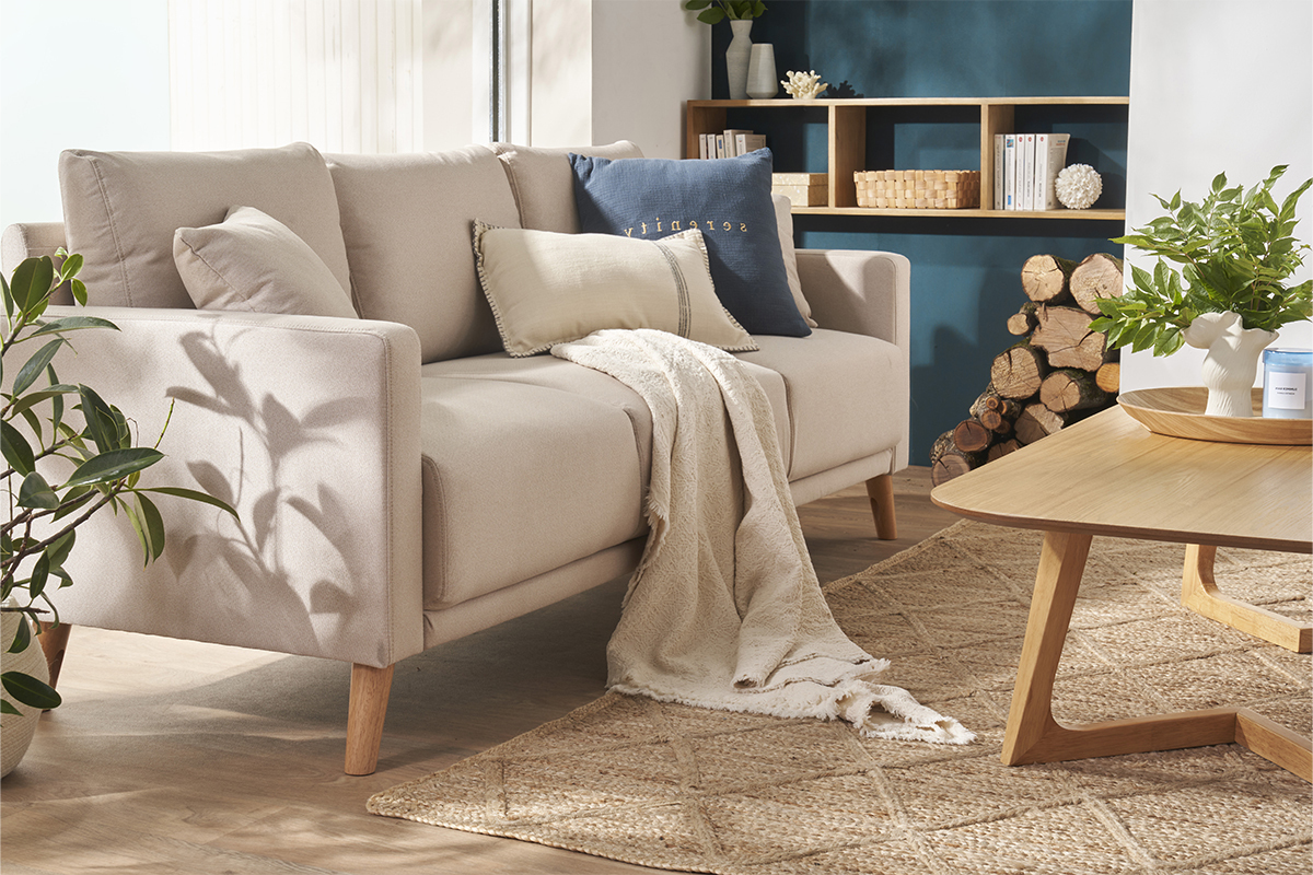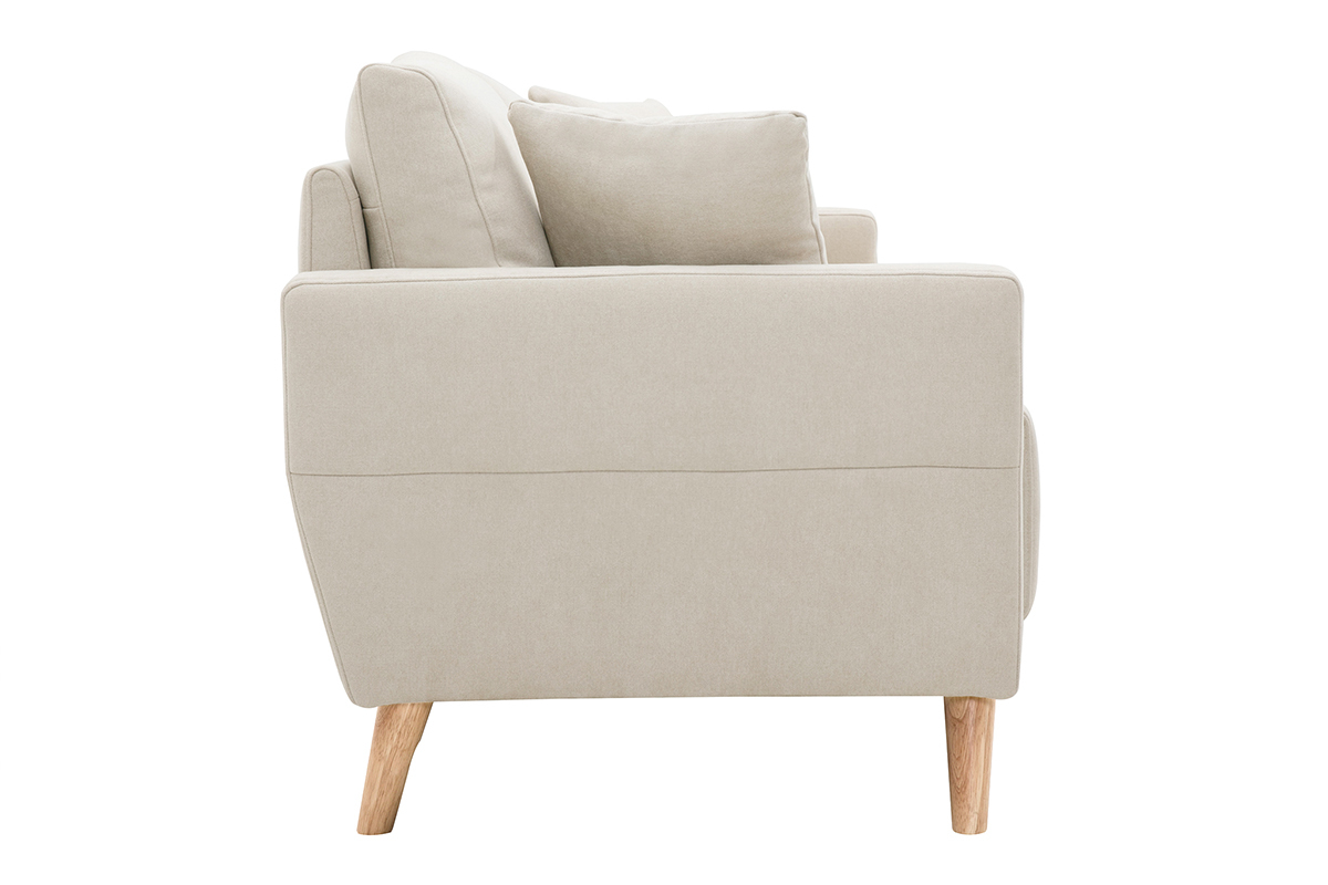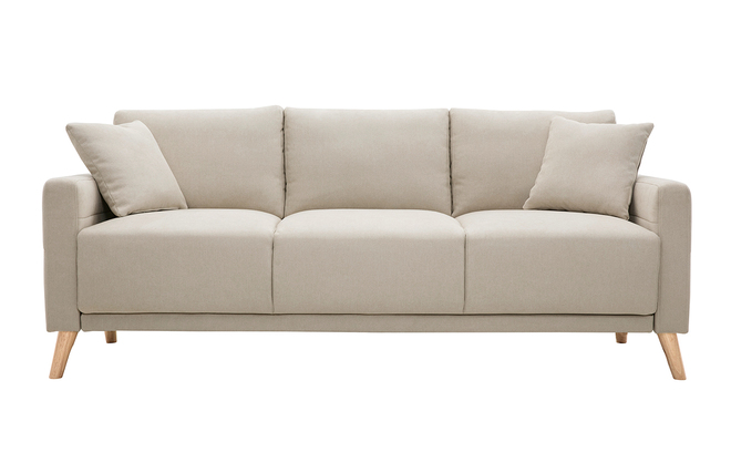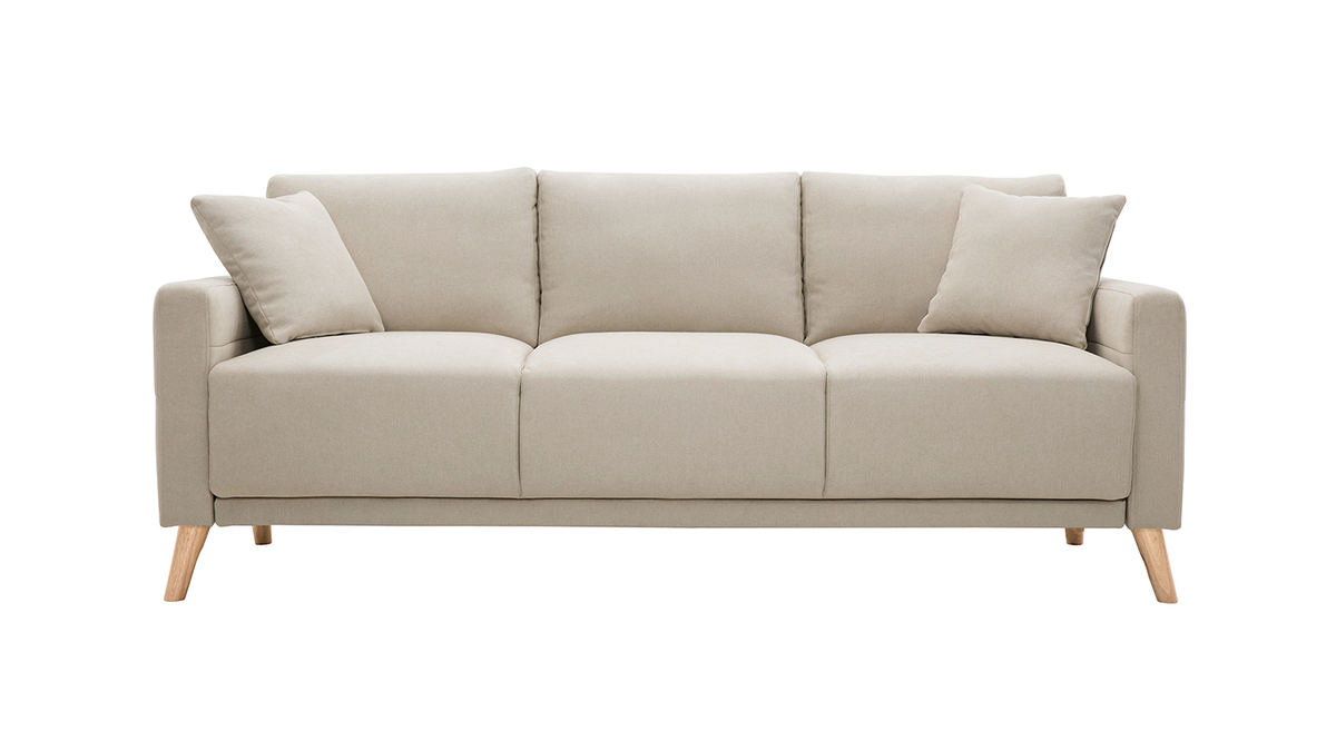 Ce canapé (L193 x P75.5 x H79 cm) a été conçu pour accueillir confortablement 3 personnes. Il combine 3 grands coussins de dossier ultra moelleux (rembourrage en fibres de polyester) à une assise composée de 3 couches de mousse (densités 28, 18 et 22 kg/m³) offrant un accueil souple et un maintien ferme. Deux petits coussins d'appoint (L34 x L34 cm) complètent l'ensemble pour toujours plus de confort.