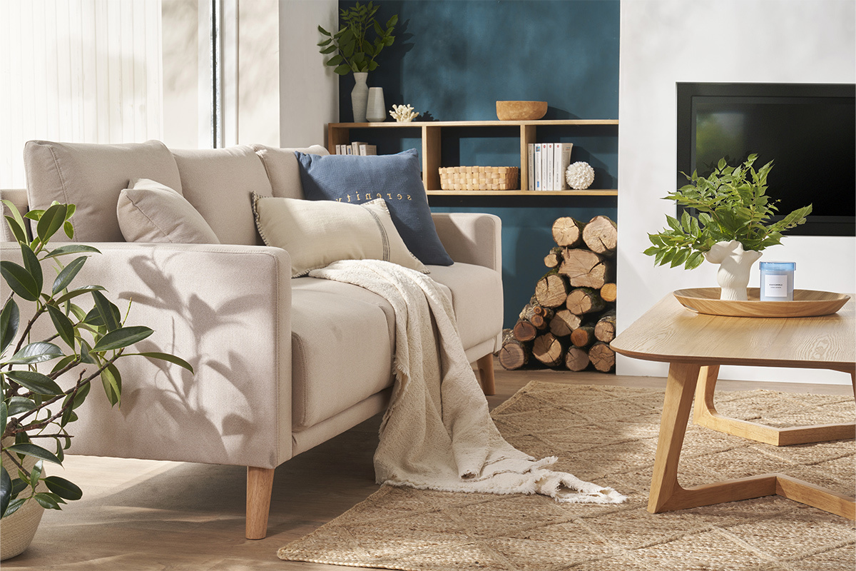 Le canapé MUNIK se prêtera volontiers à une atmosphère rétro chic, entouré d'une table basse en bois d'inspiration fifties.