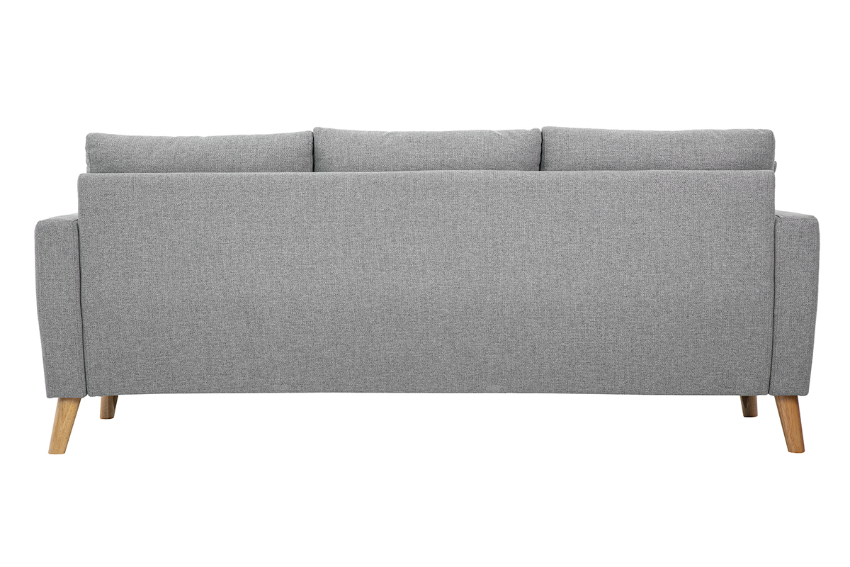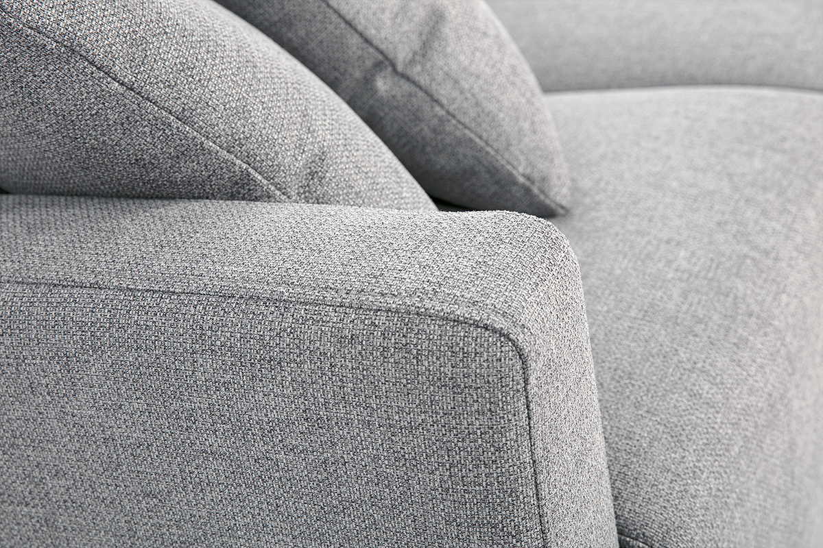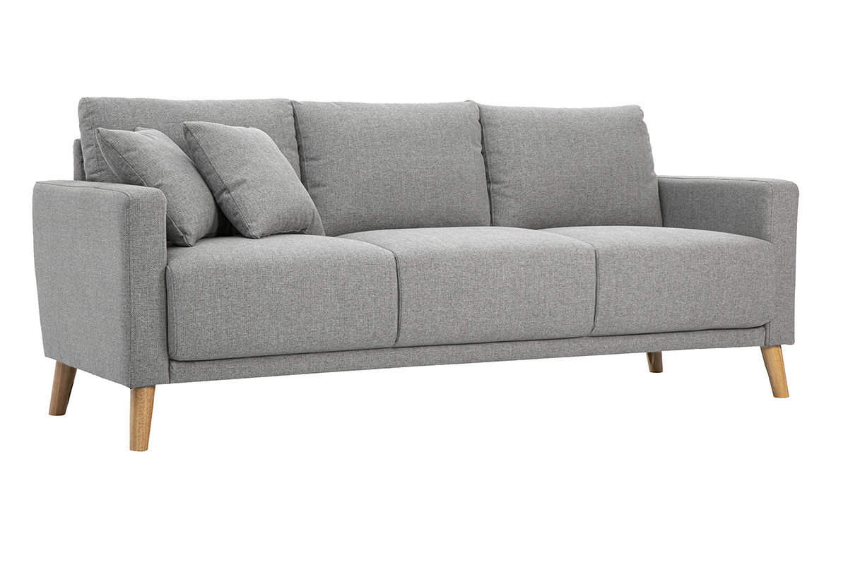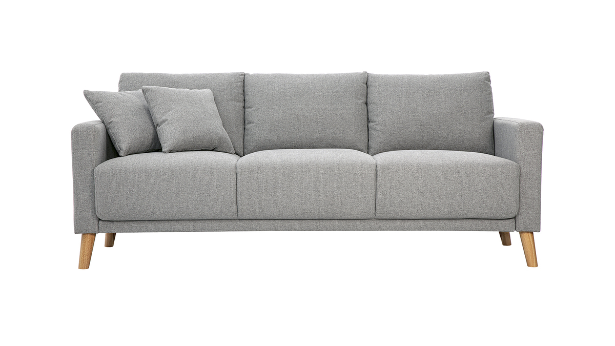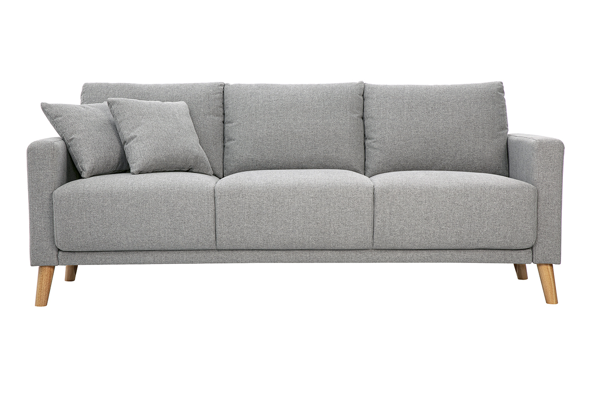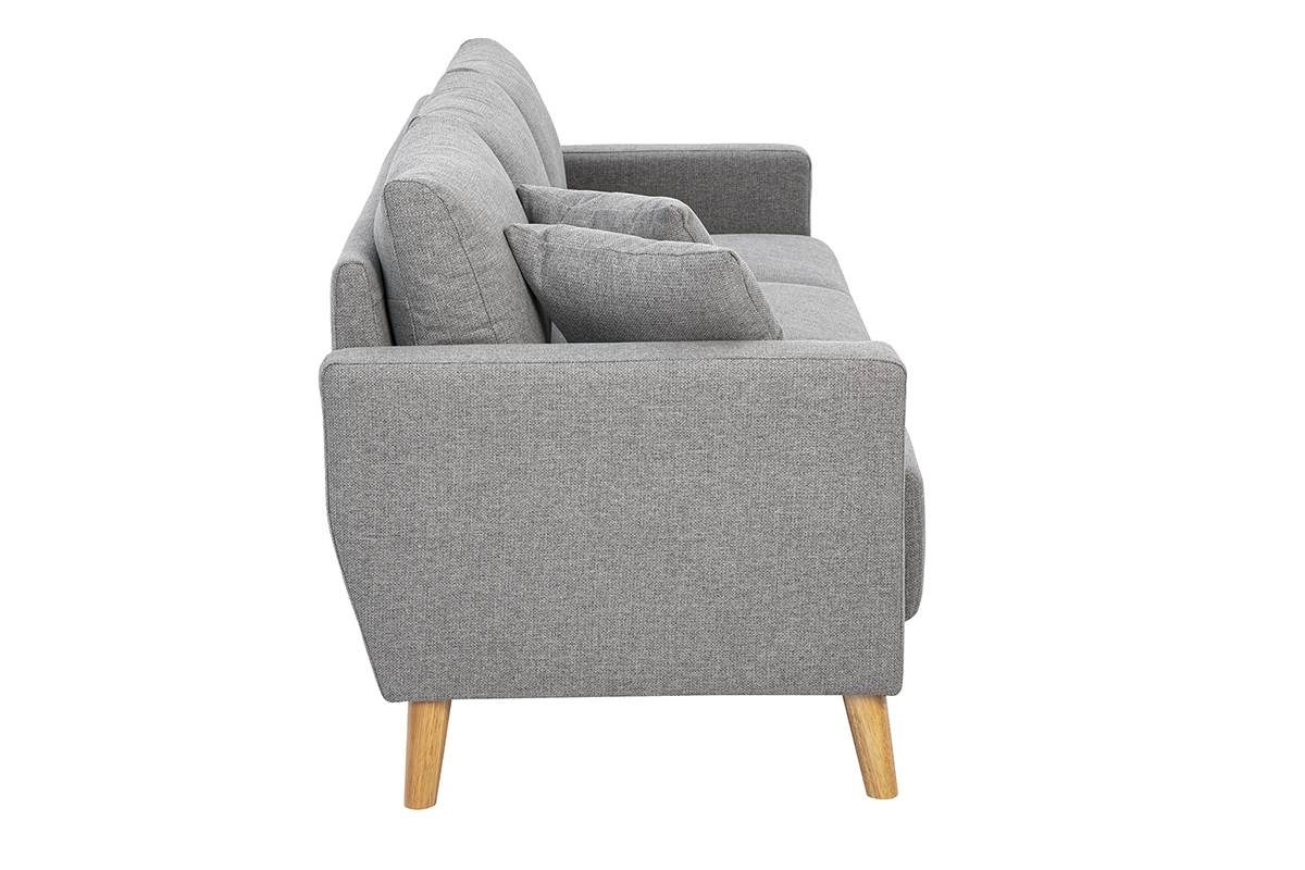 Ce canapé (L193 x P77.5 x H80 cm) a été conçu pour accueillir confortablement 3 personnes. Il combine 3 grands coussins de dossier ultra moelleux (rembourrage en fibres de polyester) à une assise composée de 3 couches de mousse (densités 28, 18 et 22 kg/m³) offrant un accueil souple et un maintien ferme. Deux petits coussins d'appoint (L34 x L34 cm) complètent l'ensemble pour toujours plus de confort.
