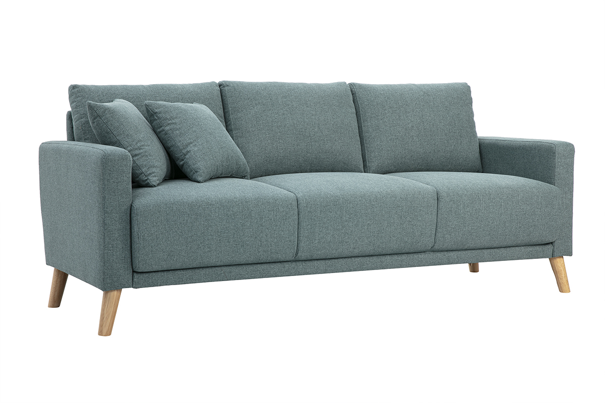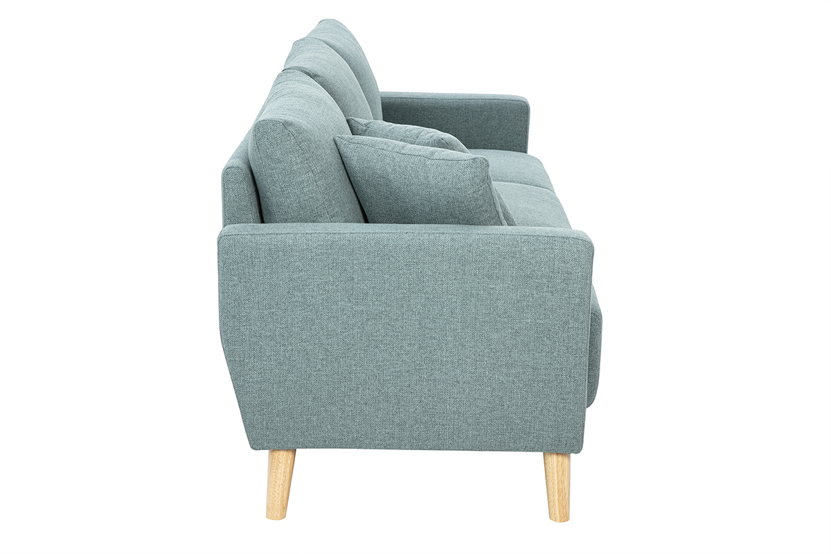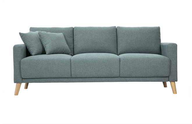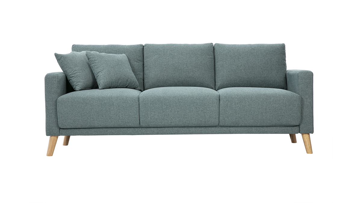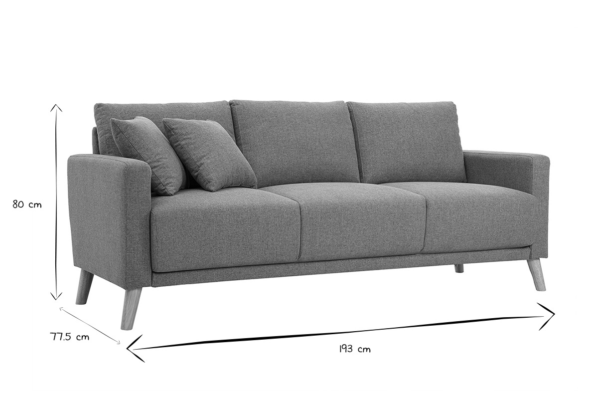 Ce canapé (L193 x P77.5 x H80 cm) a été conçu pour accueillir confortablement 3 personnes. Il combine 3 grands coussins de dossier ultra moelleux (rembourrage en fibres de polyester) à une assise composée de 3 couches de mousse (densités 28, 18 et 22 kg/m³) offrant un accueil souple et un maintien ferme. Deux petits coussins d'appoint (L34 x L34 cm) complètent l'ensemble pour toujours plus de confort.