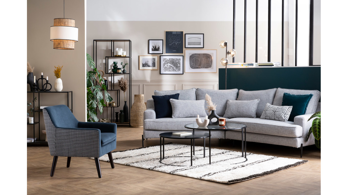Le chic à la française a toute sa place dans le salon. Avec ce canapé 5 places, un tapis XXL et une belle table basse design, on joue la carte de l'élégance.