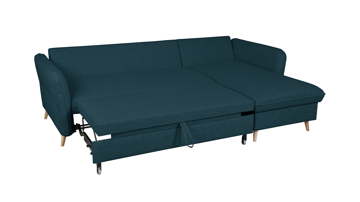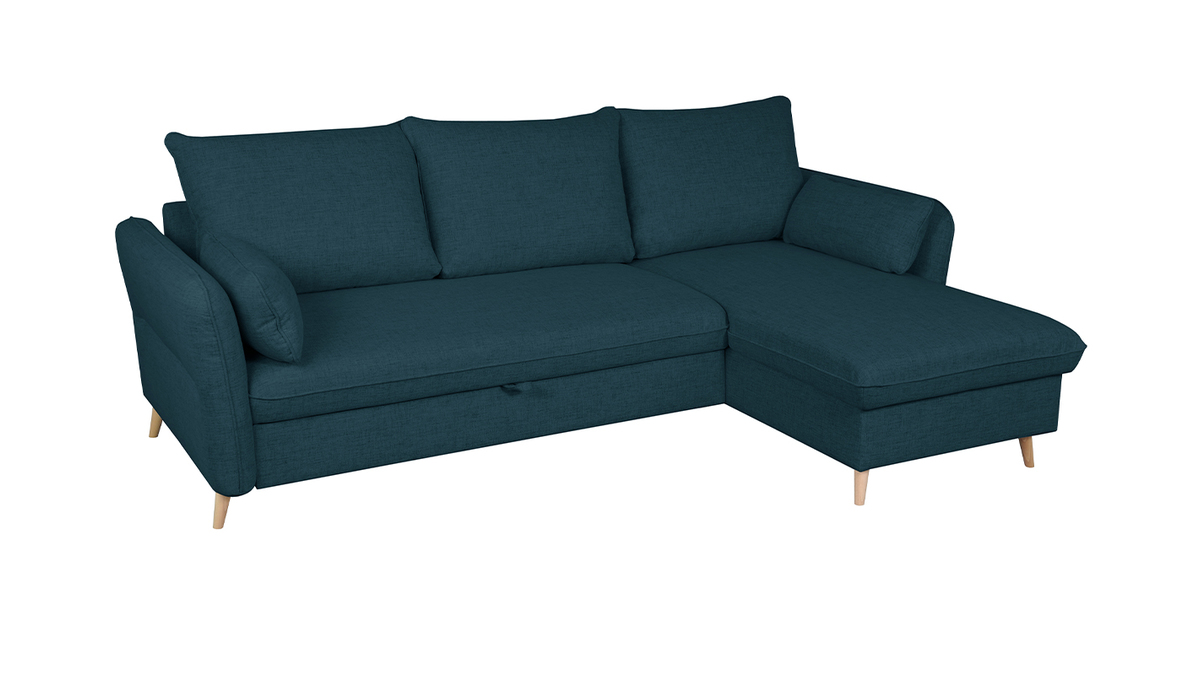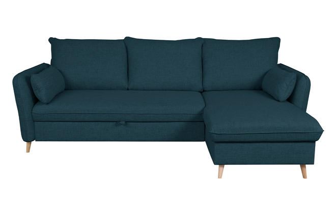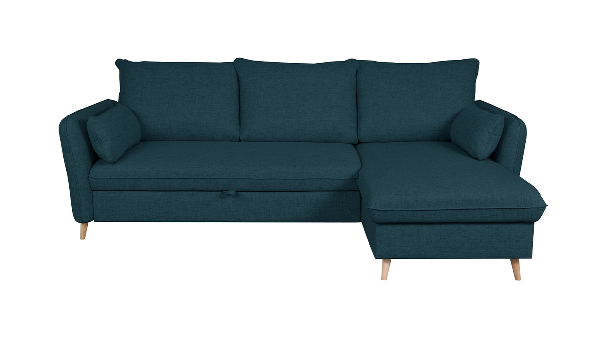 Ce canapé d'angle voit les choses en grand. Canapé, lit, rangement... DRISS est un canapé trois-en-un aux dimensions généreuses et au style superbe. Un joli revêtement en polyester enveloppe assise et dossier pour un rendu ultra cosy. Il est complété par quatre pieds en bois massif, aussi solides que déco. Grâce à son style scandinave affirmé, ce canapé d'angle convertible bleu océan est un indémodable facile à vivre. Avec son épais rembourrage et ses jolis angles arrondis, ce n'est pas une assise de salon classique : c'est une véritable invitation à la détente.