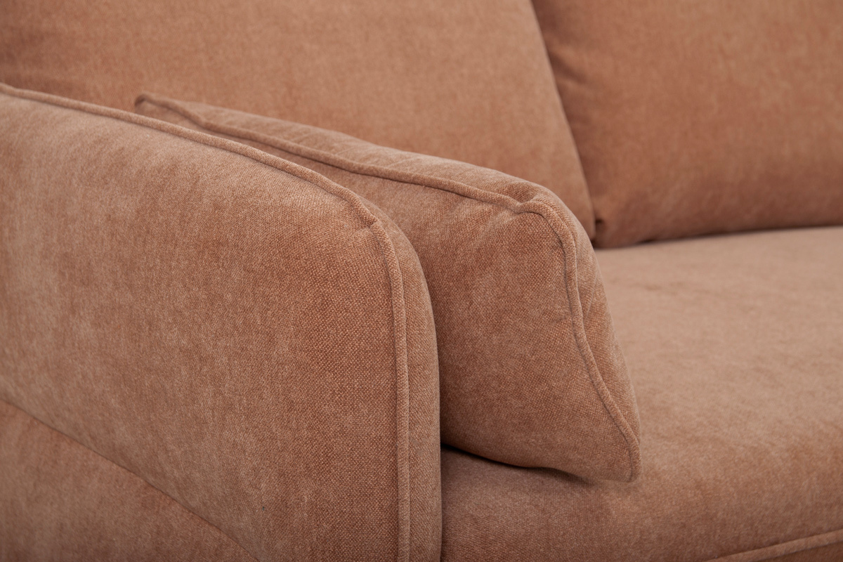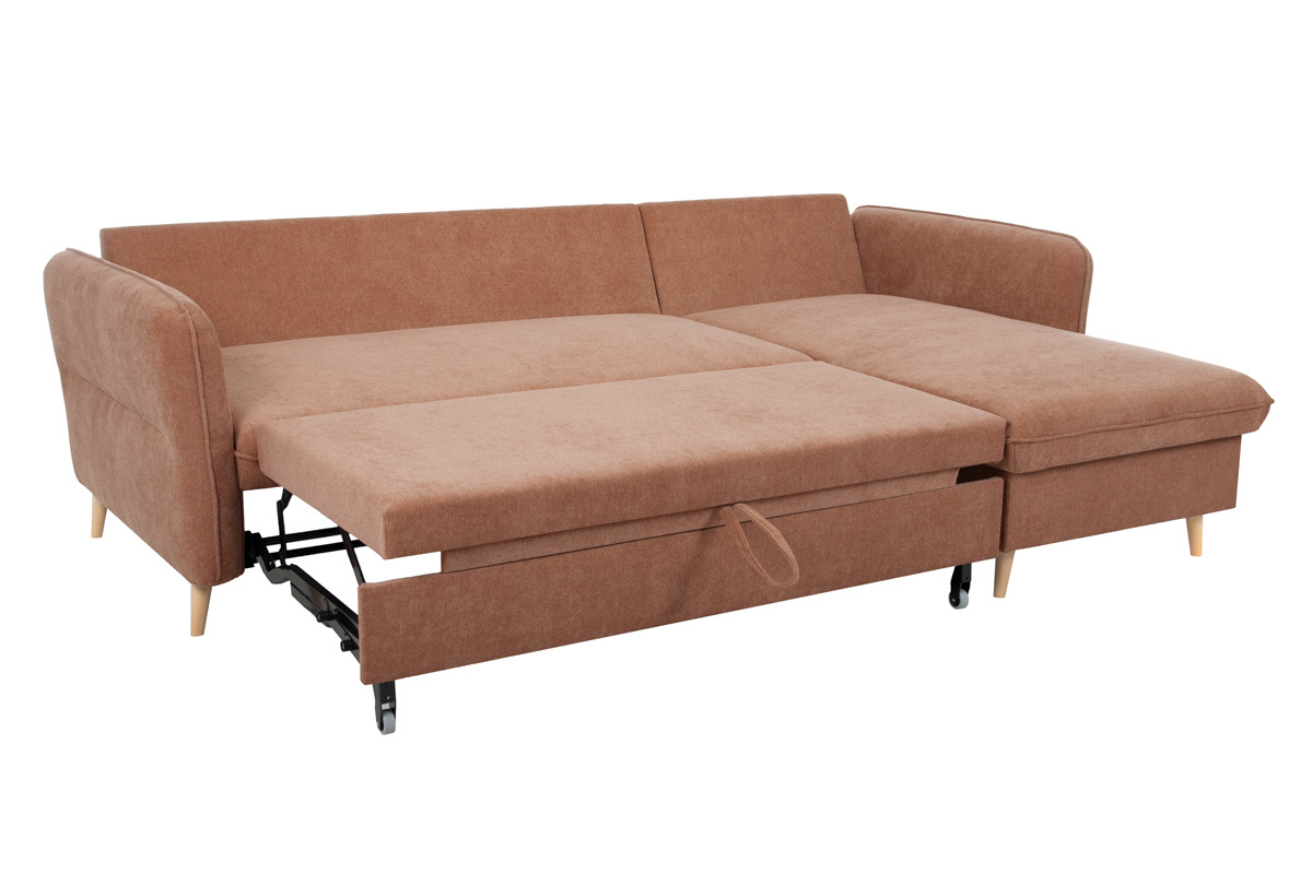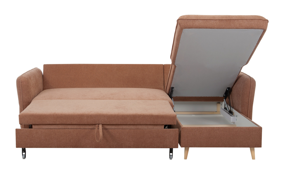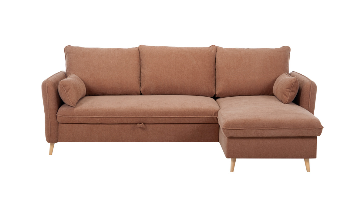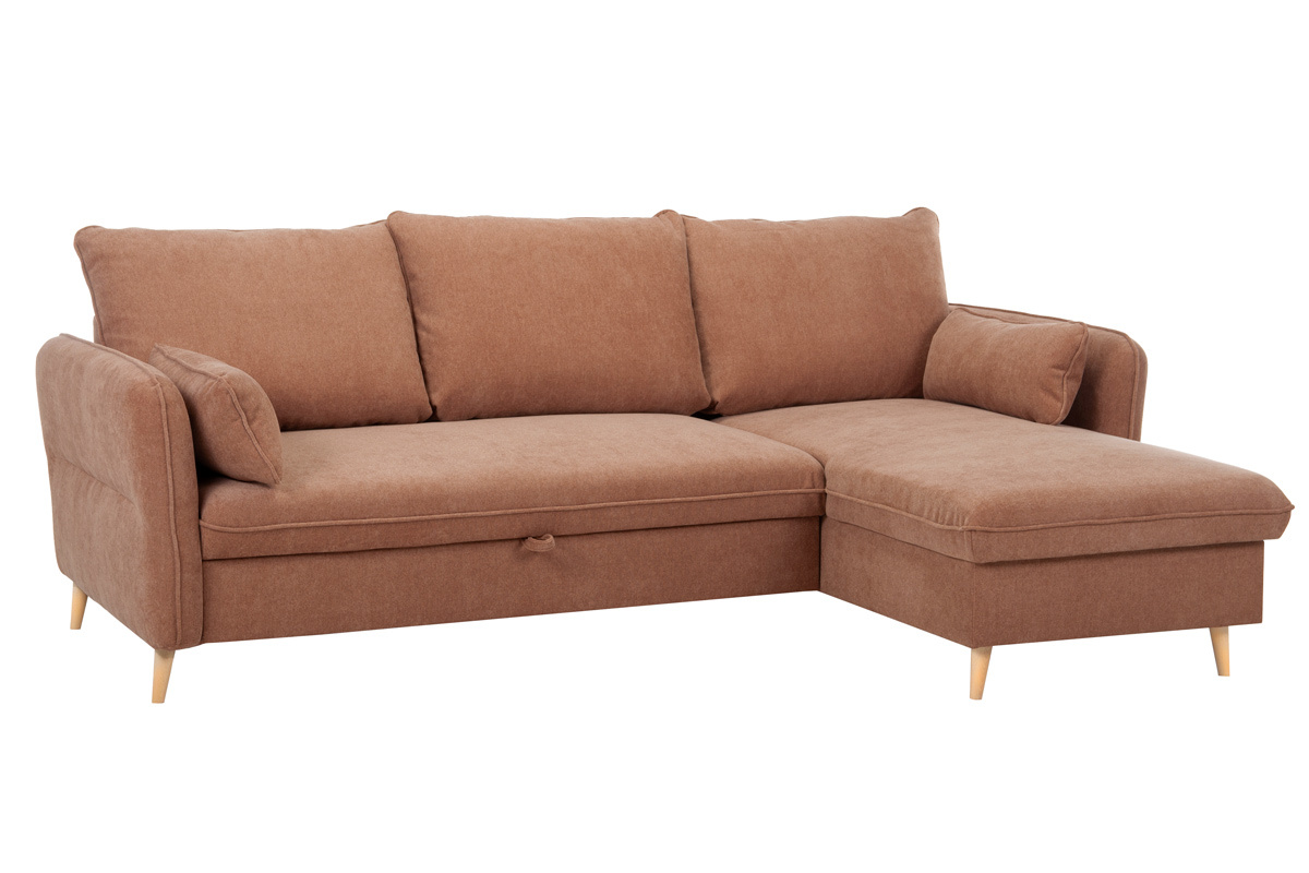 Ce canapé d'angle terre brûlée est réversible : vous pouvez positionner l'angle à droite comme à gauche. Le revêtement de ce canapé scandinave est en tissu déperlant pour faciliter son entretien.