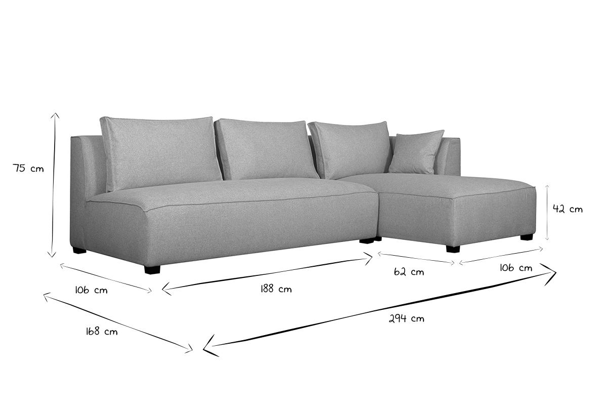 Le canapé d'angle droit PLURIEL comprend deux éléments indépendants : une chauffeuse 2 places et une méridienne. Associées, elles forment un beau canapé d'angle droit contemporain, aux dimensions généreuses (L294 x P106-168 x H75 cm). Utilisées séparement, elles sont parfaites pour des réunions conviviales dans les petits salons. Chaque élément est équipé de coussins d'appoint et offre un très bon confort d'assise. Avec sa ligne massive et son coloris intemporel, ce canapé d'angle modulable a tout pour devenir l'indispensable des salons cosy.
