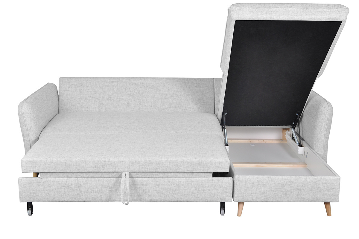 Le rembourrage de ce canapé d'angle réversible est composé de deux couches de mousse, une couche de mousse haute résilience pour la tenue et une couche de ouate pour le confort. Une fois l'assise tirée, ce convertible offre une belle surface de couchage (L140 x L205 cm) pouvant accueillir 2 personnes. La méridienne renferme un coffre de rangement, pratique pour le linge de lit.