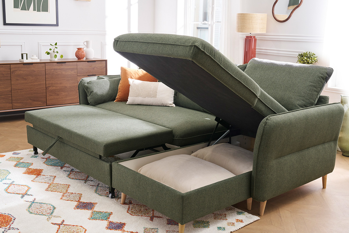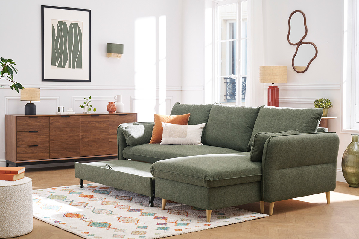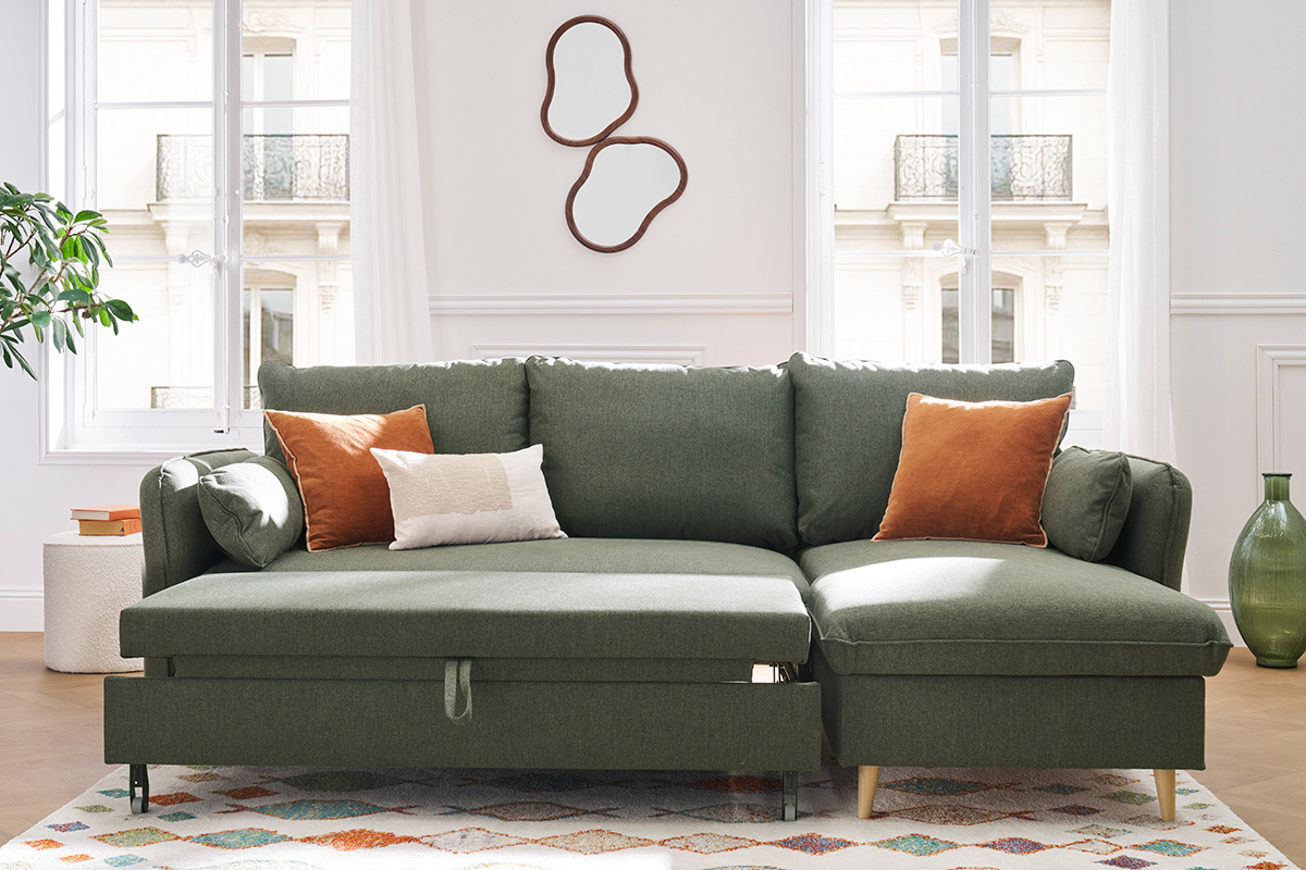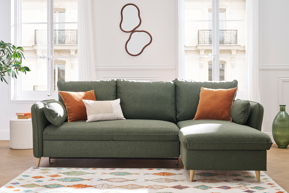 Canapé-lit vert kaki fabriqué en Europe. Livré prêt à monter.