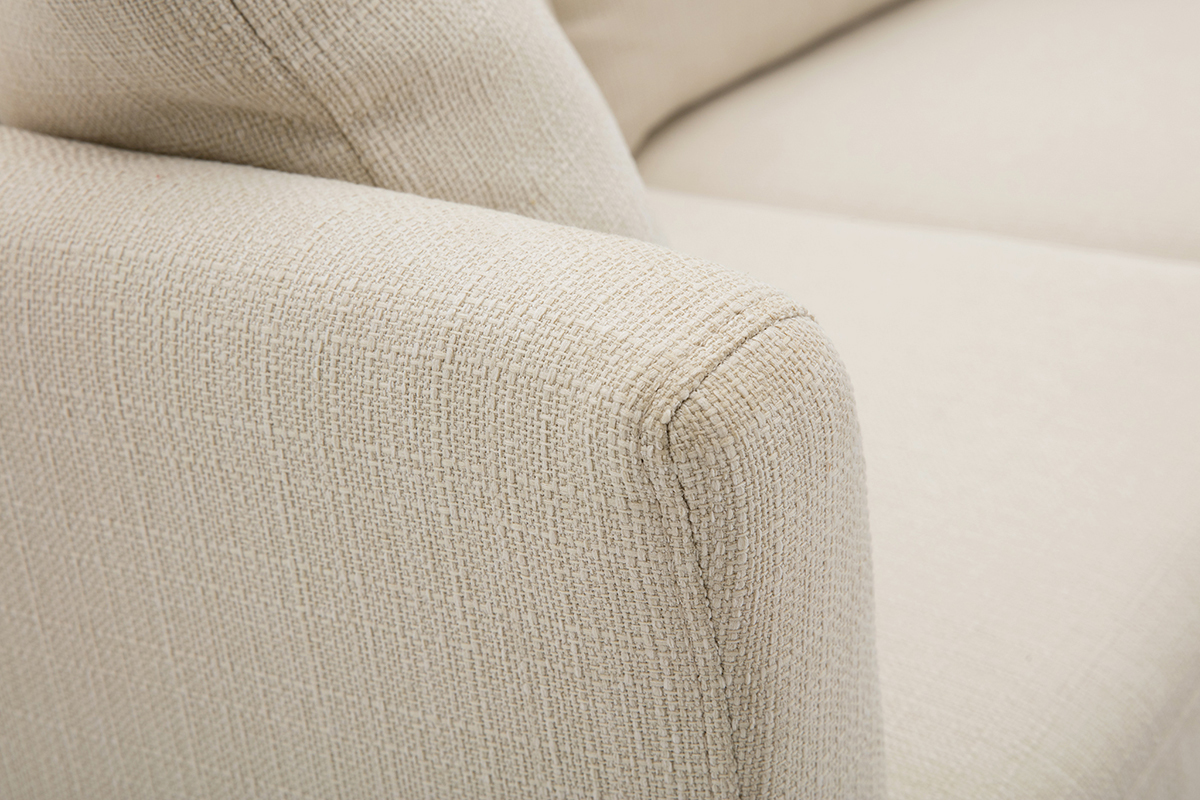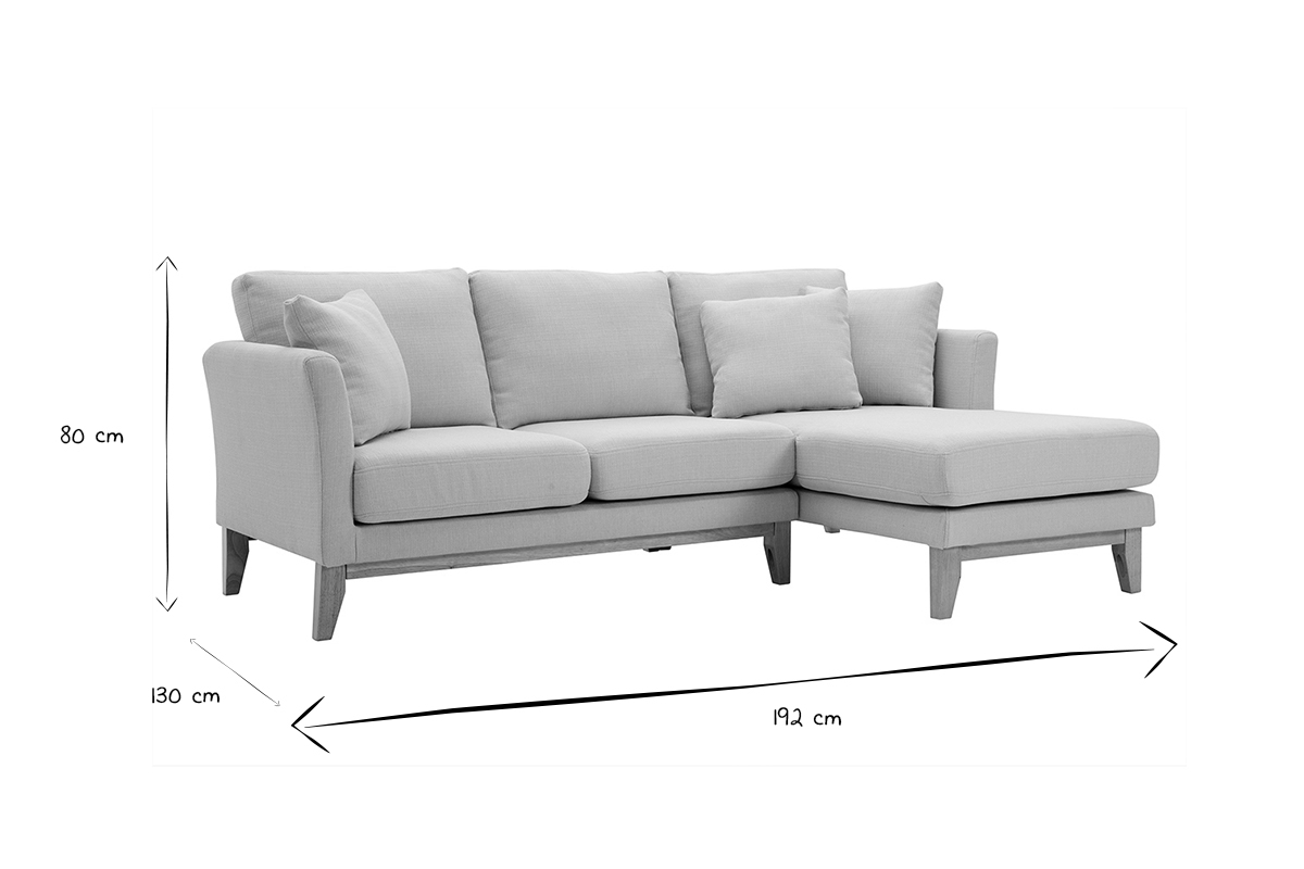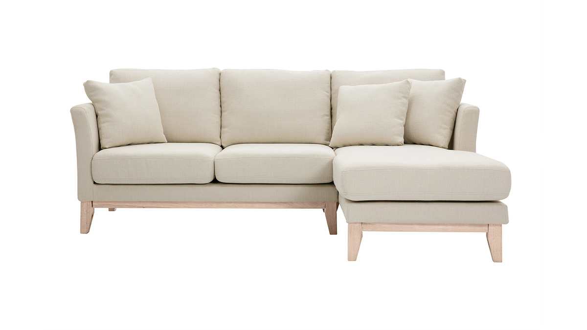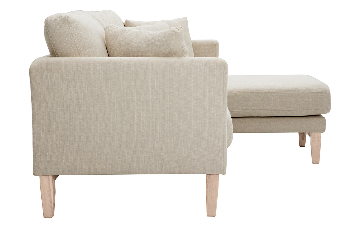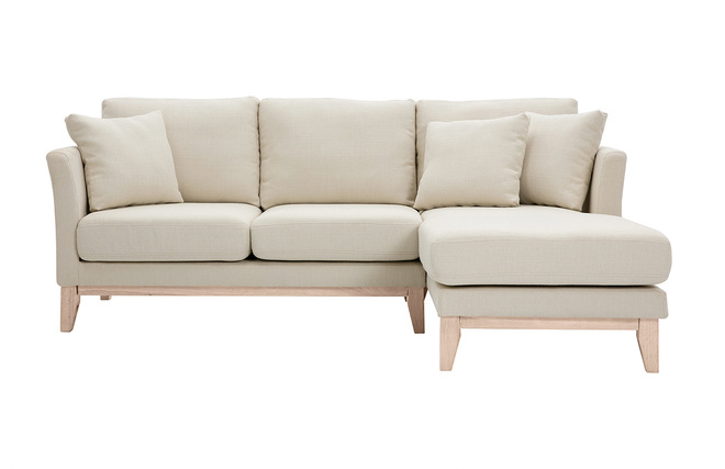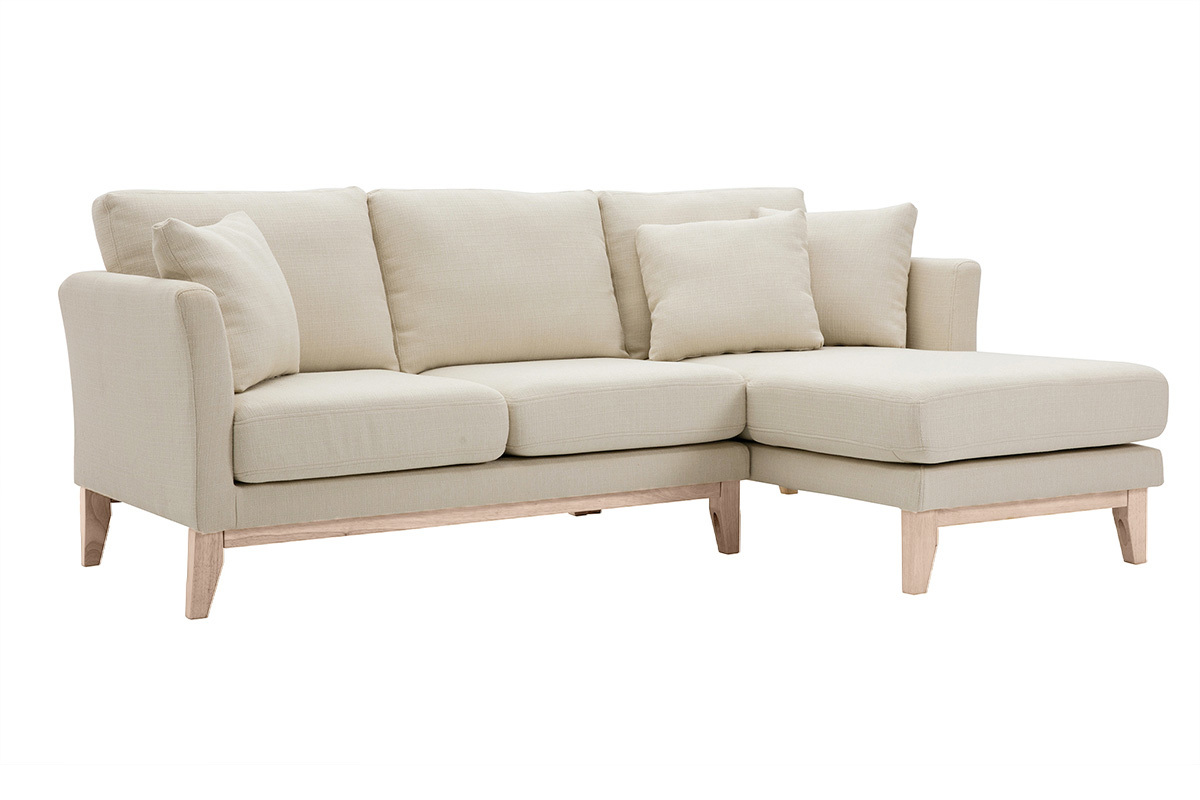 Canapé d'angle droit déhoussable scandinave en tissu beige et bois clair 4 places OSLO livré prêt à assembler. Montage simple, seuls les pieds sont à fixer. Les colis étant volumineux, nous vous conseillons de vérifier que portes et escaliers permettent leur passage.