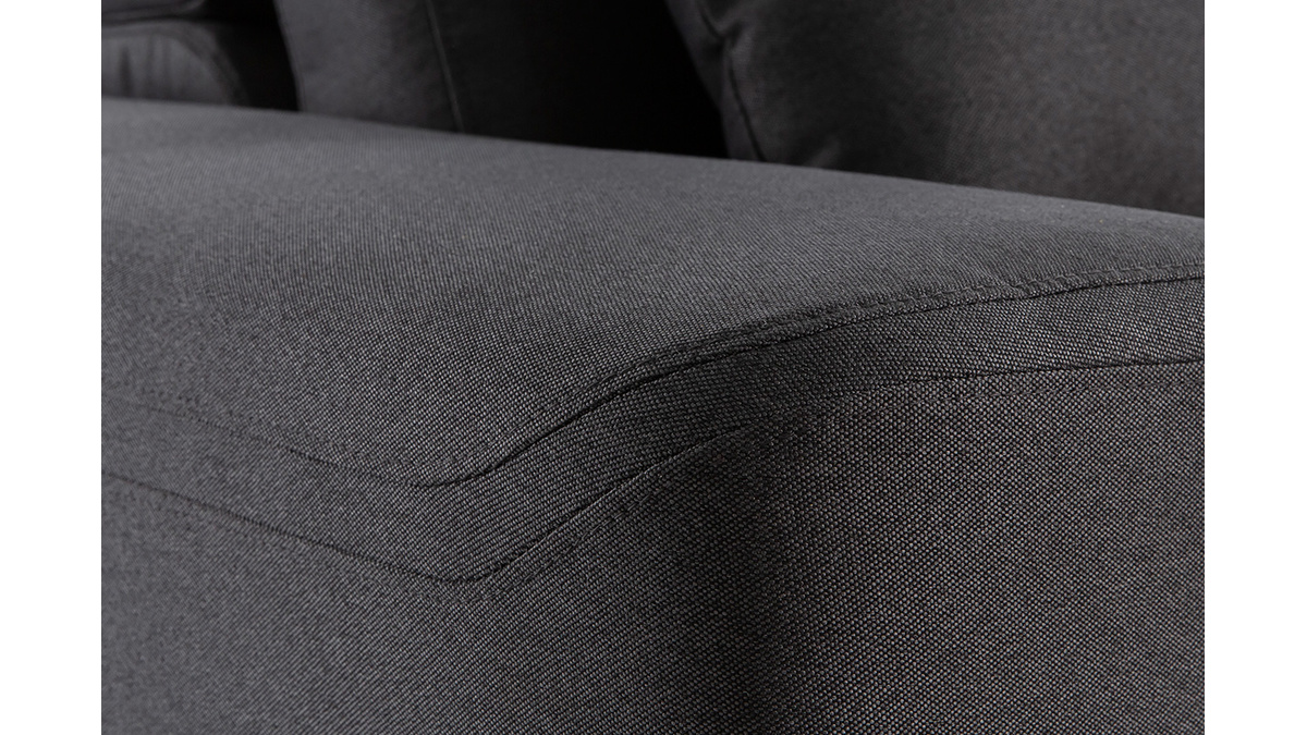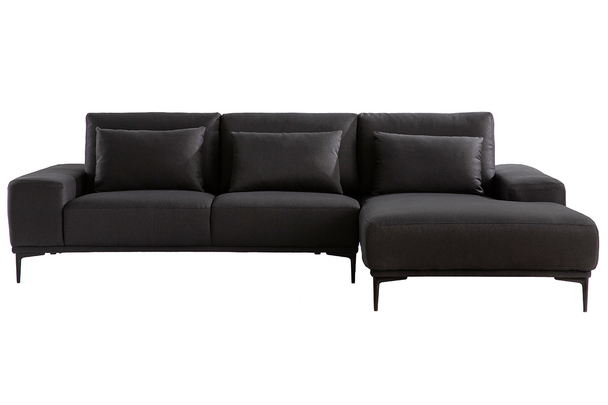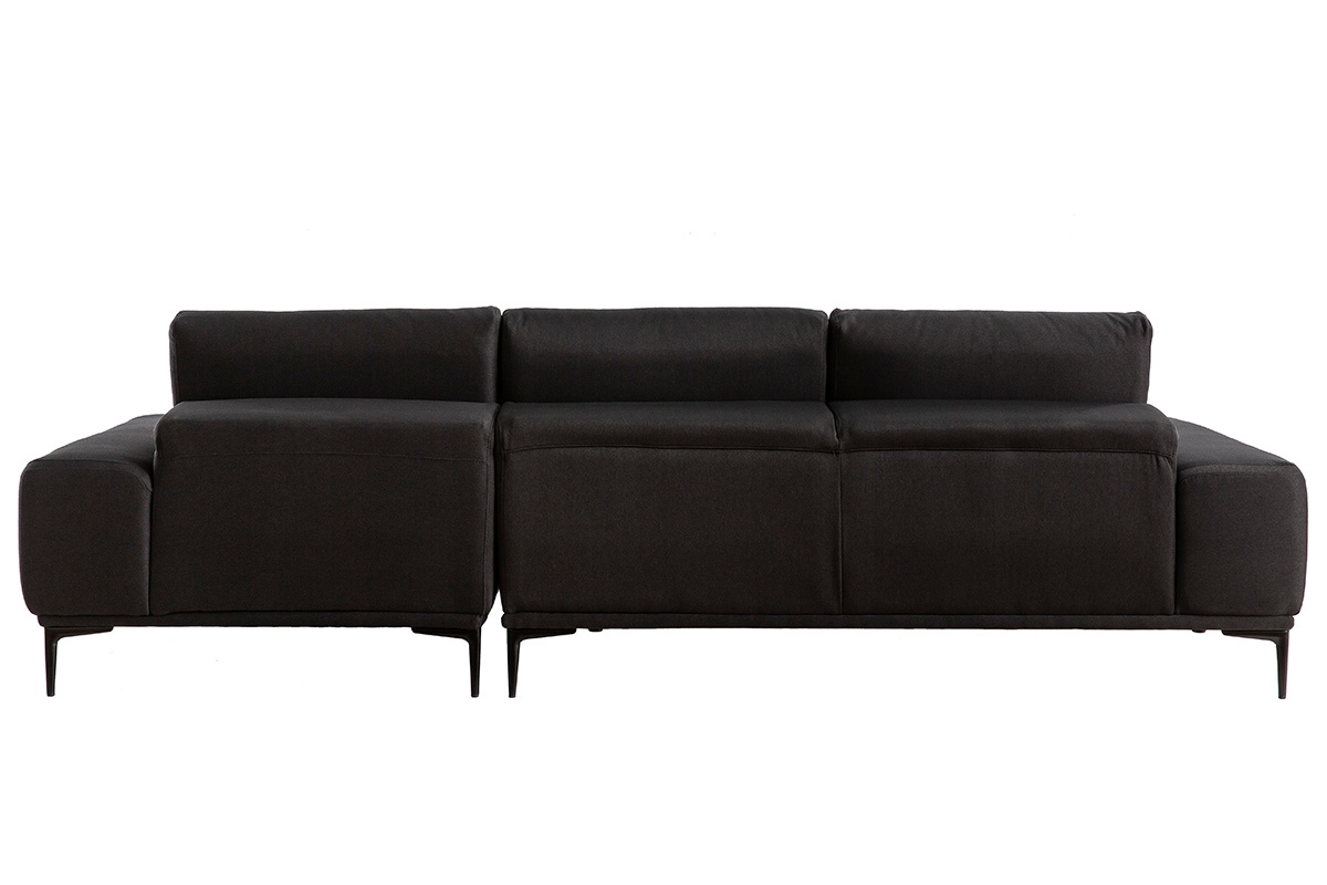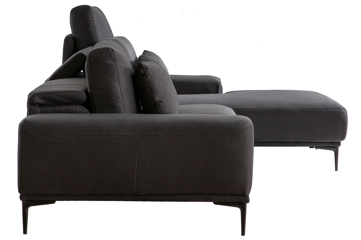 Le salon s'équipe enfin d'un siège design au format XXL. Un magnifique piètement fuselé, une assise épaisse et massive, une ligne minimaliste... le canapé d'angle KONRAD réunit tout ce qui fait le succès des canapés contemporains. Avec son joli revêtement en polyester gris foncé et ses quatre pieds en métal noir travaillés tout en finesse, il fera du séjour une pièce moderne où le design est roi.