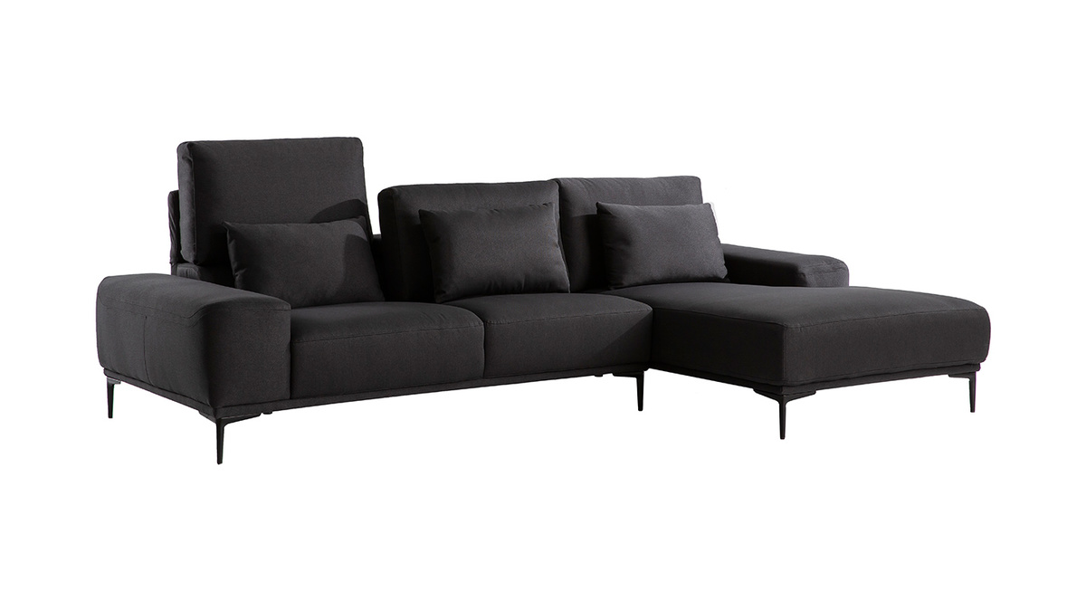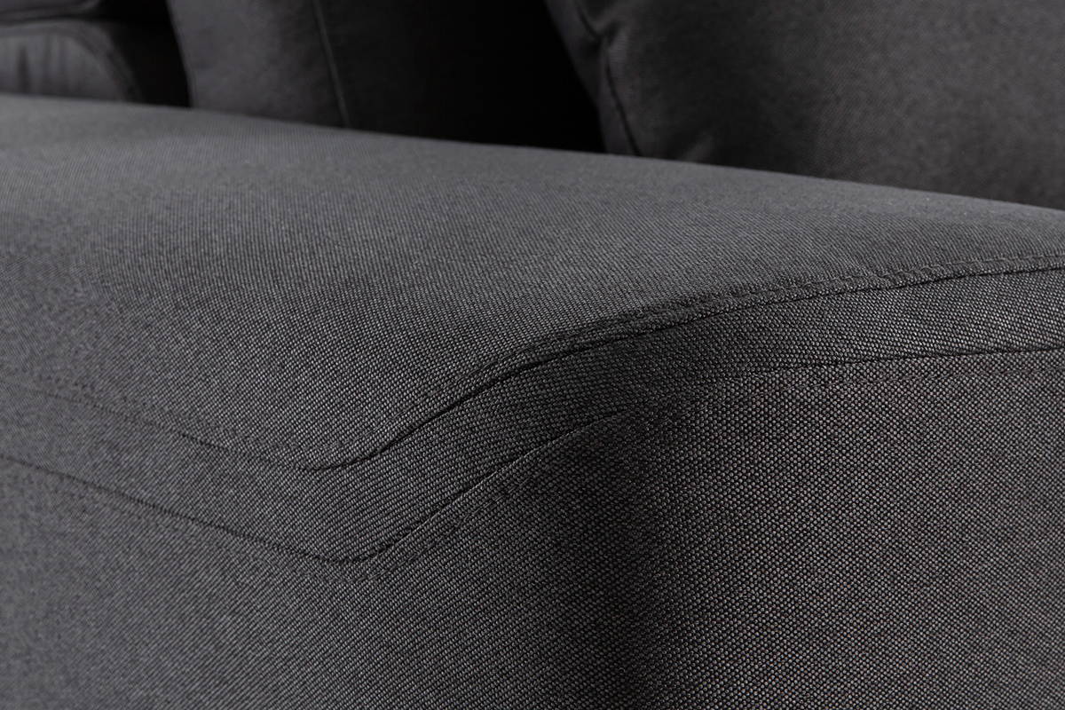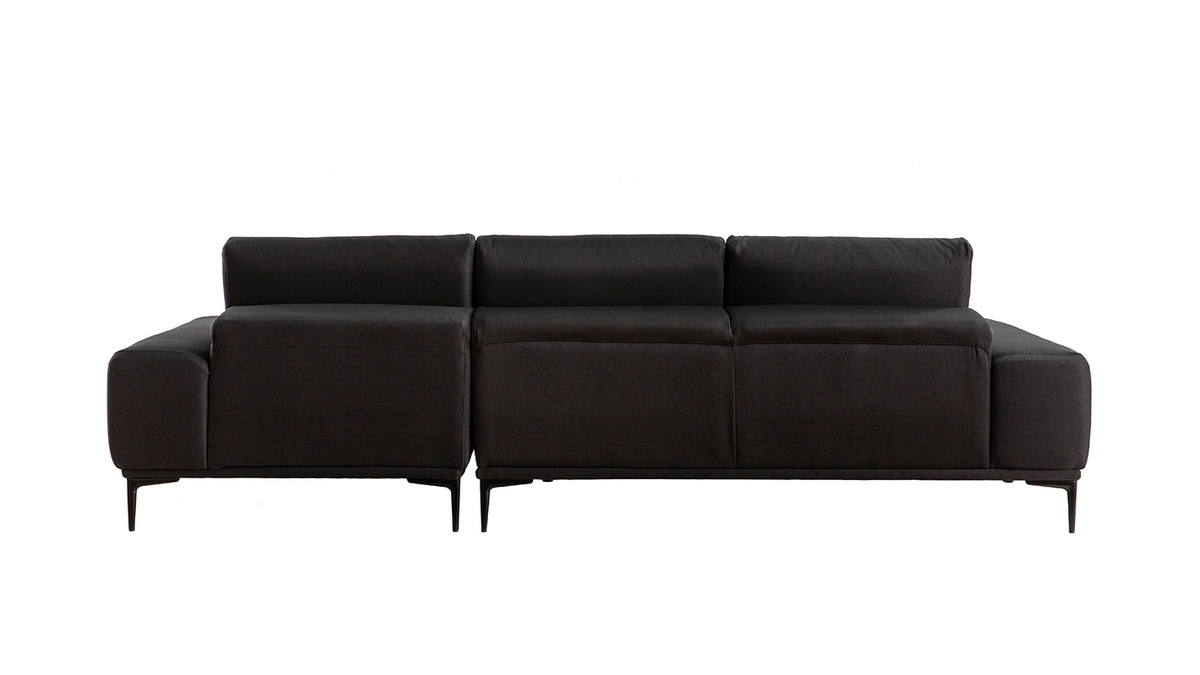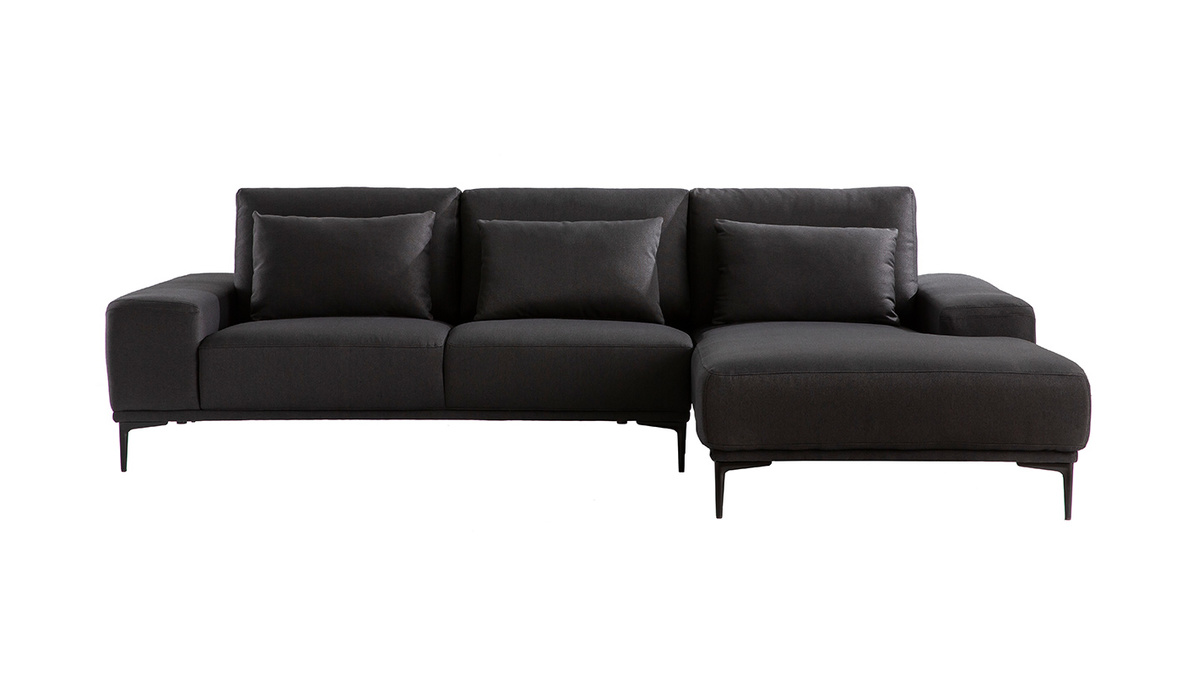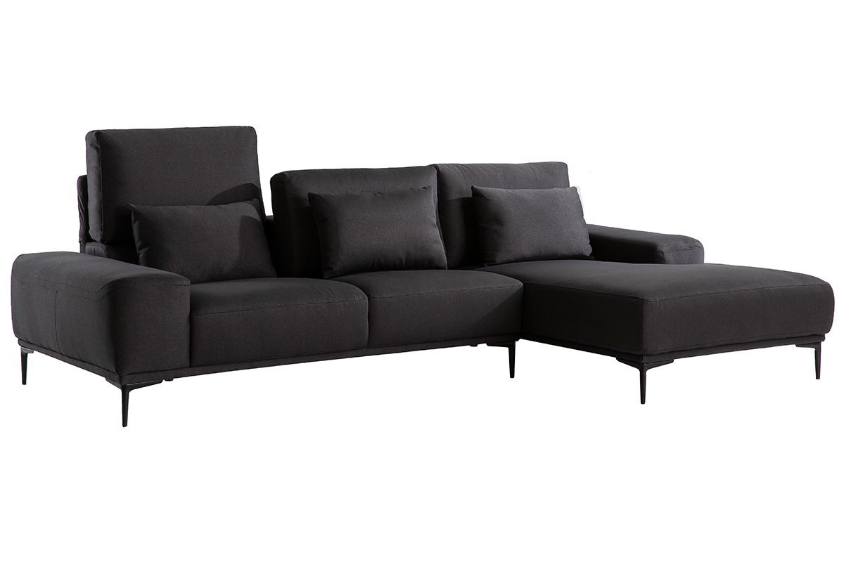 Le salon s'équipe enfin d'un siège design au format XXL. Un magnifique piètement fuselé, une assise épaisse et massive, une ligne minimaliste... le canapé d'angle KONRAD réunit tout ce qui fait le succès des canapés contemporains. Avec son joli revêtement en polyester gris foncé et ses quatre pieds en métal noir travaillés tout en finesse, il fera du séjour une pièce moderne où le design est roi.