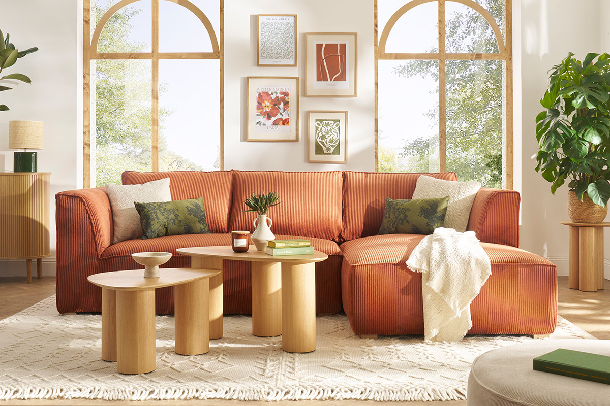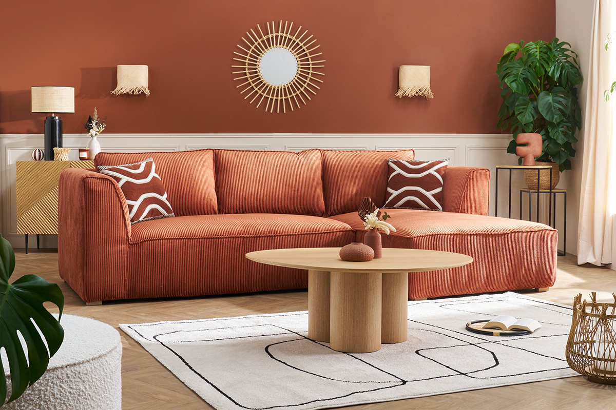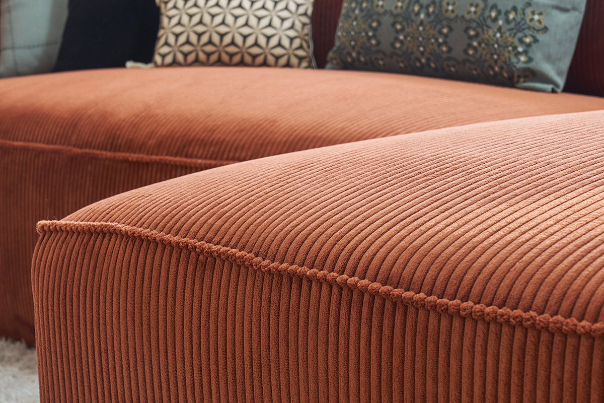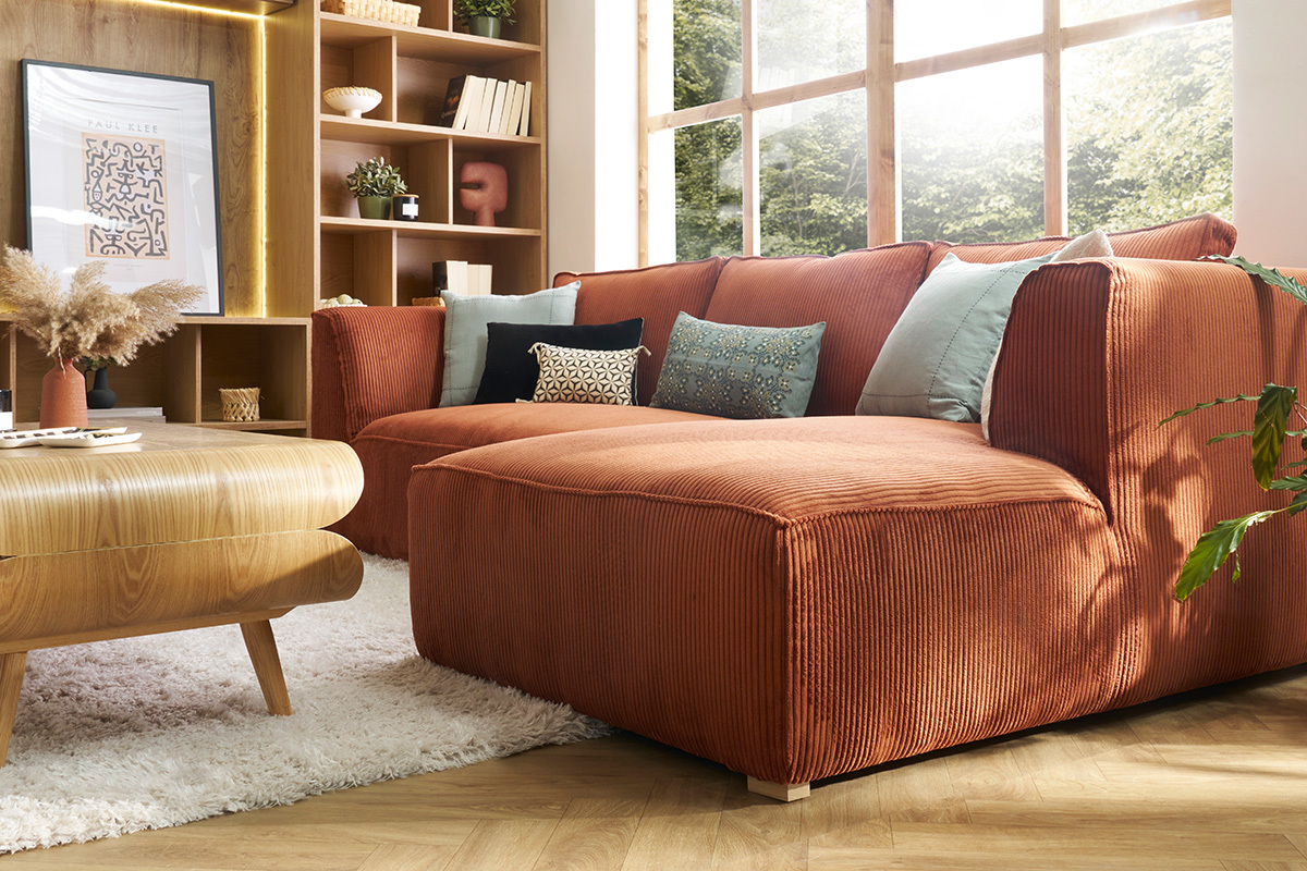 Avec le canapé d'angle droit PANAM, le séjour s'apprête à revêtir un superbe gant de velours... côtelé !