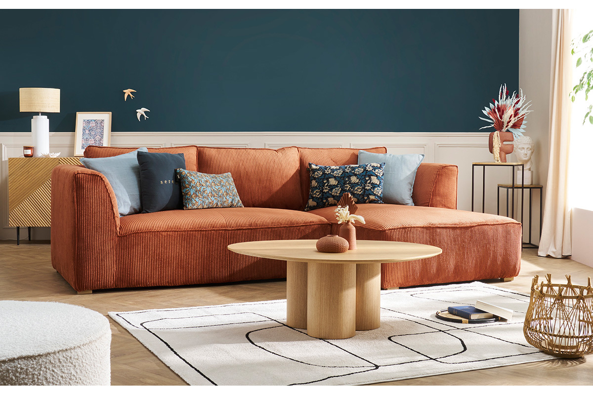 Élégant, design, contemporain... mais aussi cosy et ultra cocooning : PANAM, c'est LE canapé frenchy par excellence. Habillé d'un beau tissu en velours côtelé à la douce et chaleureuse couleur terre brûlée, il met à l'honneur cette matière au toucher délicat et au bel effet de relief à la perfection. Tendance, ce canapé d'angle terre brûlée 3-4 places sublime son revêtement texturé en arborant une silhouette aux jolies lignes simples et rebondies.