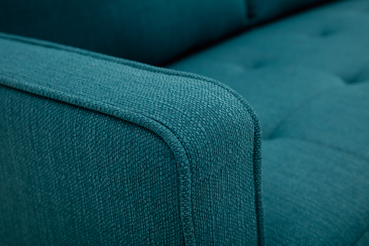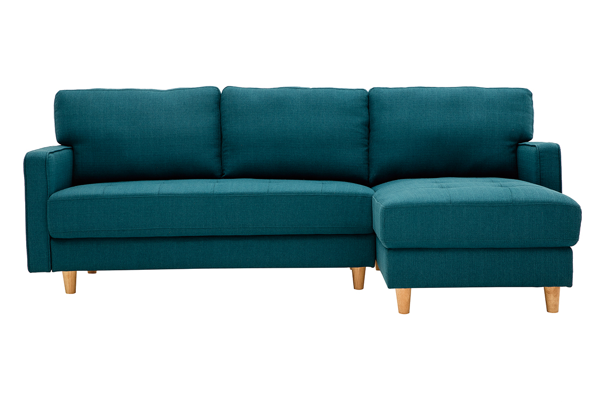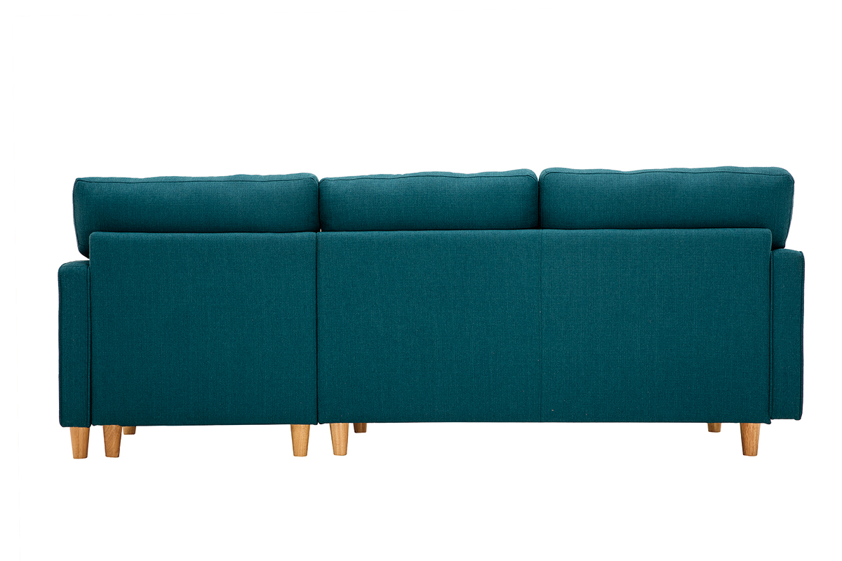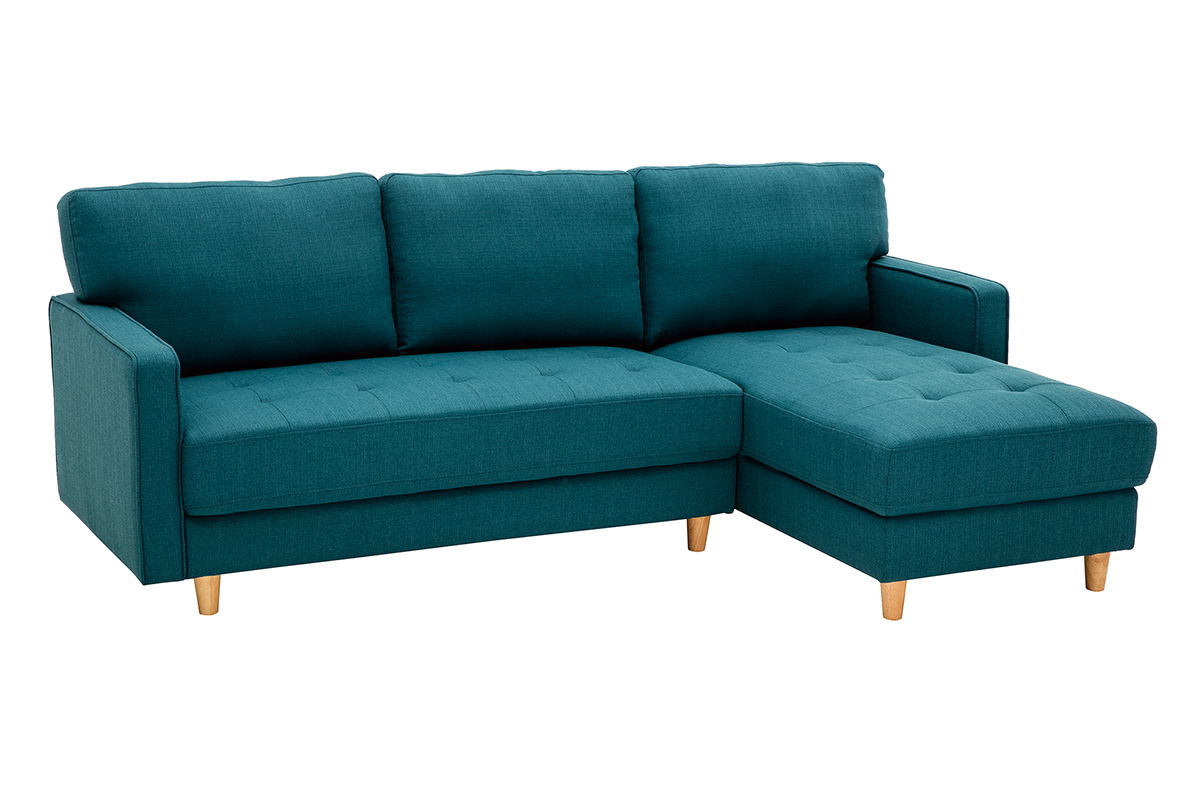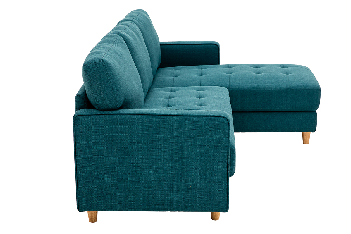 Avec sa silhouette moderne et son assise capitonnée, le canapé d'angle bleu canard CUMBIA mélange les styles avec brio. Esprit classique et ligne contemporaine se côtoient pour un résultat au charme unique. Revêtu d'un magnifique tissu 100 % polyester bleu canard et équipé d'un solide piètement en bois massif, ce canapé est un intemporel, facile à marier à différents styles déco.