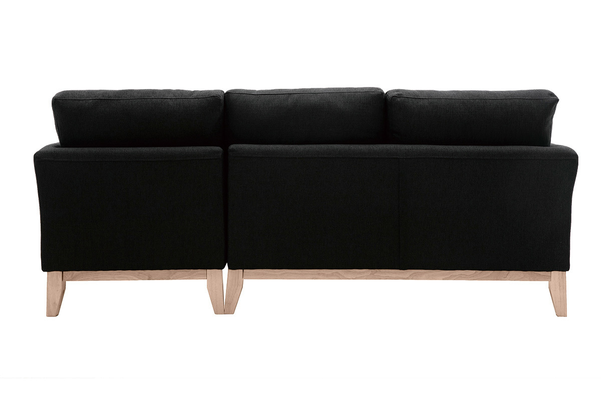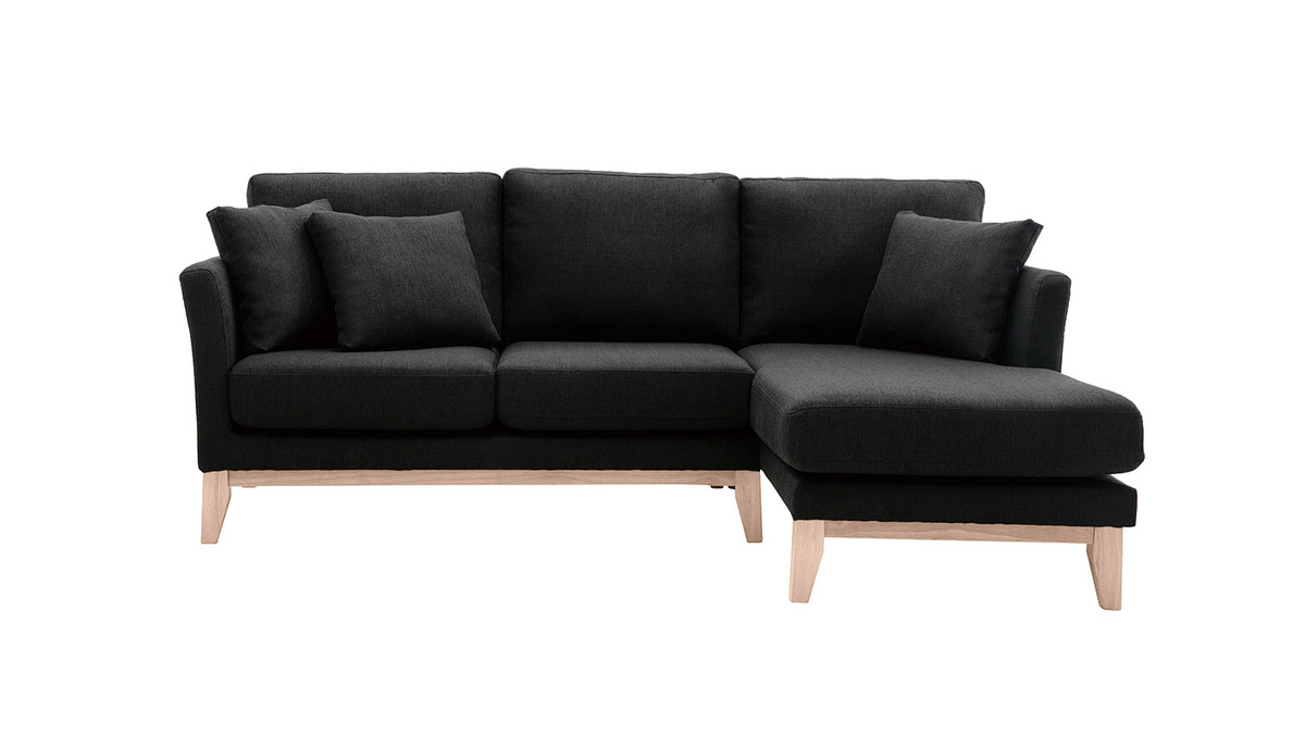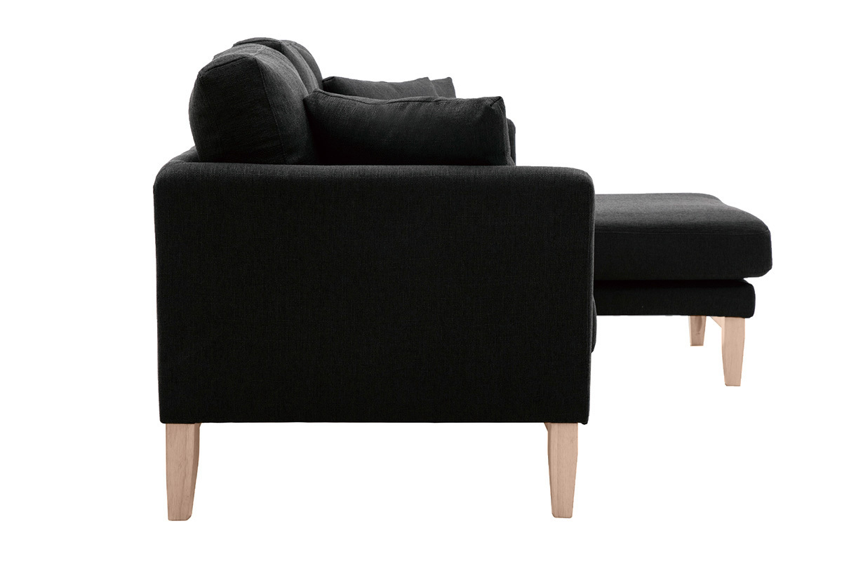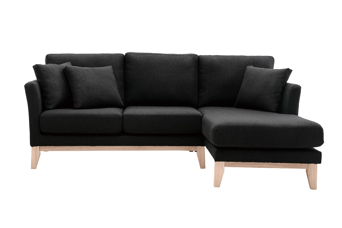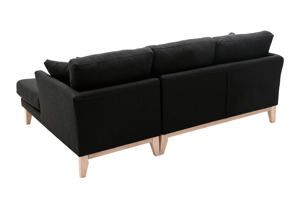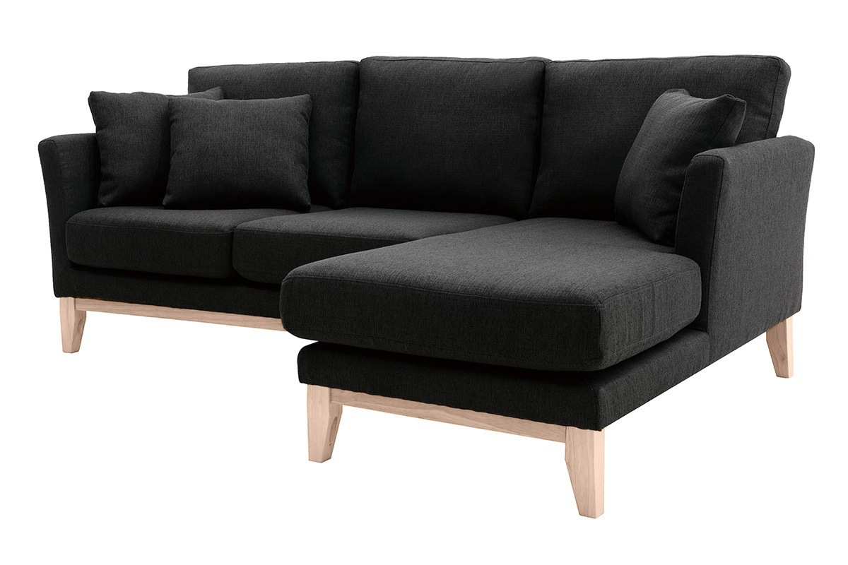 Canapé d'angle droit déhoussable scandinave en tissu gris foncé et bois clair 4 places OSLO livré prêt à assembler. Montage simple, seuls les pieds sont à fixer. Les colis étant volumineux, nous vous conseillons de vérifier que portes et escaliers permettent leur passage.