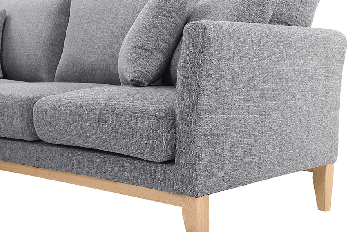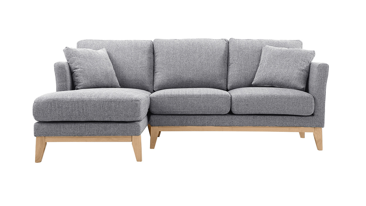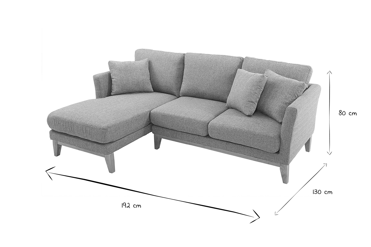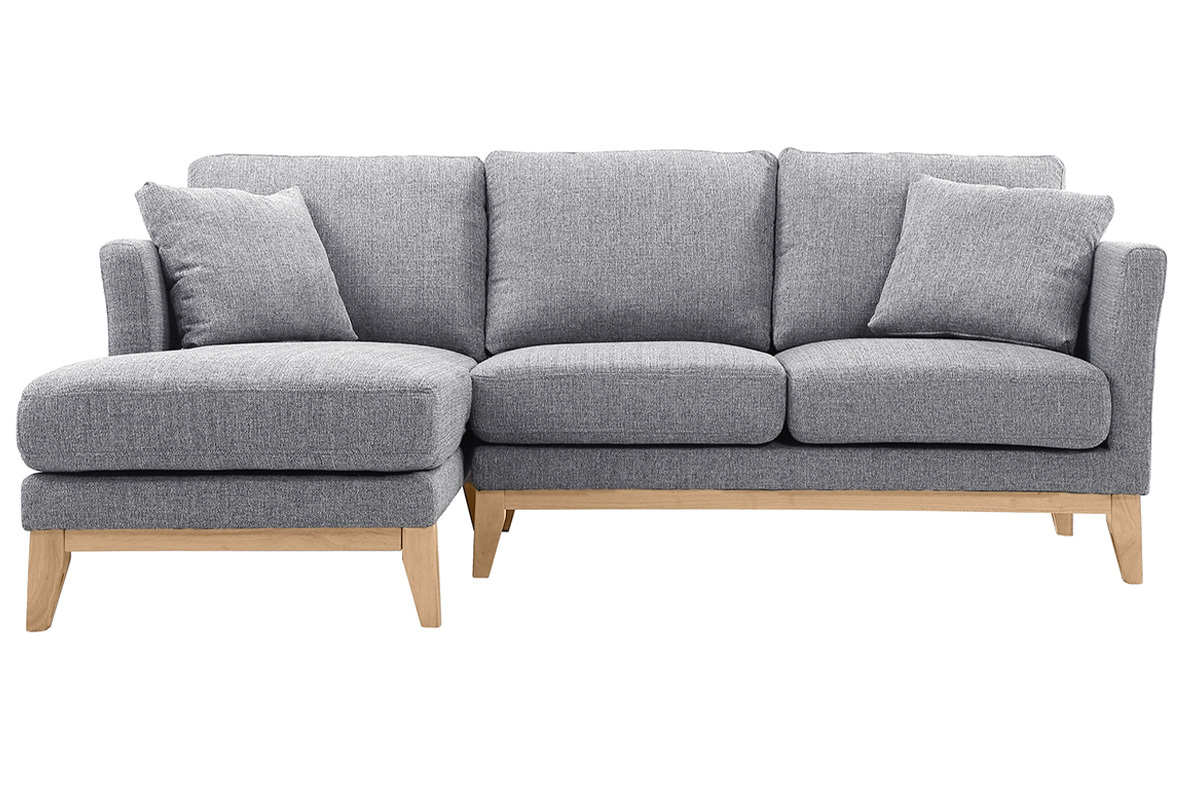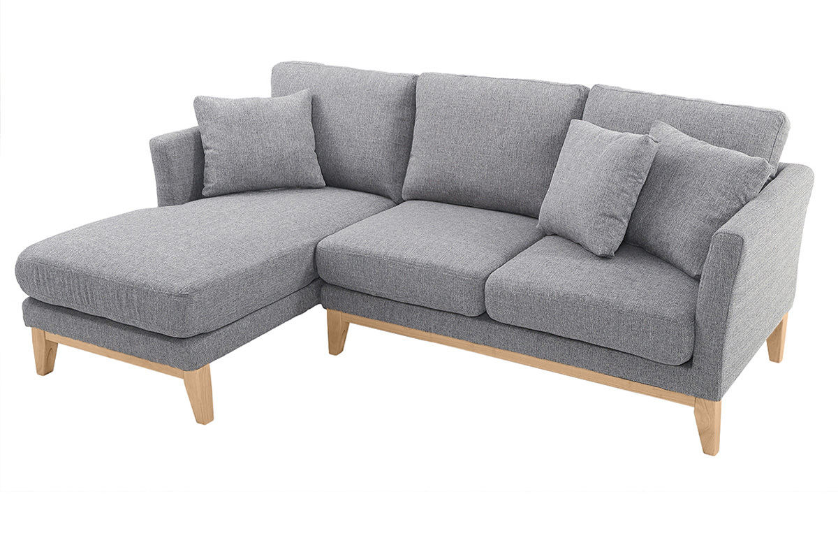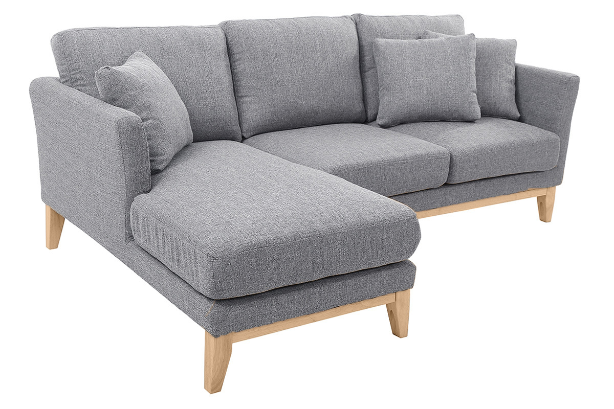 Canapé d'angle gauche déhoussable scandinave en tissu gris clair et bois clair 3-4 places livré prêt à assembler. Montage simple, seuls les pieds sont à fixer. Les colis étant volumineux, nous vous conseillons de vérifier que portes et escaliers permettent leur passage.