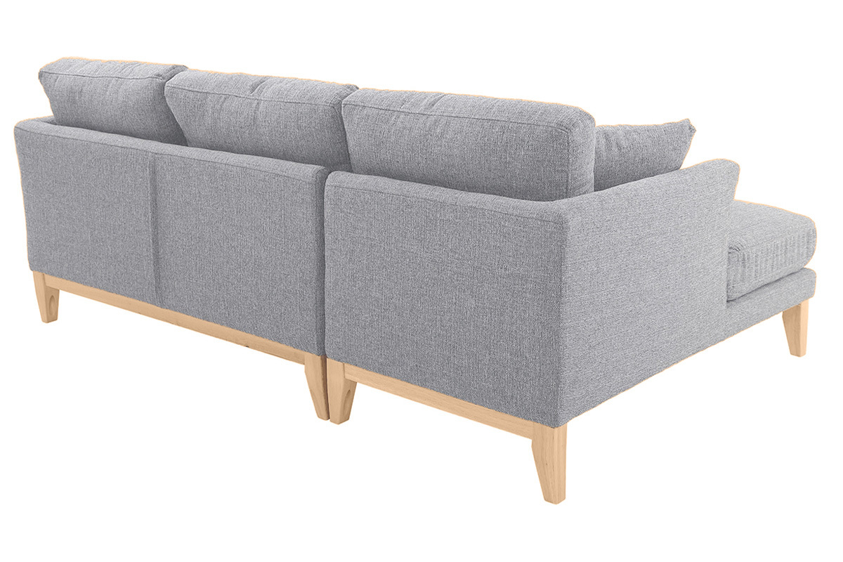 Ce canapé d'angle en tissu gris clair est un concentré de tendance : un piètement en bois clair (hévéa massif) légèrement évasé, une forme simple et épurée typique du design nordique, une couleur douce et lumineuse !