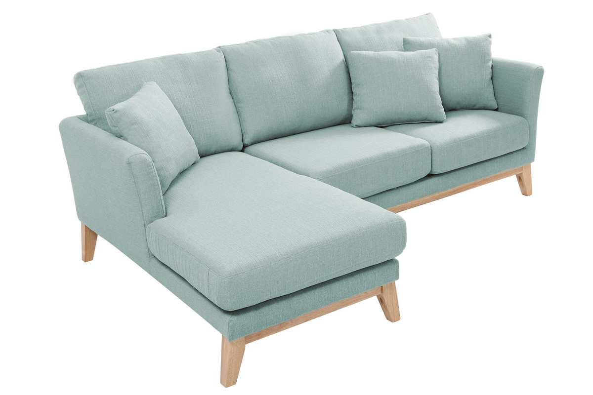 Ce canapé d'angle en tissu vert lagon est un concentré de tendance : un piètement en bois clair (chêne massif) légèrement évasé, une forme simple et épurée typique du design nordique, une couleur douce et lumineuse !