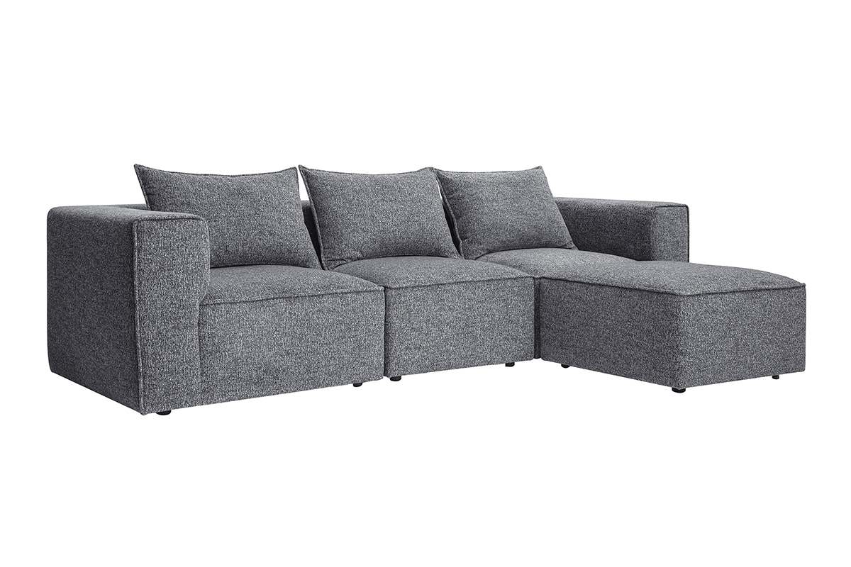 Canapé modulable gris livré prêt à être assemblé. Les modules du canapé se raccordent entre eux à l'aide de deux fixations placées sous chaque module. Ce système de connecteurs coulissants permet un assemblage stable en plus d'une configuration personnalisable. Le colis étant volumineux, nous vous conseillons de vérifier que portes et escaliers permettent son passage.