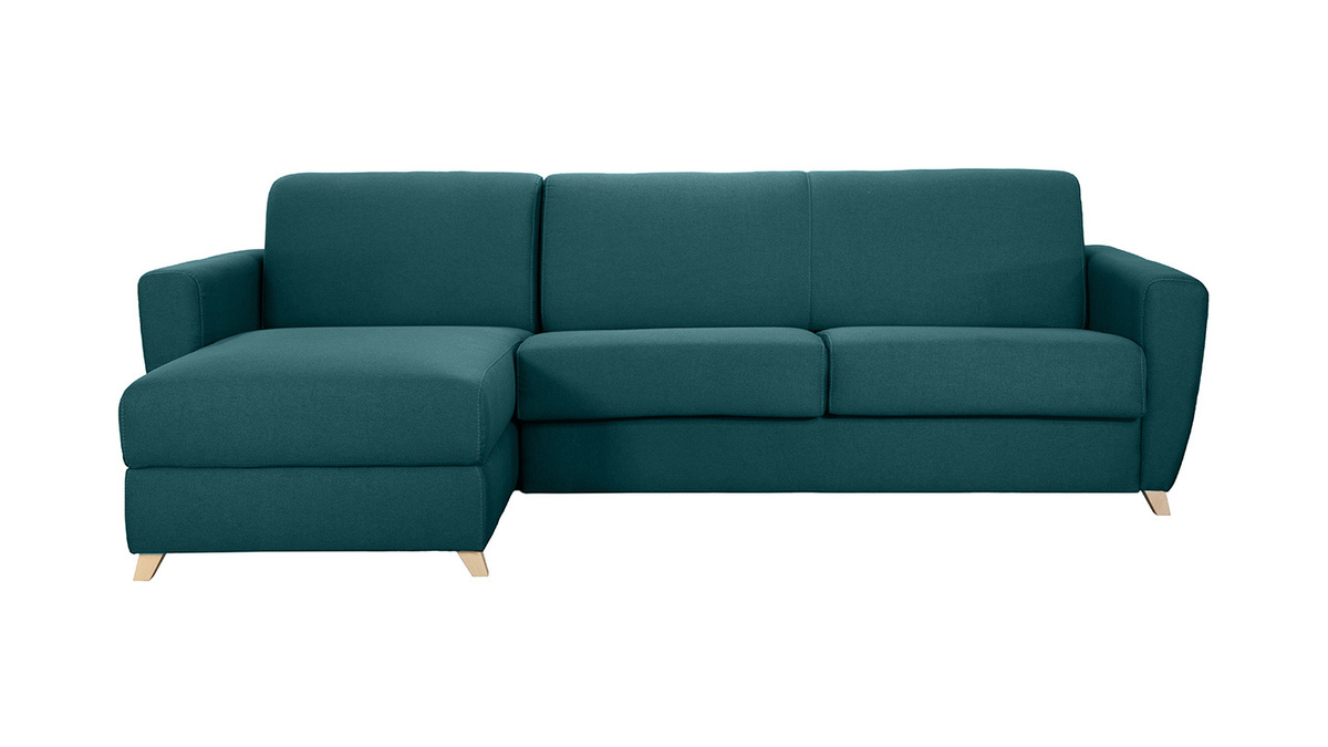 Avec sa belle ampleur d'assise, le canapé d'angle bleu canard GRAHAM est l'allié des salons conviviaux et des grandes maisonnées. Grâce à son angle réversible, il s'adapte à toutes les configurations d'intérieur. Son assise cache également un véritable lit deux places pour faire dormir ses invités. Il suffit de tirer sur le dossier pour déplier instantanément un couchage 140 x 190 cm. La méridienne renferme un grand coffre de rangement pour organiser le linge de lit. Fonctionnel et pratique, ce canapé lit est idéal pour offrir rapidement un couchage supplémentaire confortable. Fabriqué en Italie, c'est un siège de qualité.