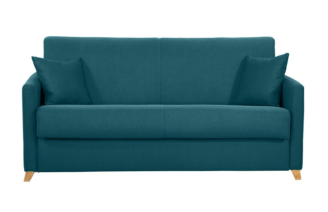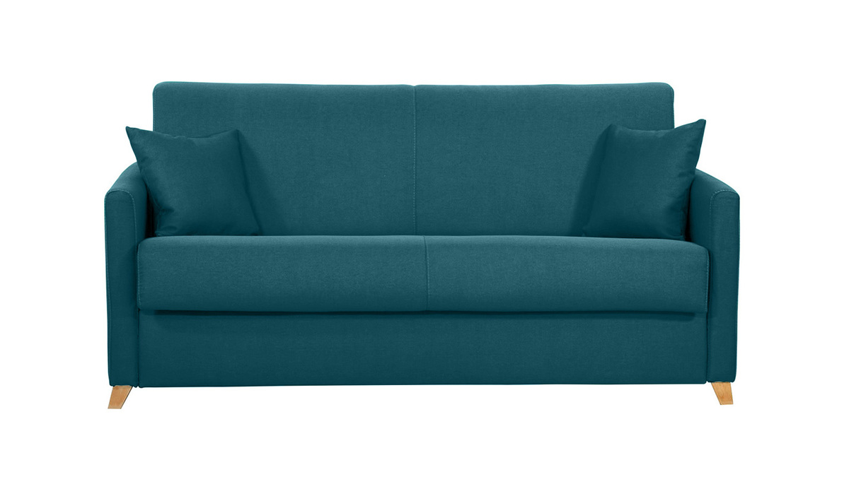Grâce à ses dimensions compactes (L176 x L99-210 x H68-92 cm), ce petit canapé convertible bleu canard est idéal dans les appartements où chaque m² comtpe. Ce canapé gain de place possède deux espaces de rangement intégrés au dossier afin d'offrir tout le confort nécessaire à vos convives.