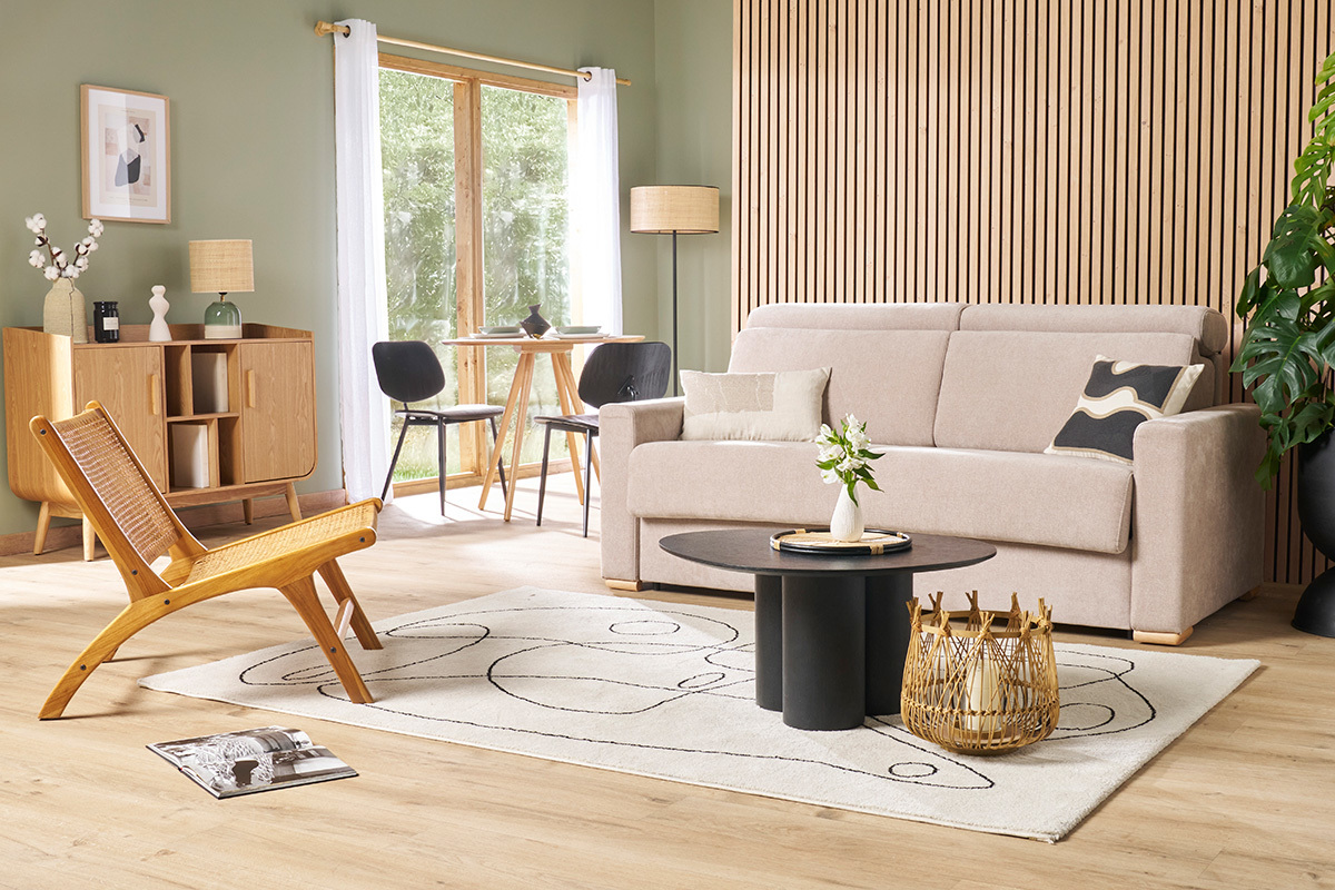 Le canapé convertible NORO allie avec brio confort et style. Optez pour des tables gigognes pour l'accompagner : faciles à déplacer, elles pourront servir de chevets la nuit.