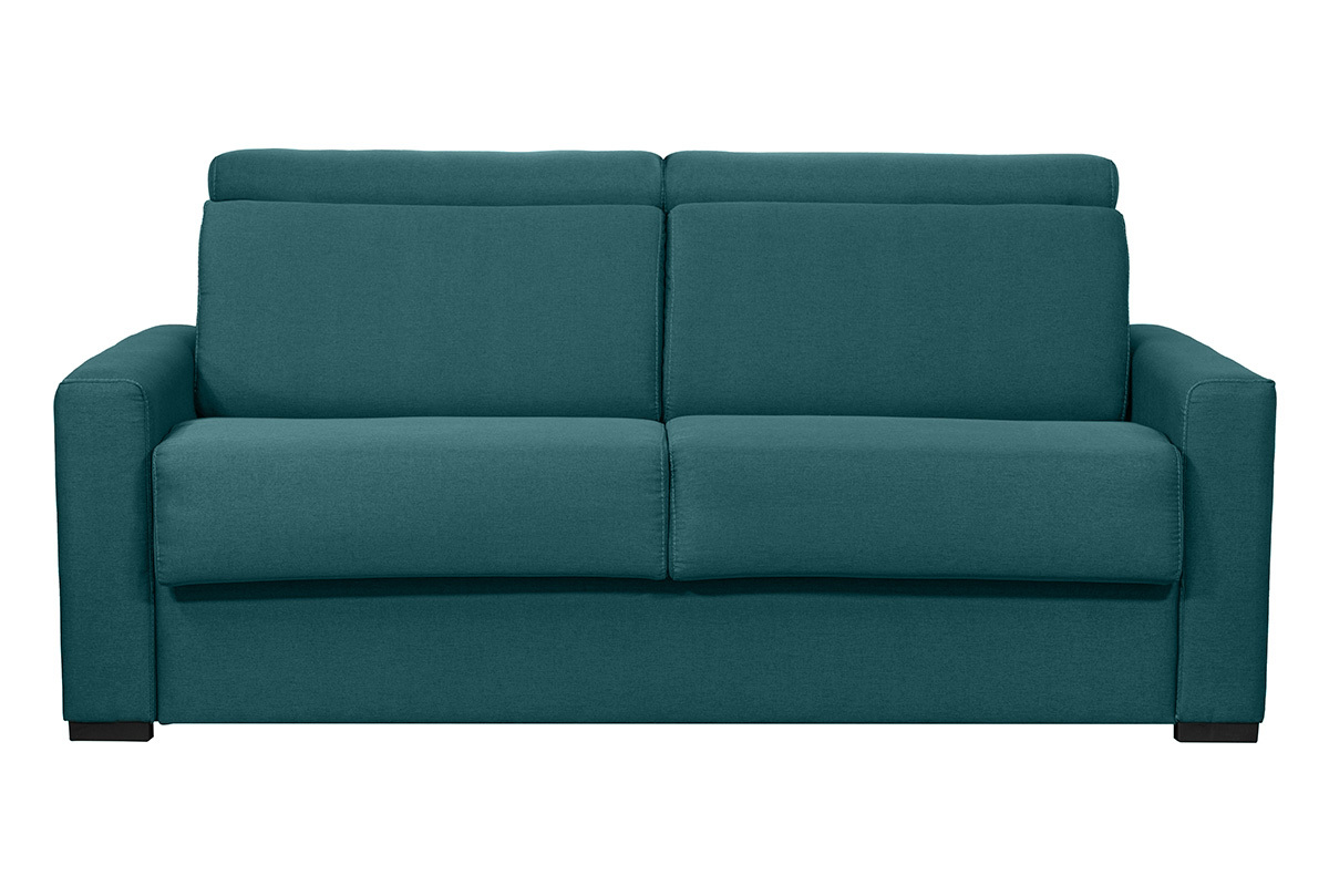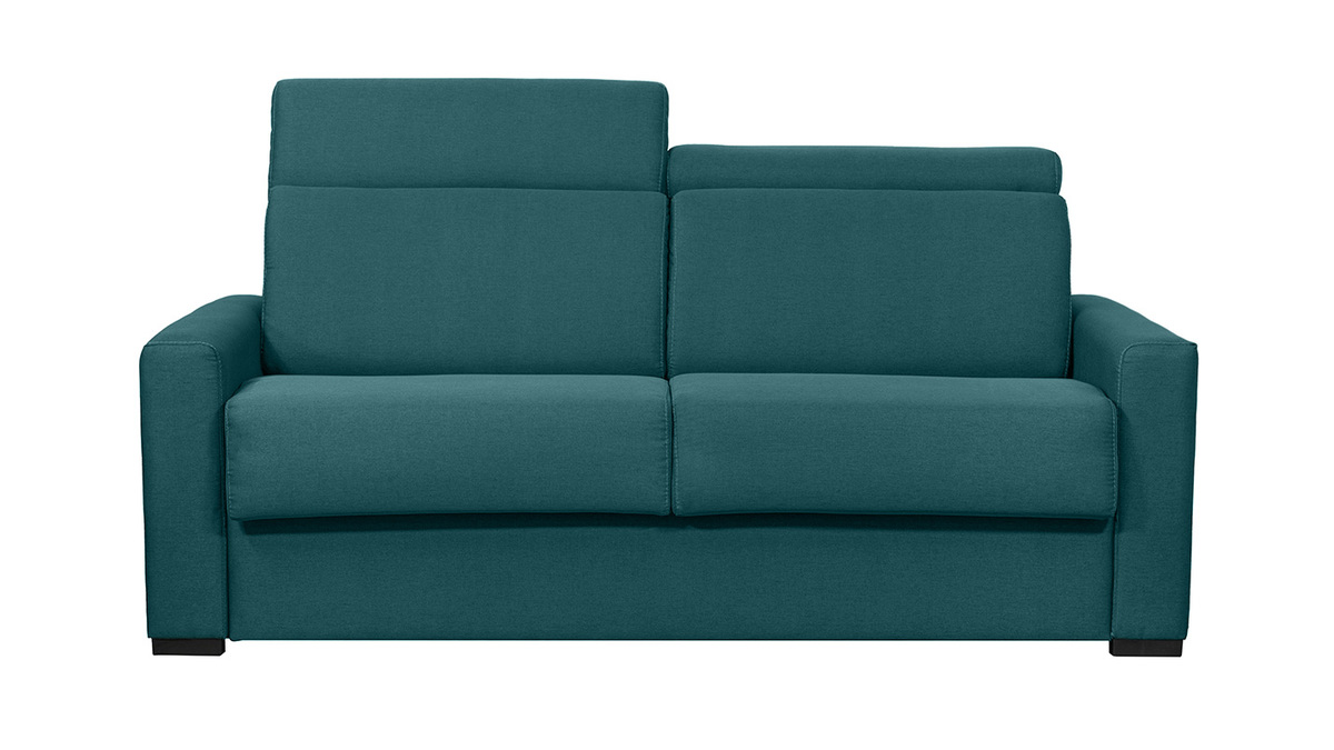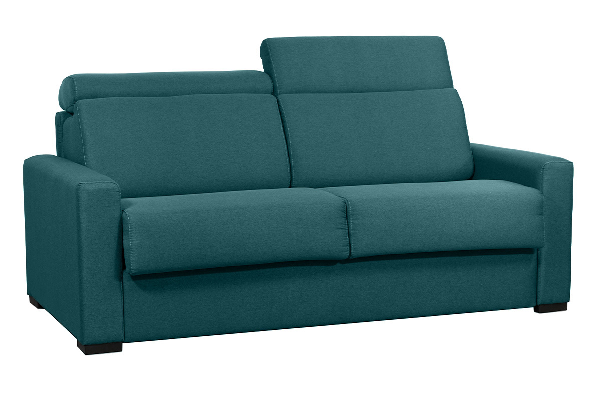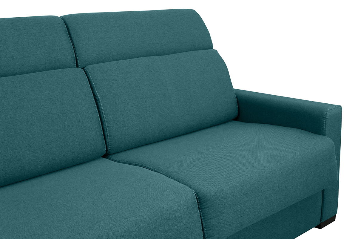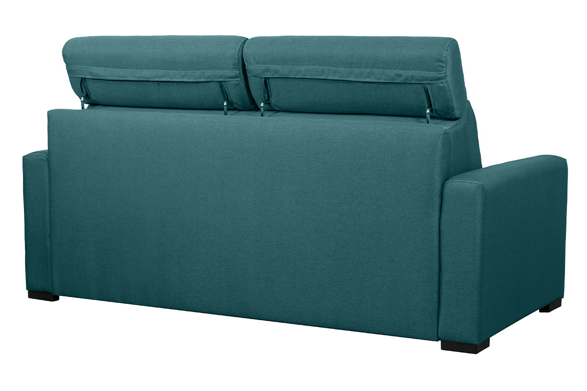 La nuit, ce canapé se transforme en lit. Grâce à son système express, pas besoin d'enlever de coussin : il suffit d'abaisser le dossier pour installer rapidement un coin nuit d'appoint équipé d'un couchage 140 x 190 cm. Avec son matelas de 18 cm d'épaisseur digne d'un vrai matelas 2 places et ses rangements intégrés dans le dossier, ce canapé-lit est l'indispensable des petits espaces et des nuits confortables.