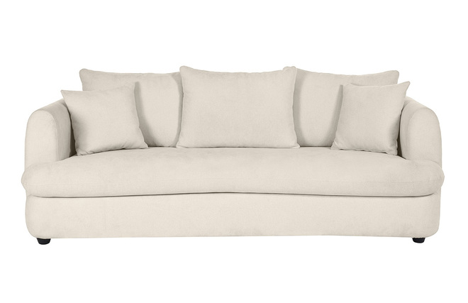Véritable éloge à la douceur, ce grand canapé 3-4 places beige clair s'habille d'un tissu effet velours. À la fois résistante et délicate au toucher, cette trame écrue sublime les volumes et appose une note d'élégance intemporelle à l'ensemble. Caractérisé par une large assise ferme (densité 28 kg/m³), galbé par 3 coussins de dossier (L68 x L50 x E22 cm) et 2 coussins d'appoint (L45 x L45 x E16 cm), ce canapé-lit beige invite naturellement à se lover sans retenue !