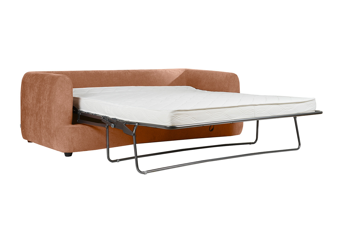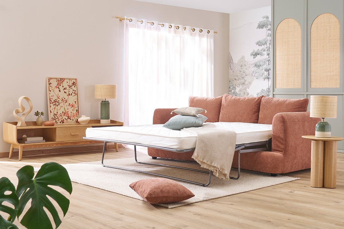 Optimisez votre aménagement ! Le canapé convertible terre brûlée SACHA formera un tandem évolutif à la pointe de la tendance avec une table basse relevable ou gigogne assortie.