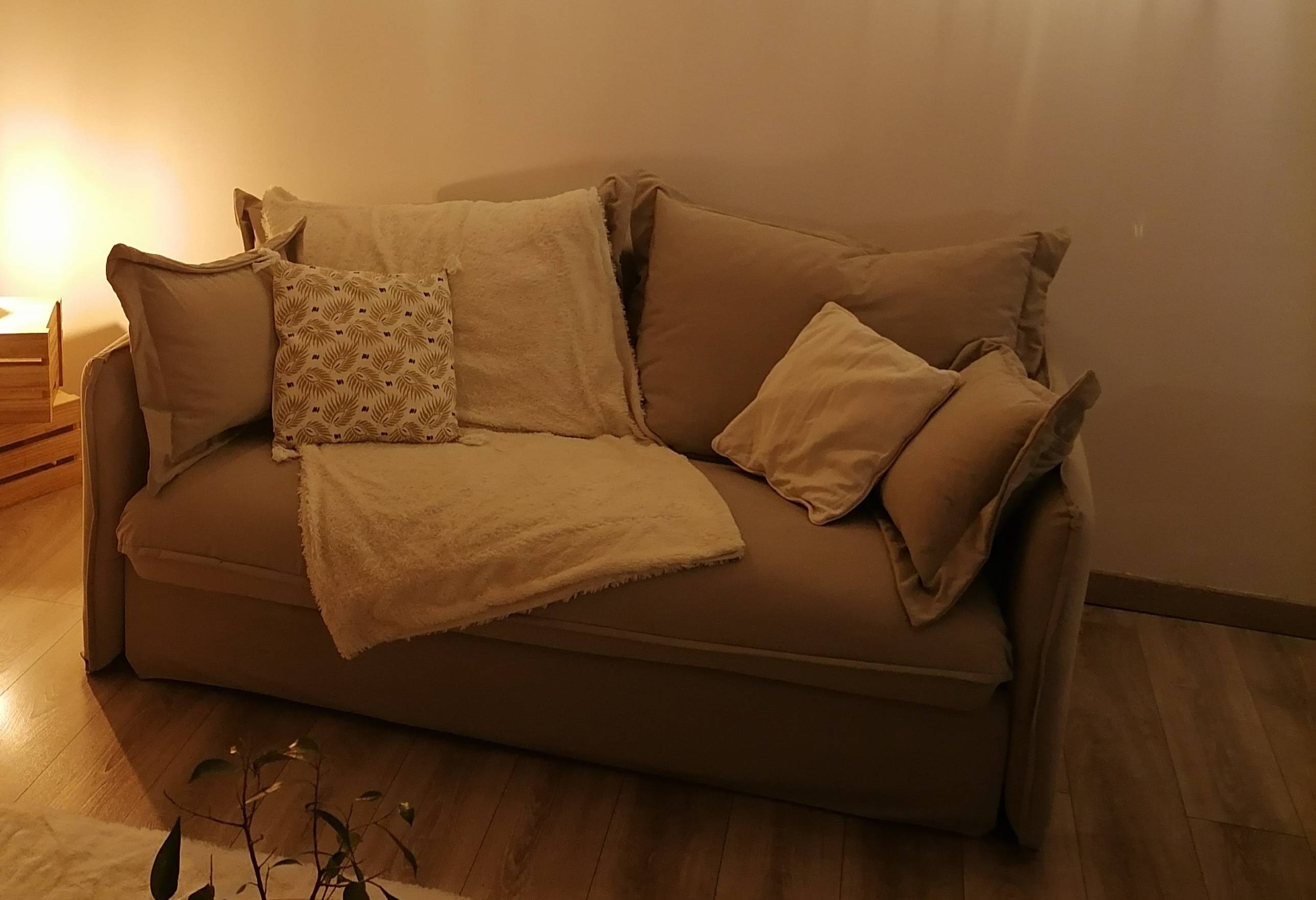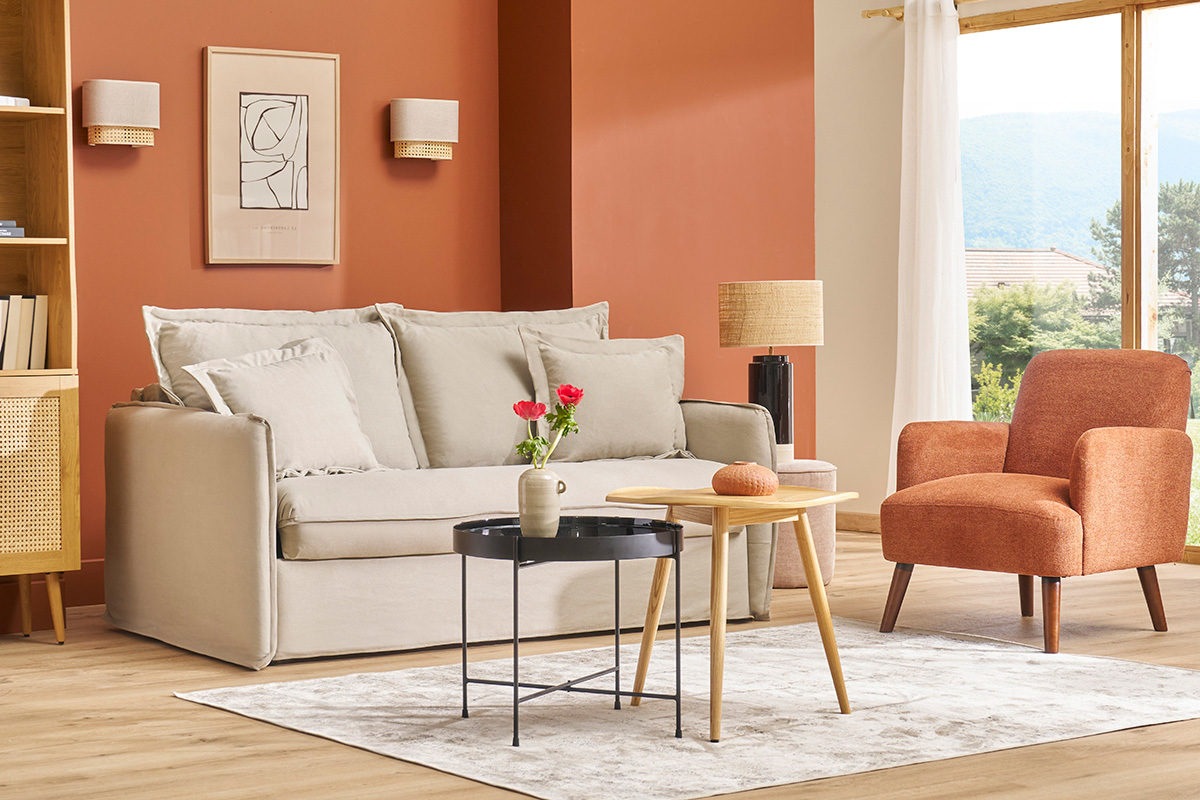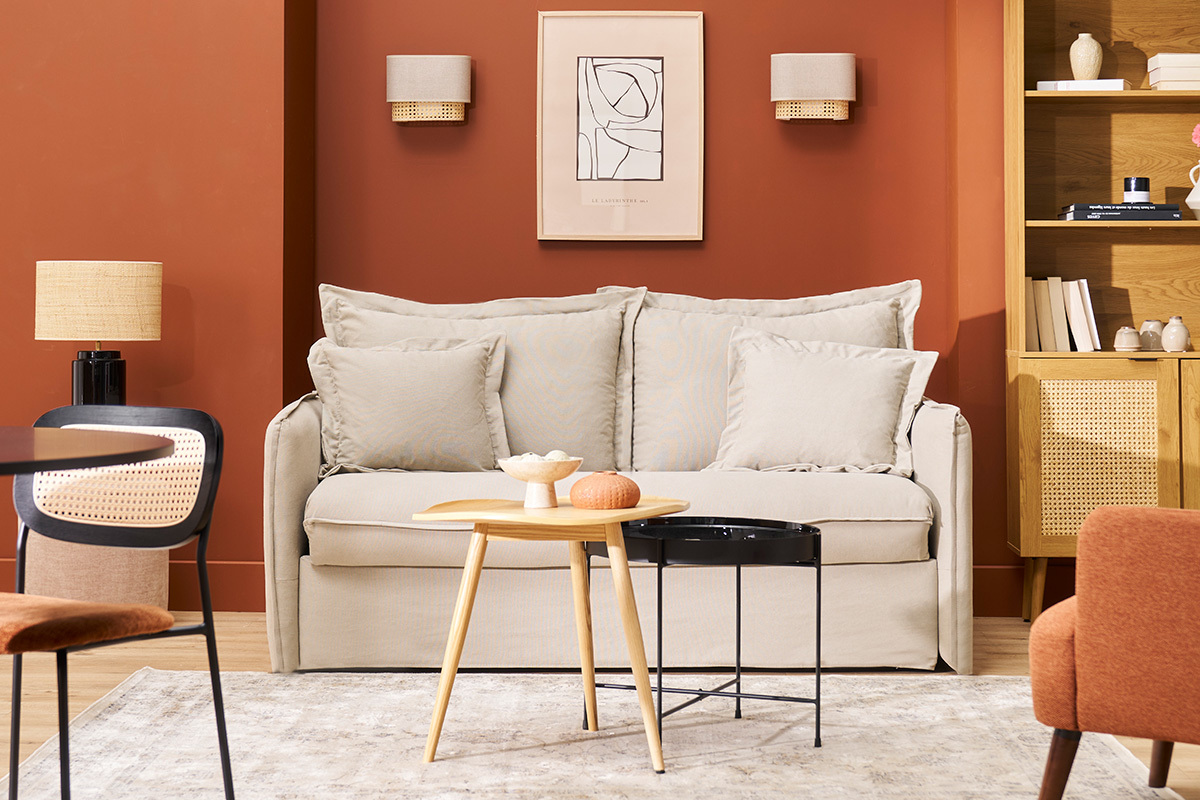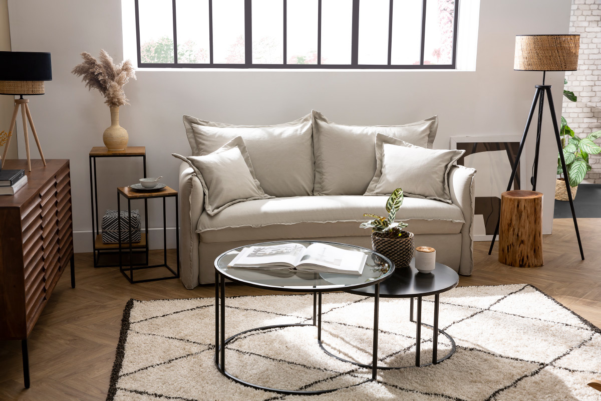 La campagne à la ville ! Avec le canapé lit ALDO, on retrouve l'authenticité et le charme du style maison de campagne dans un canapé compact et fonctionnel adapté aux petits espaces.