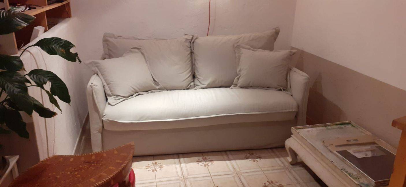 Bon état. Le canapé présente quelques défauts de coutures. Une tache est sur l'angle avant du canapé (en bas). Photos sur demande.