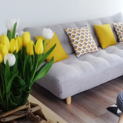 On se crée un véritable espace cocooning avec le canapé convertible gris et chêne YUMI !